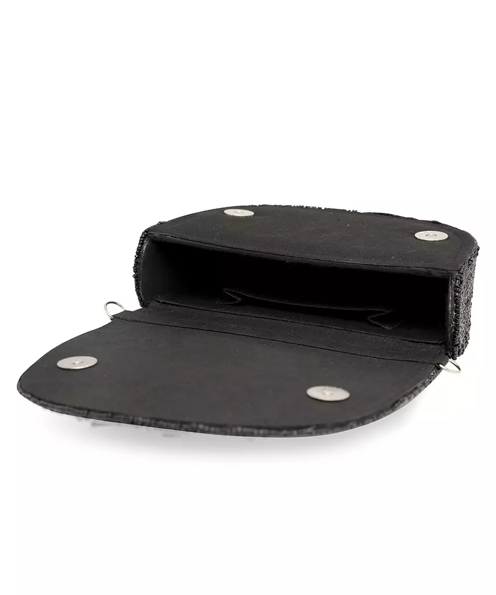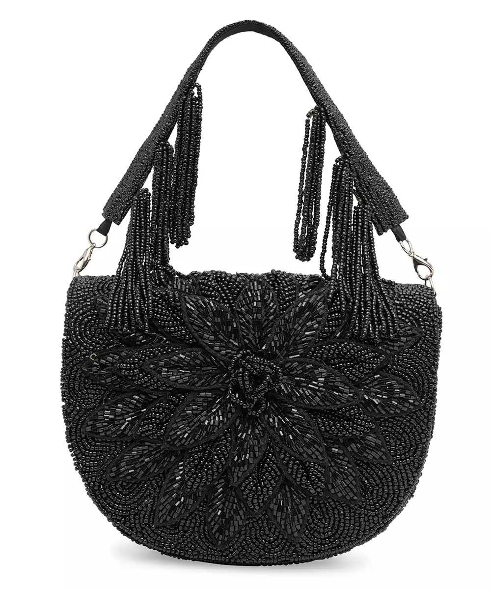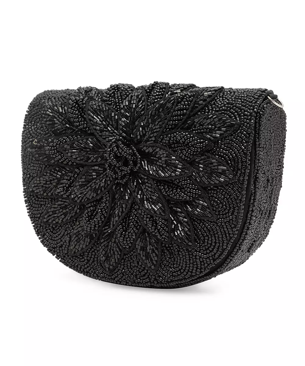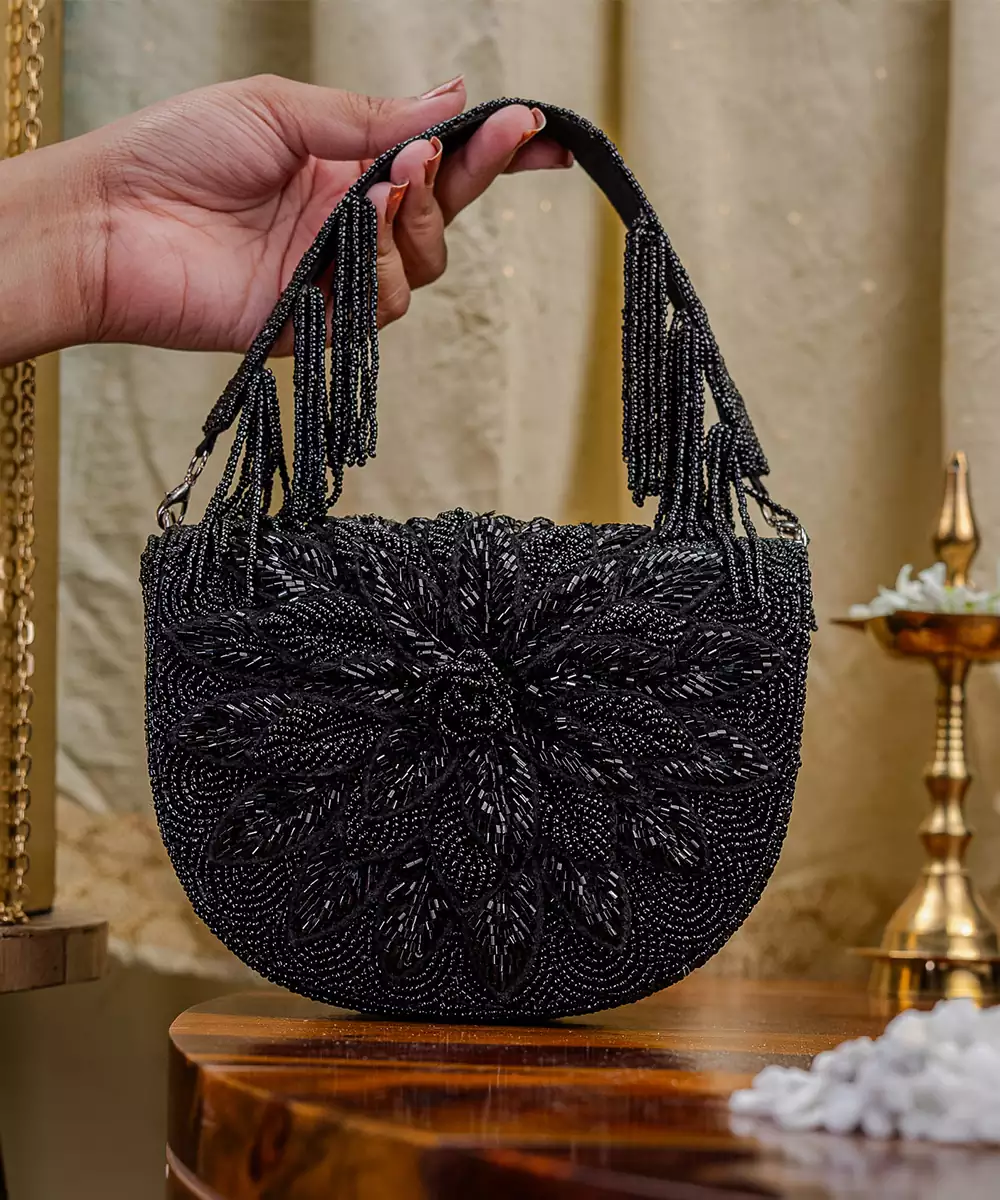 Elegant Black Silk Base With Intricate Bead Embroidery And Tonal Embellishments. Foldover Silhouette With Button Closure And Wrist Loop For Graceful Carrying. One Main Compartment To Hold Essentials—Lipstick, Cards, Keys. Perfect For Bridal Trousseau, Festive Gifting, Or Evening Wear. Style Note: Pair With Black Sarees, Gold Lehengas, Or Sequin Gowns For A Timeless Glam Finish.