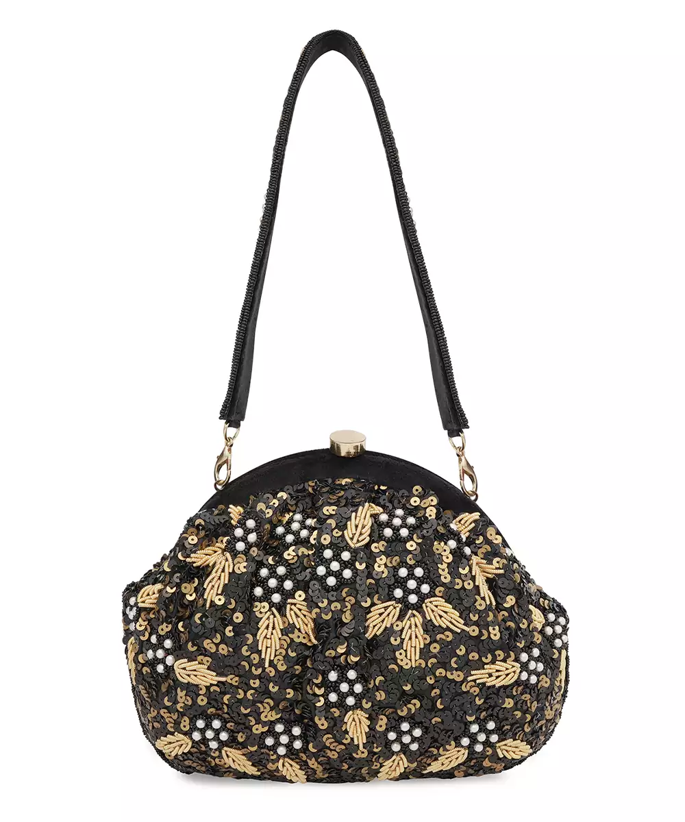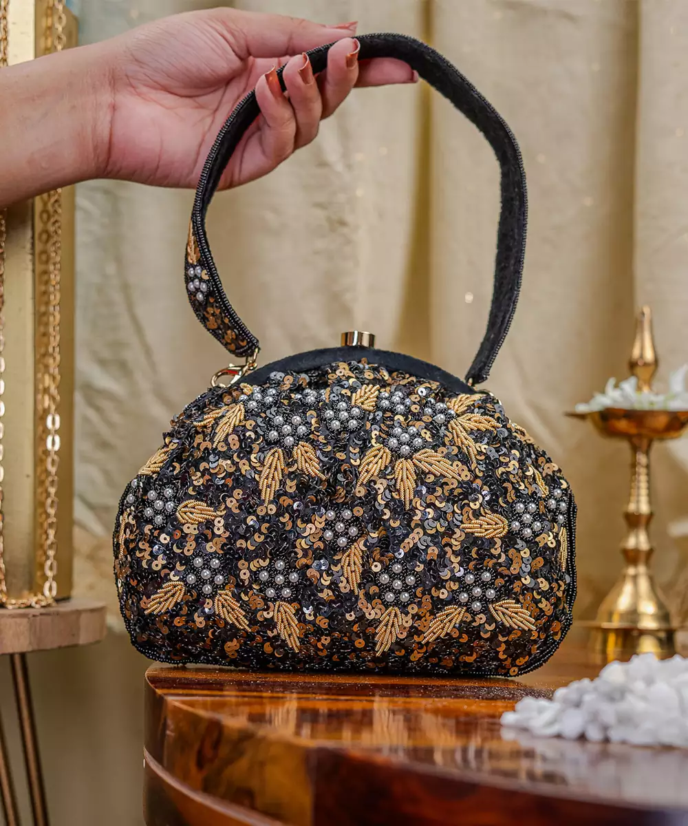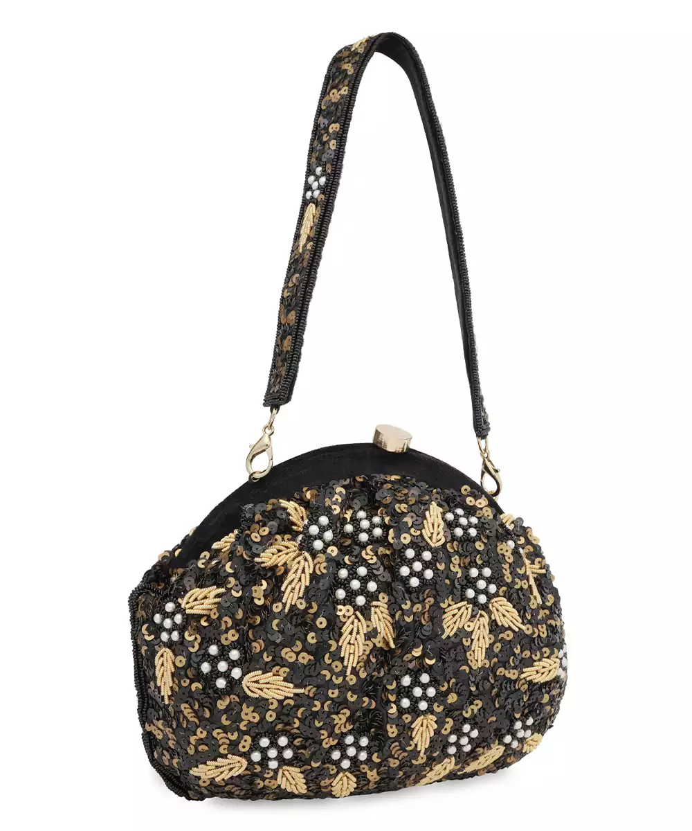 Elegant Half Moon Silhouette In Black With Intricate Gold Toned Embroidery And Bead Embellishments. Comes With A Detachable Shoulder Strap For Versatile Styling—Handheld Or Crossbody. One Main Compartment Secured With A Twist Lock Closure To Keep Essentials Safe. Perfect For Bridal Trousseau, Festive Gifting, Or Evening Wear. Style Note: Pair With Black Sarees, Gold Lehengas, Or Velvet Gowns...