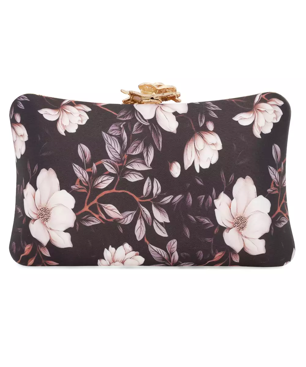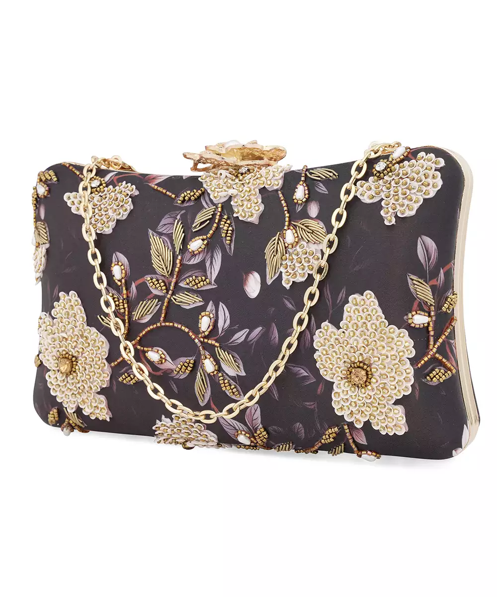 Sophisticated Box Clutch In Black Base, Adorned With Rich Gold Toned Floral Embroidery. Detachable Shoulder Strap Adds Styling Flexibility And Hands Free Ease. Twist Lock Closure Secures One Spacious Main Compartment For Essentials. Ideal For Formal Soirées, Cocktail Nights, Or Festive Events. Style Note: Pair It With Structured Drapes Or A Sharp Indo Western Set For A Luxe Botanical Vibe.