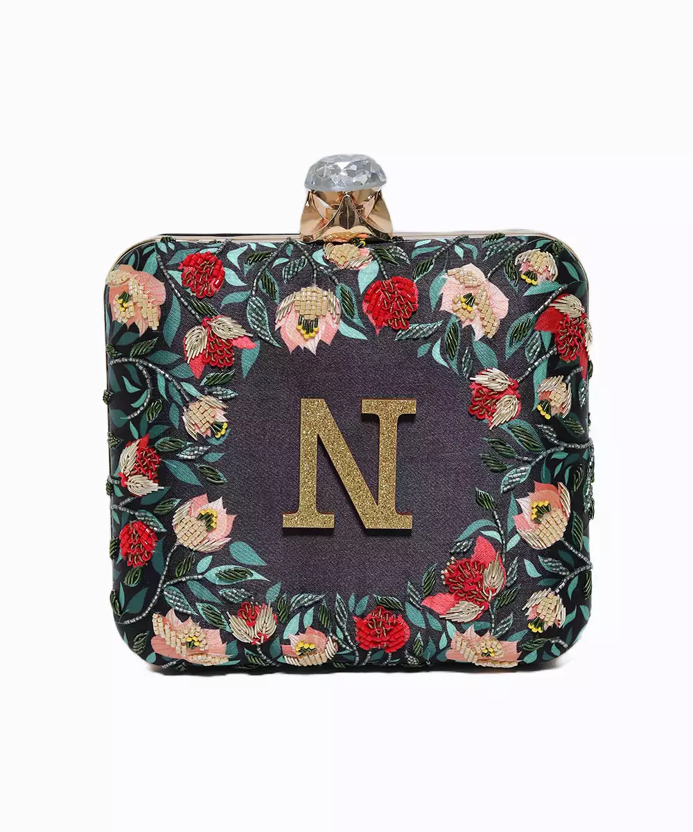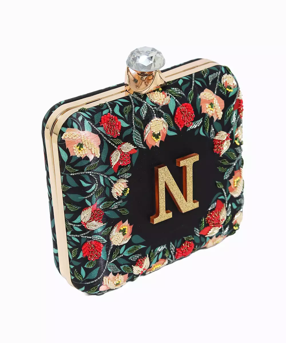 Showcases Vibrant Black, Green, And Red Floral Printed Back With Elegant Embroidered Detailing On The Front Panel. Features A Standout Alphabet 'n' Motif For Personalized Expression. Structured Box Silhouette With Click Closure Secures Essentials Stylishly. Comes With A Shoulder Strap For Comfortable Crossbody Or Handheld Carry. A Festive Pick For Events, Gifting, Or Personalized Fashion...