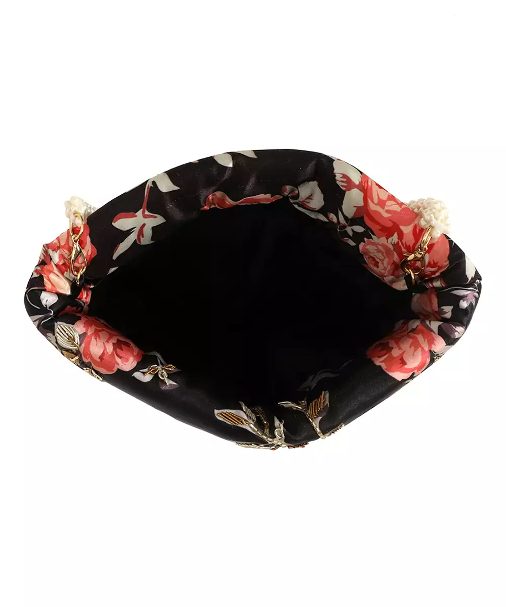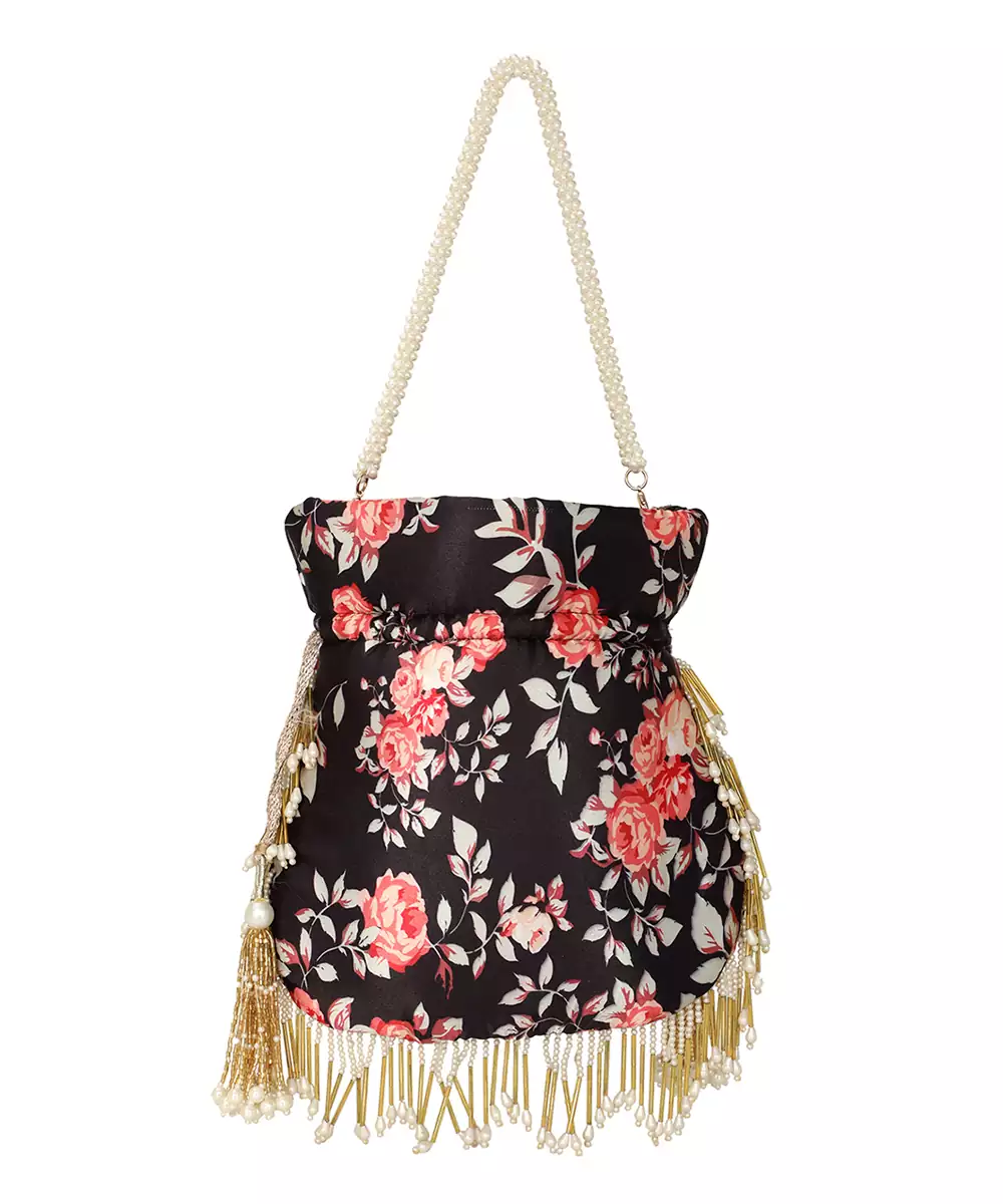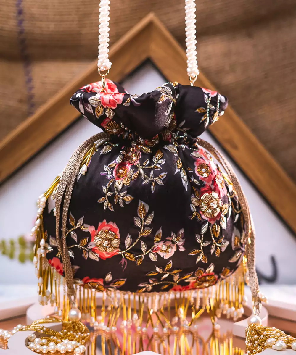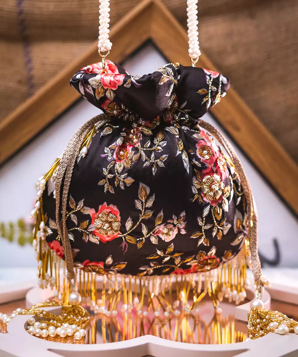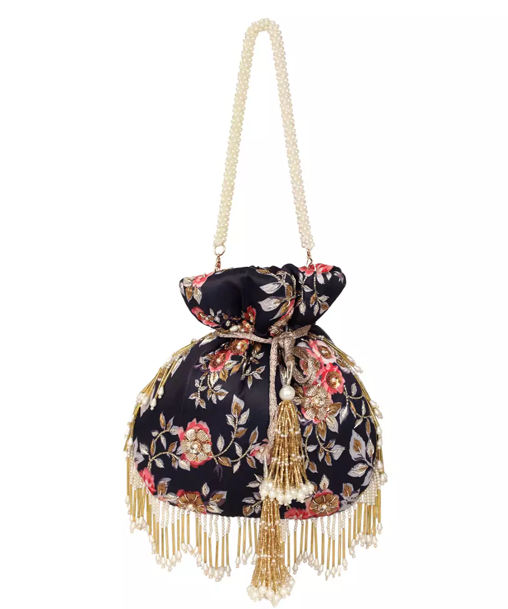 Black Potli Clutch Featuring Elegant Floral Print Embroidery. Adorned With Shimmering Gold Tassels For Added Drama. Comes With A Comfortable Wrist Loop For Effortless Carry. Secured By A Classic Drawstring Closure Over One Spacious Compartment. Style Note: Style With Embroidered Black Ensembles Or Golden Lehengas To Echo The Clutch’s Artisanal Edge.