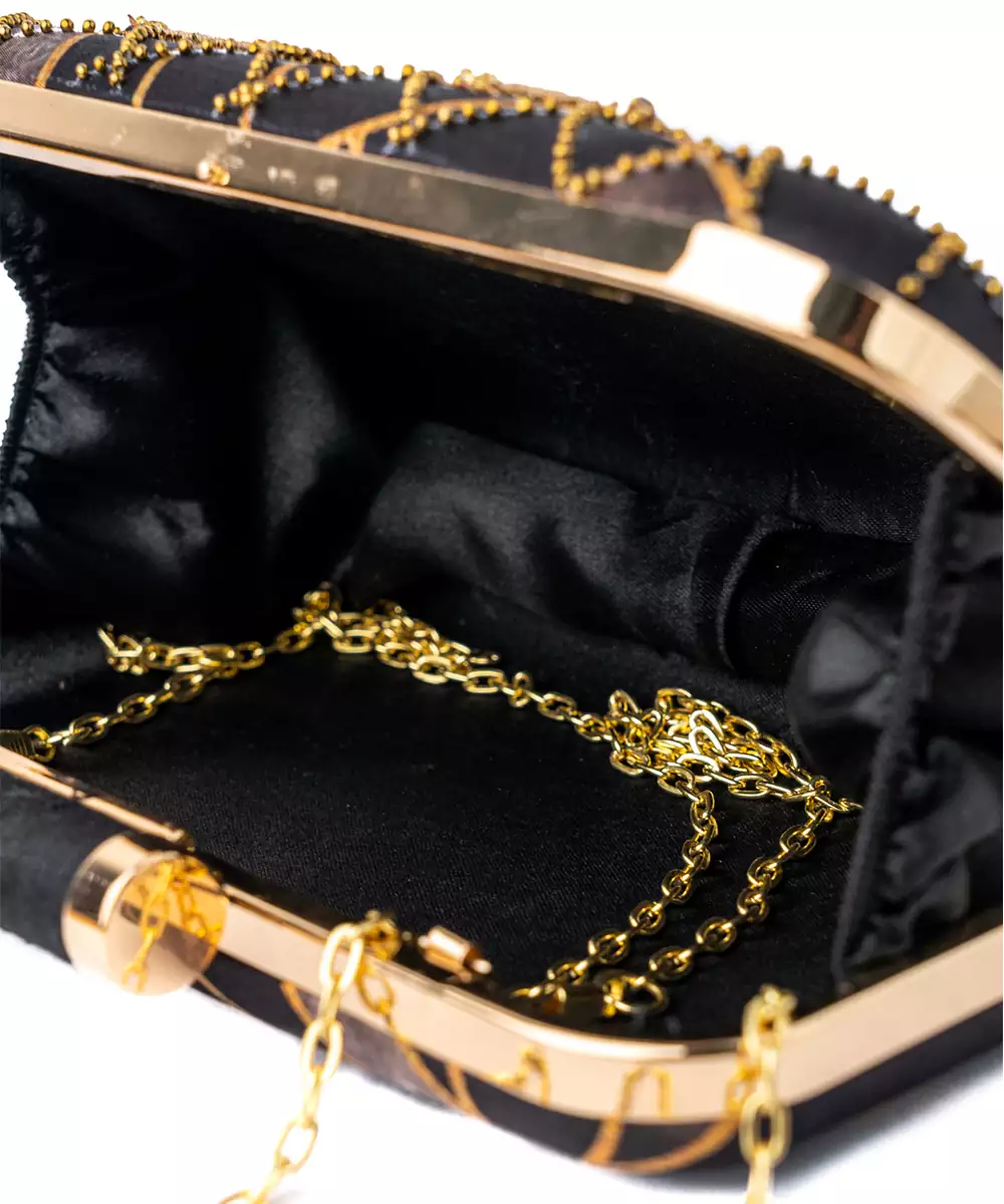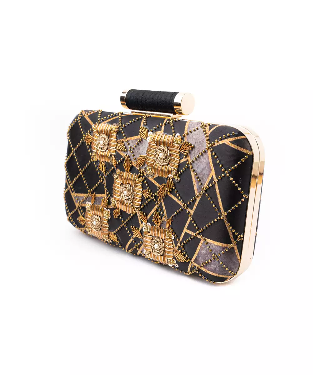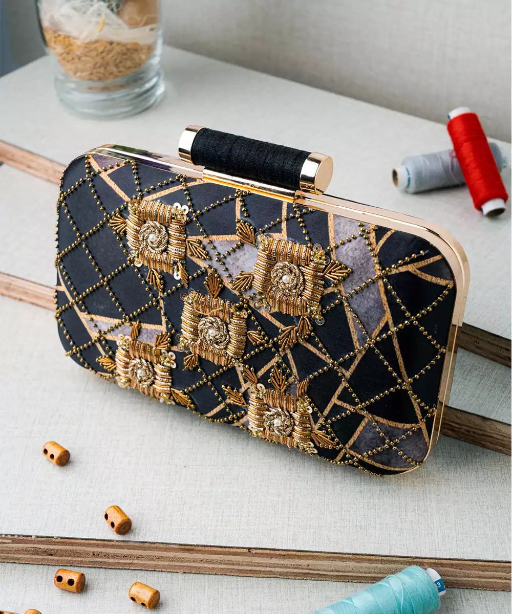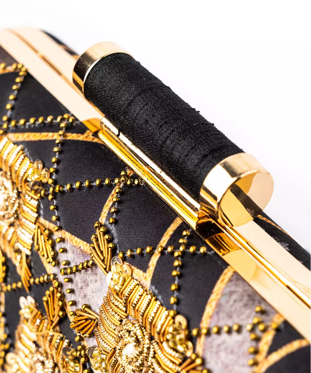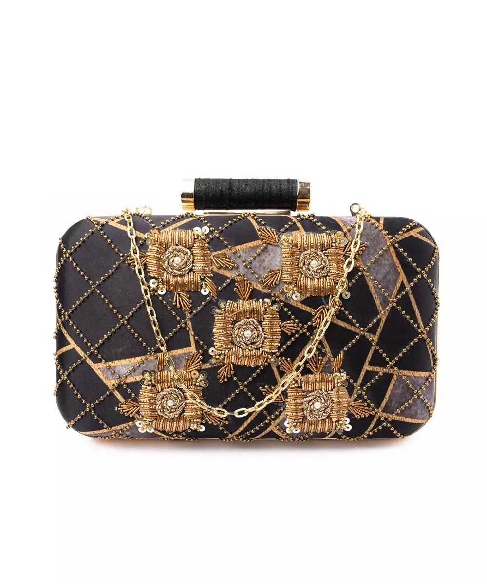 Luxe Box Silhouette With Intricate Embroidery In Black, Grey, And Gold Tones. Embellished Surface Adds A Regal Shimmer To Evening Ensembles. Comes With A Detachable Shoulder Strap For Hands Free Styling. One Main Compartment Secured With A Twist Lock Closure. Style Note: Pair With Metallic Sarees Or Monochrome Gowns For A Bold, Statement Finish.