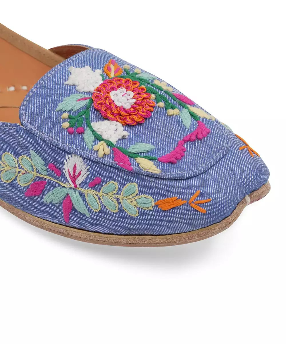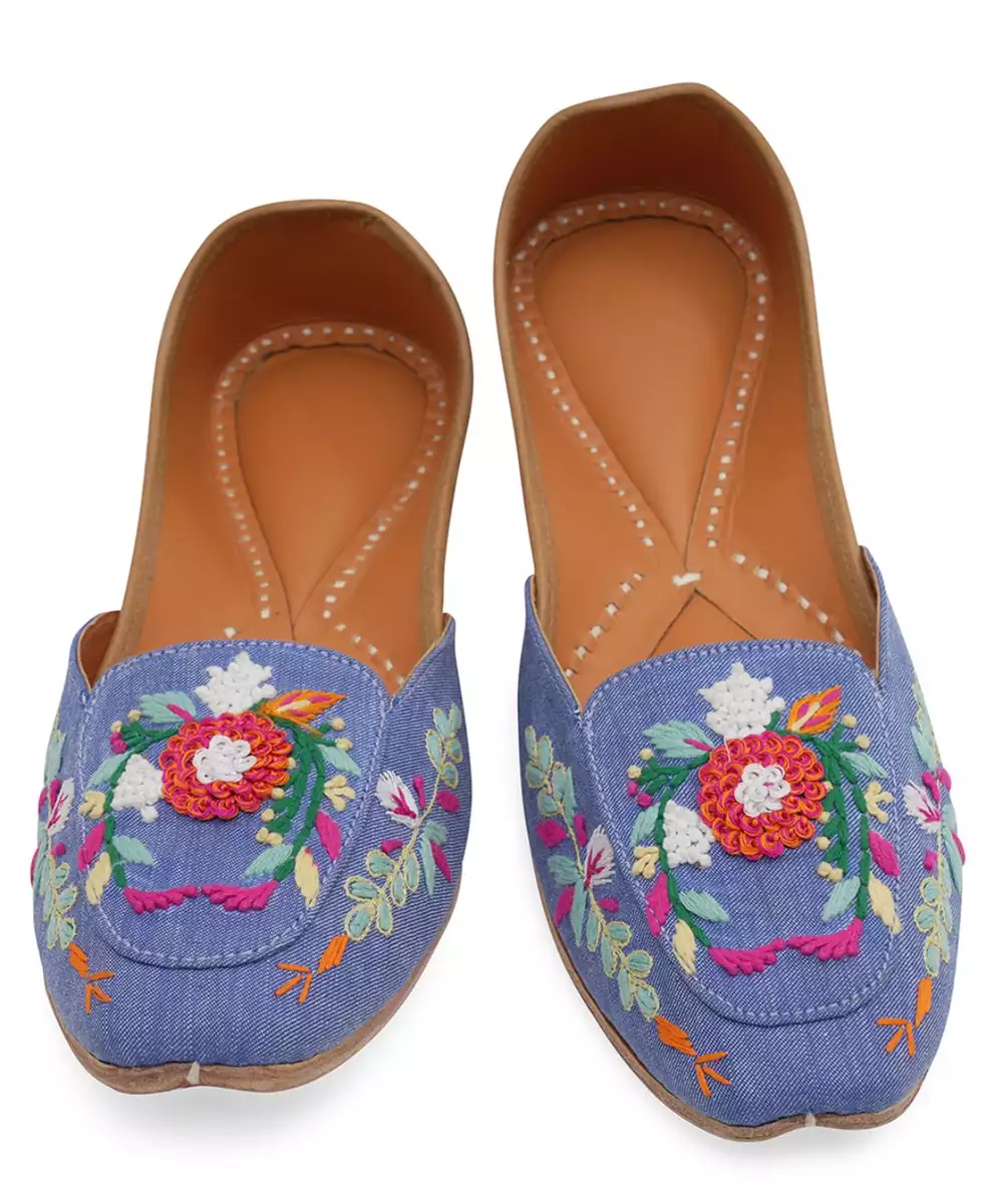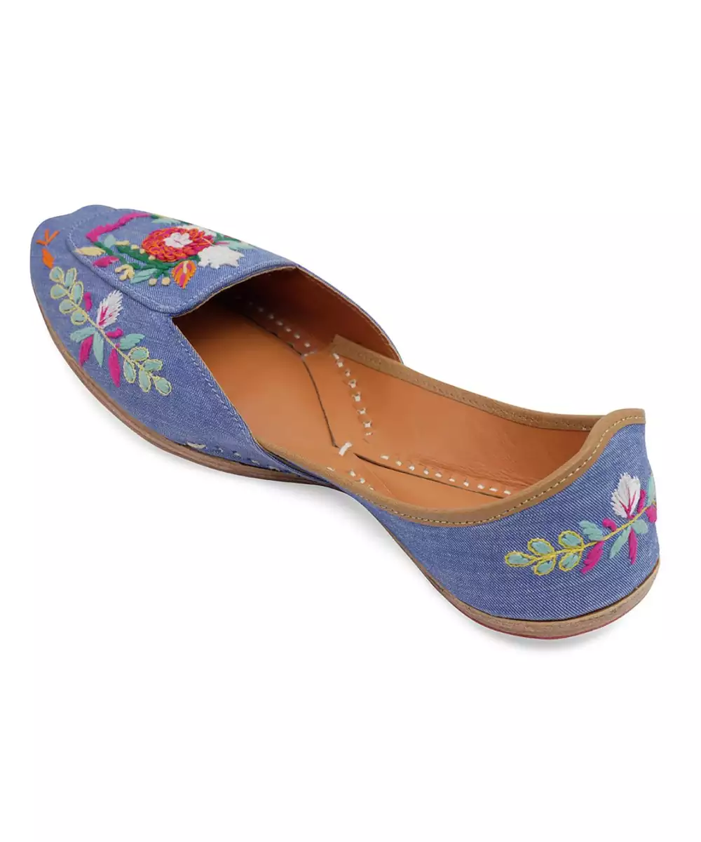 These Blue Embroidered Leather Mojaris Are A Perfect Blend Of Tradition And Elegance. Handcrafted From Premium Leather, They Feature Delicate Embroidery That Adds A Touch Of Sophistication. Comfortable And Stylish, They Pair Beautifully With Ethnic And Festive Outfits, Making Them An Ideal Choice For Weddings, Celebrations, And Special Occasions.