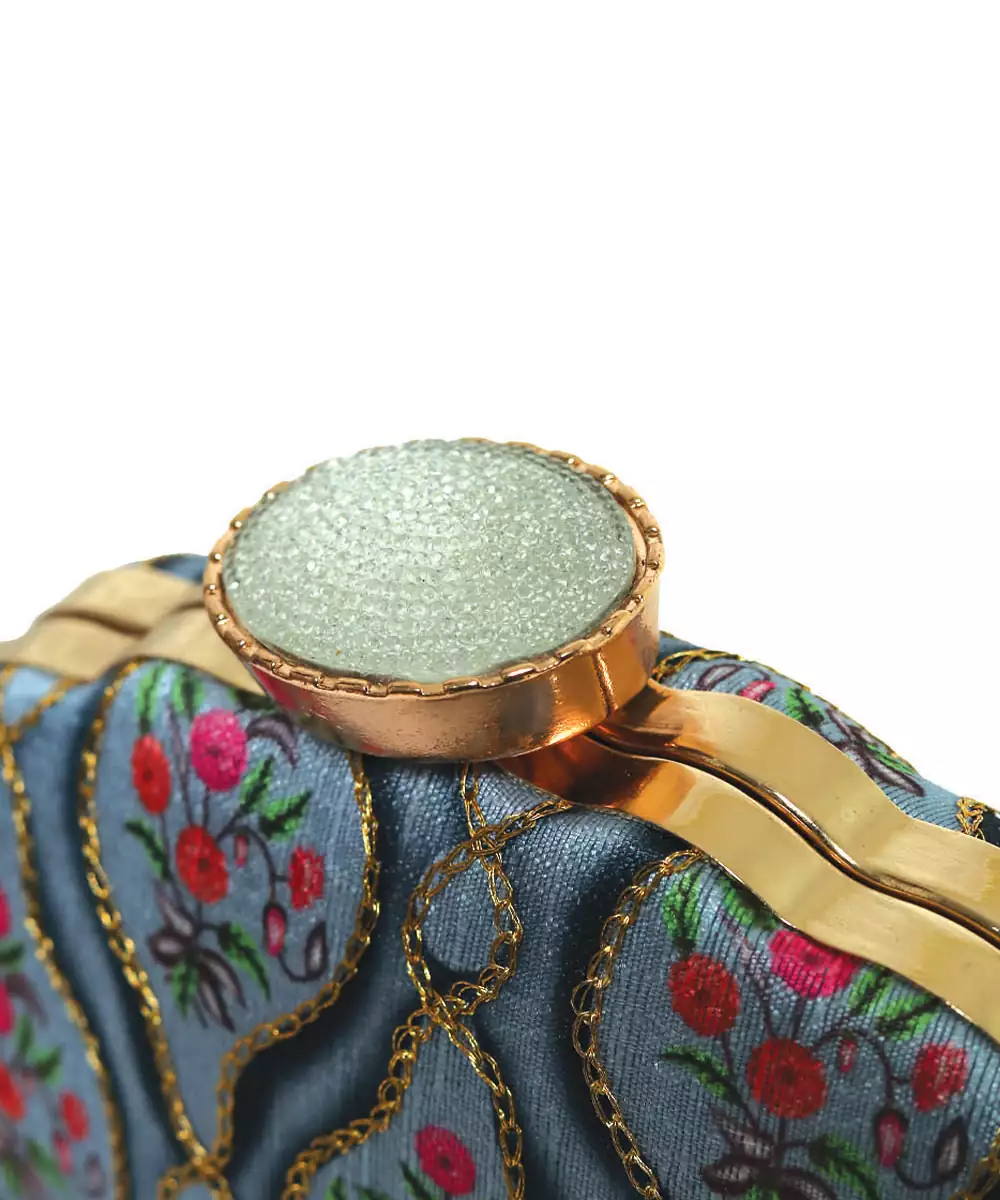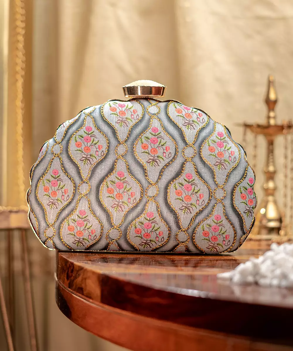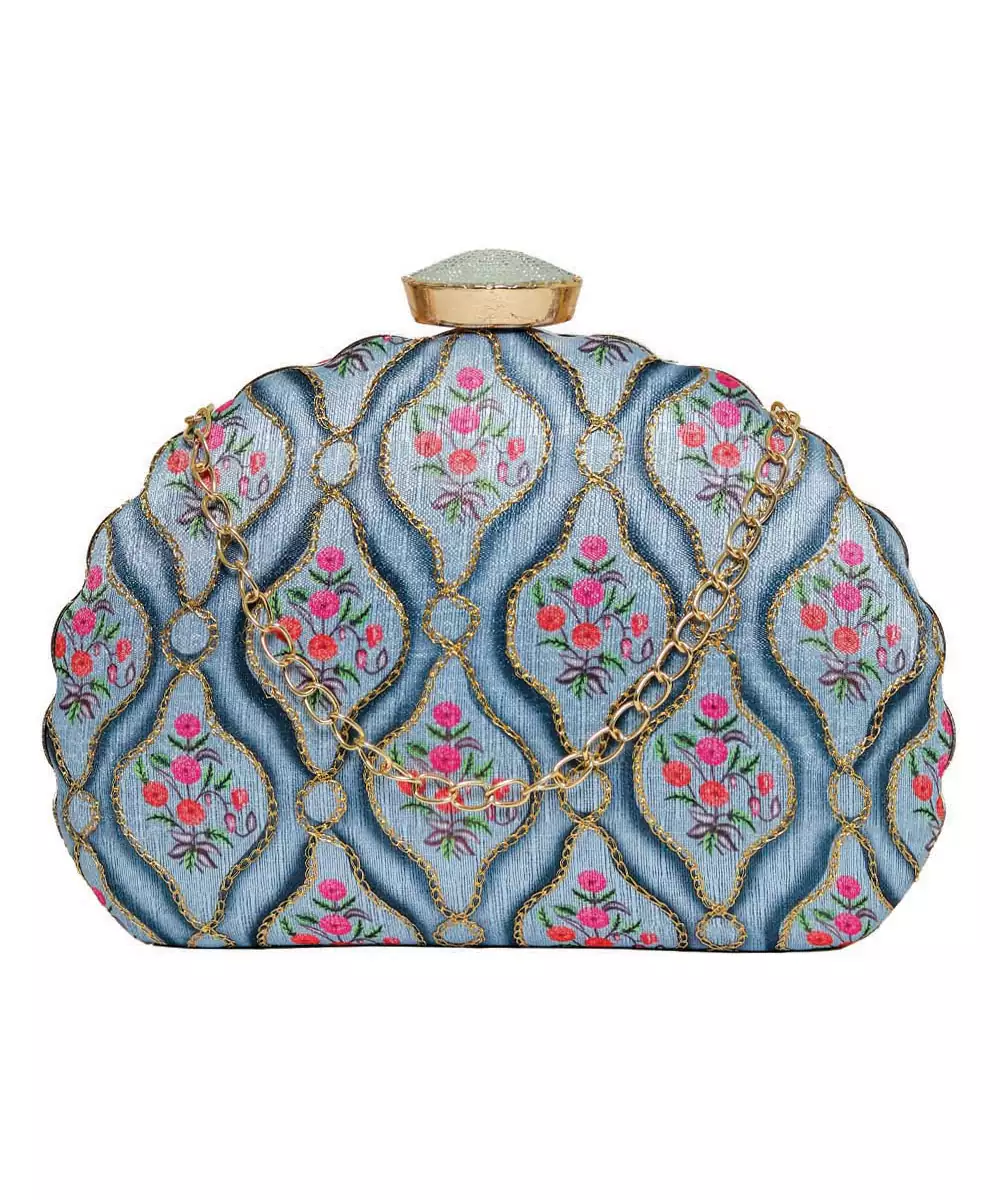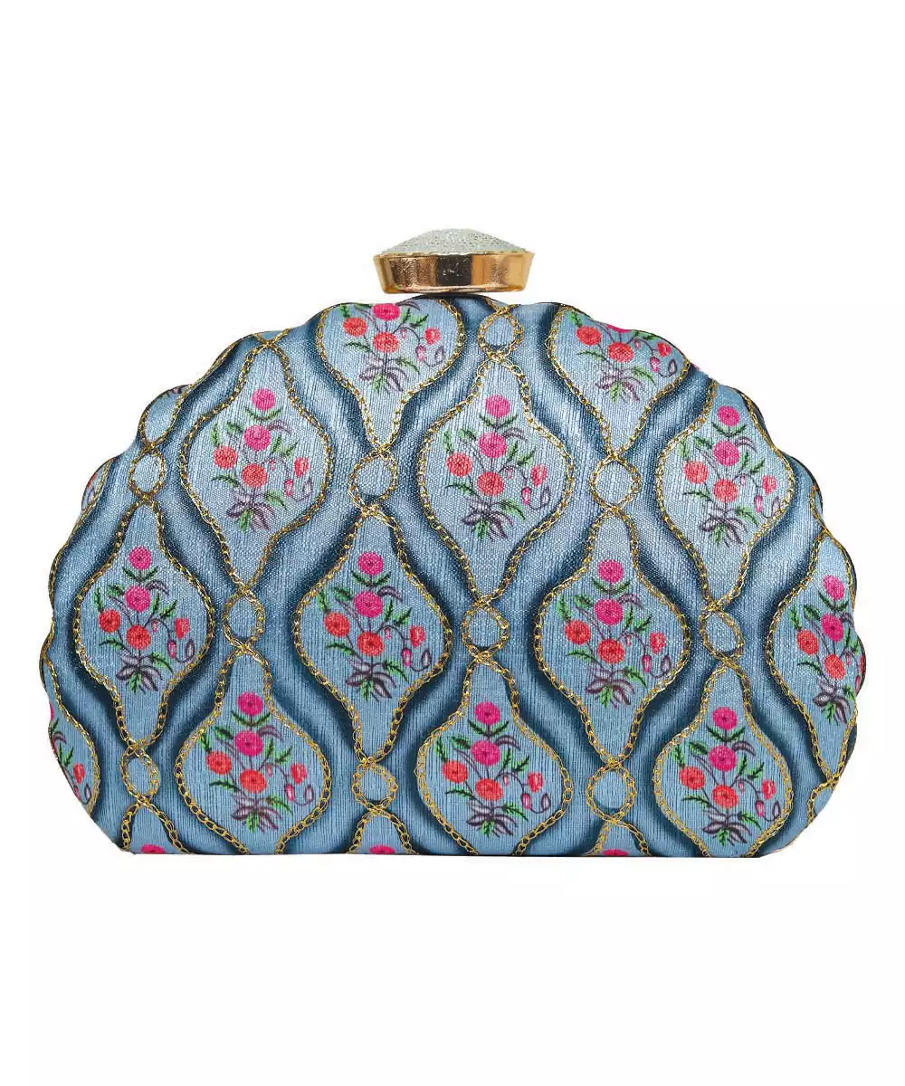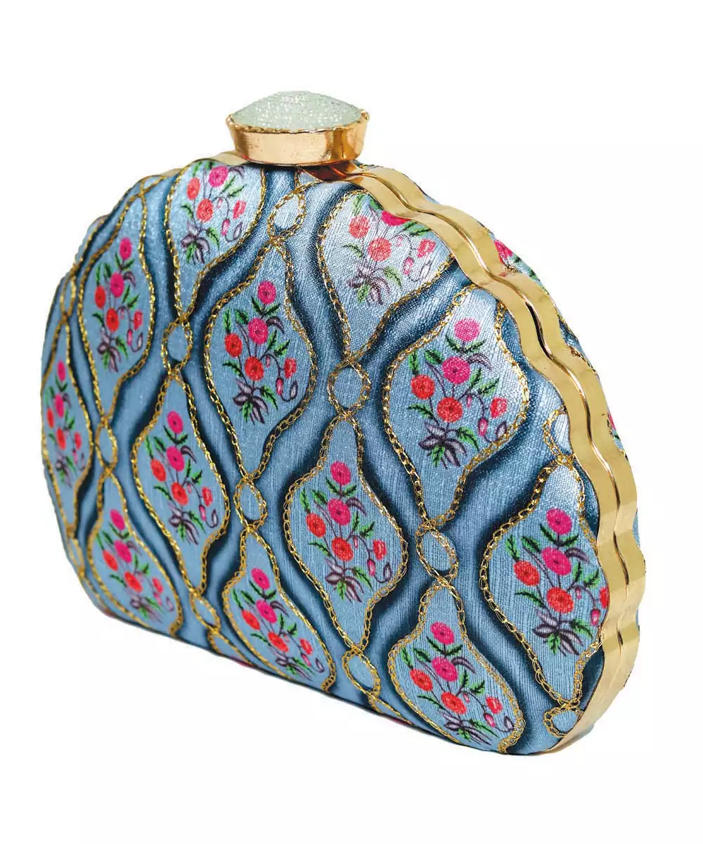 Elegant Box Clutch In Vibrant Blue With Blush Pink Floral Print. Features A Detachable Shoulder Strap For Hands Free Ease. Secured With A Metallic Twist Lock Closure On Top. Compact Design With A Single Main Compartment For Essentials. Style Note: Pair It With Pastel Lehengas Or Breezy Shararas For A Playful, Brunch Ready Vibe.
