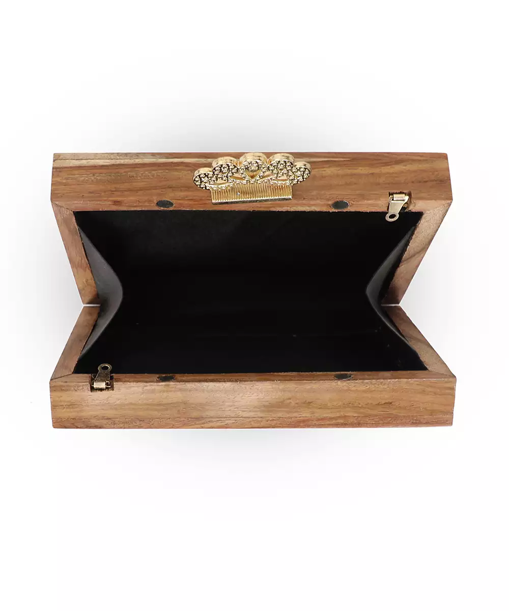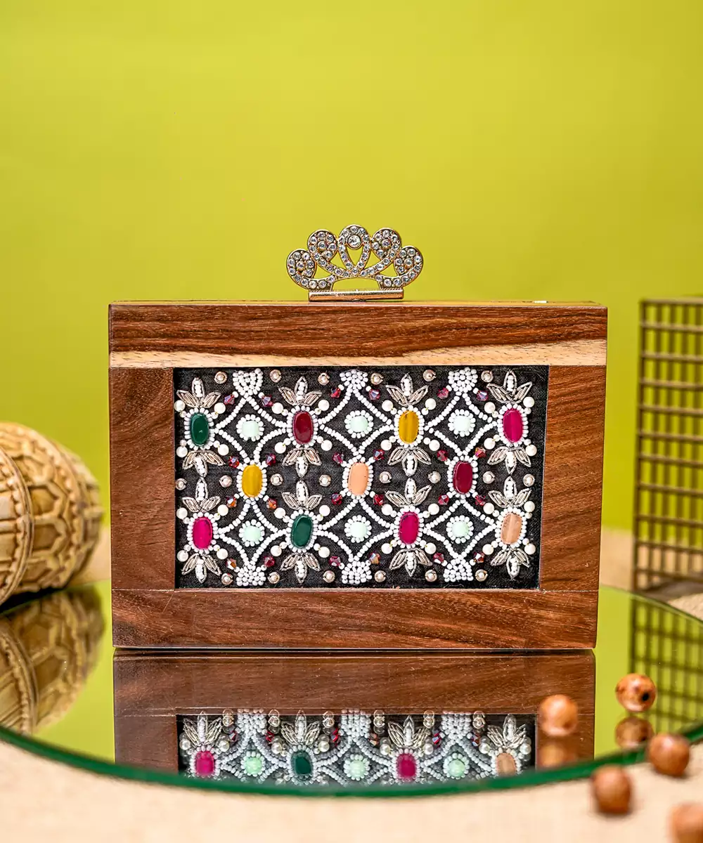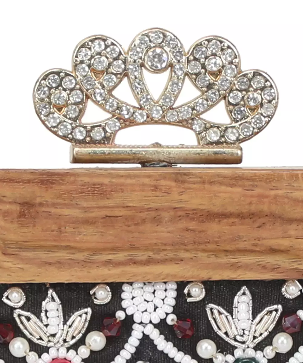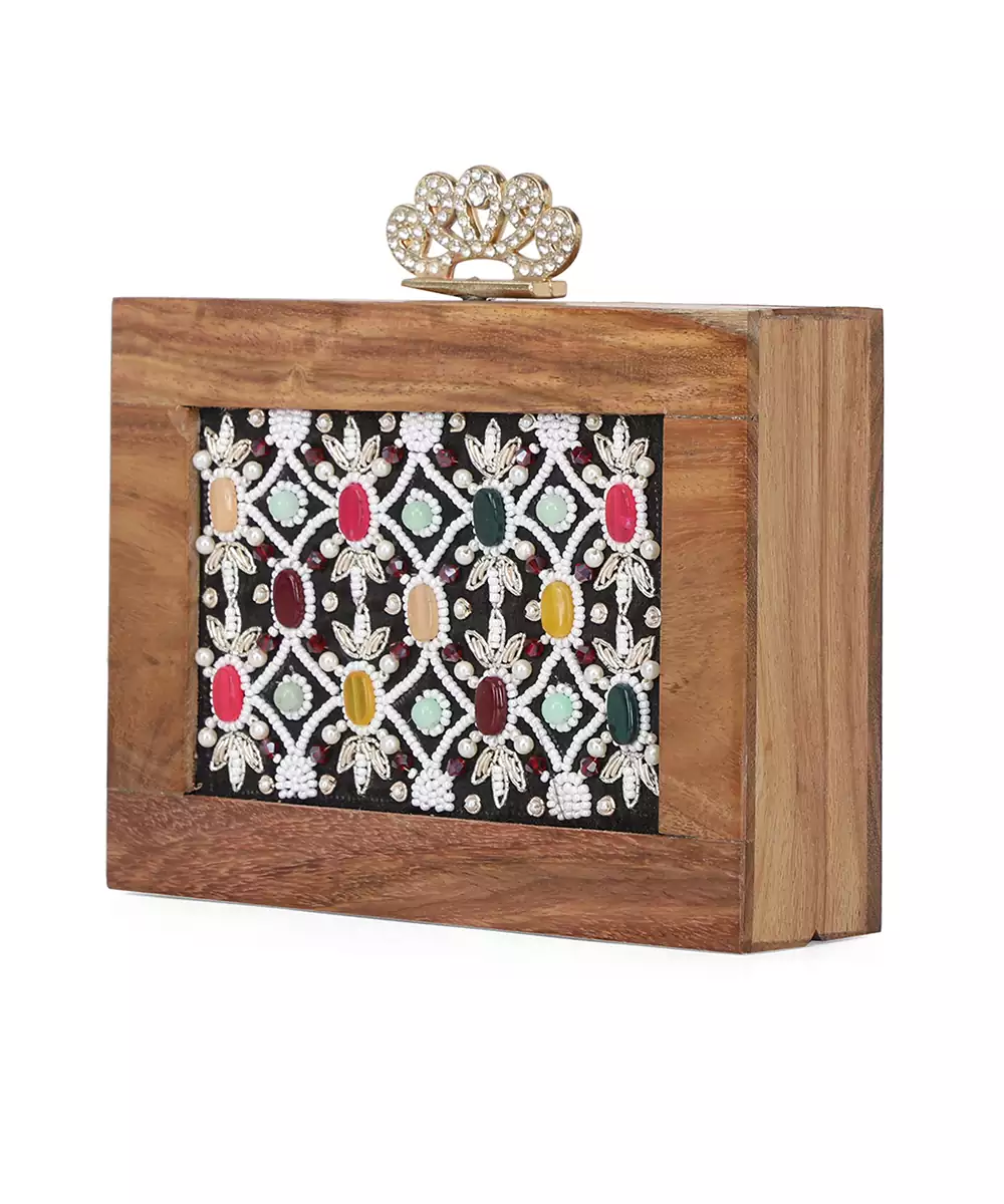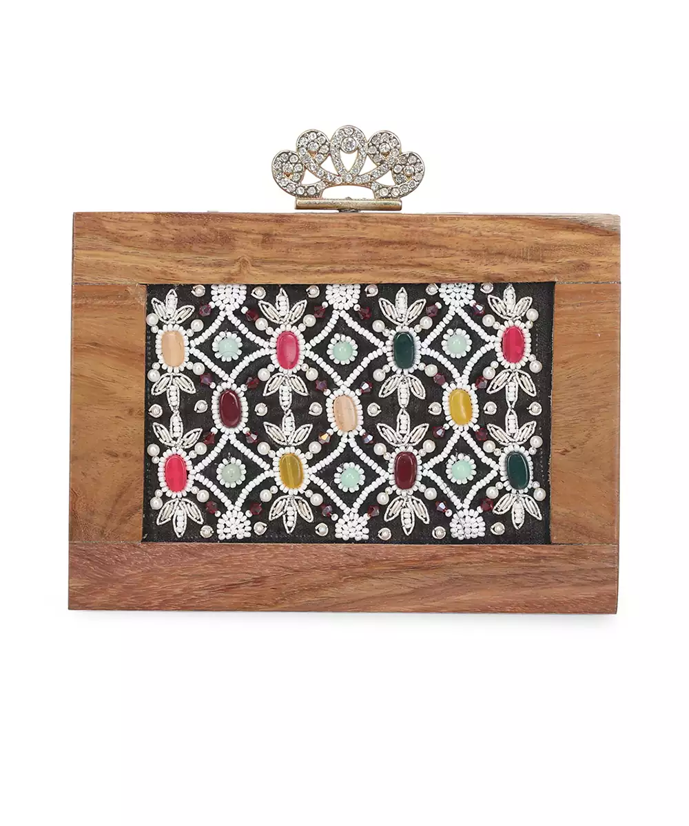 Box Clutch Crafted From Dark Wood With Black Accents And Multicolored Embroidery. Comes With A Detachable Shoulder Strap For Easy Styling. Click Lock Closure Secures Your Essentials In The Main Compartment. Rich Textures And Vibrant Detailing Make It A Standout Accessory. Style Note: Pair With Earthy Toned Sarees Or Statement Fusion Wear To Echo Its Handcrafted Flair.