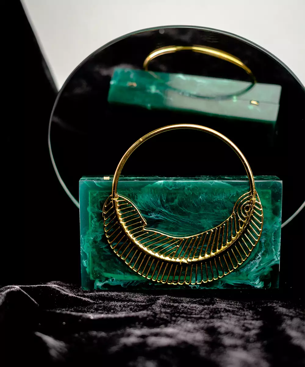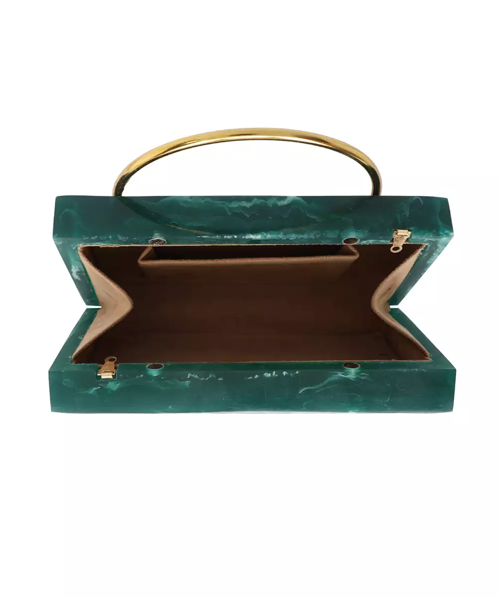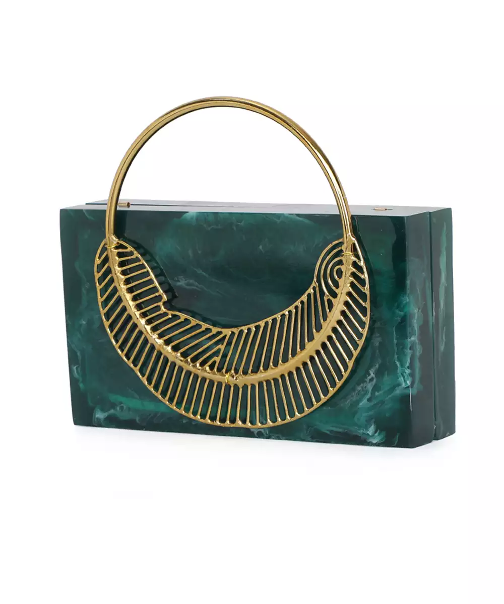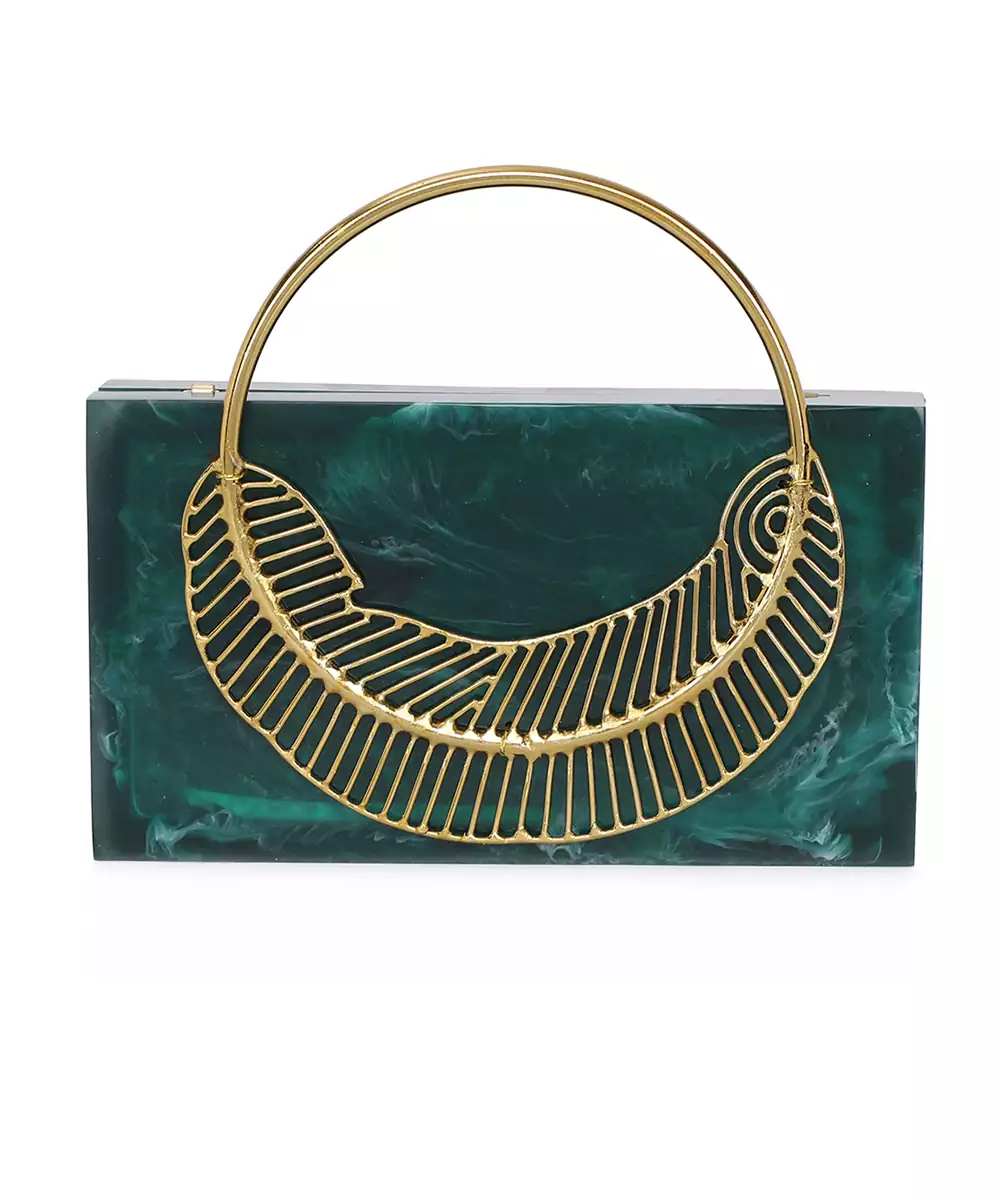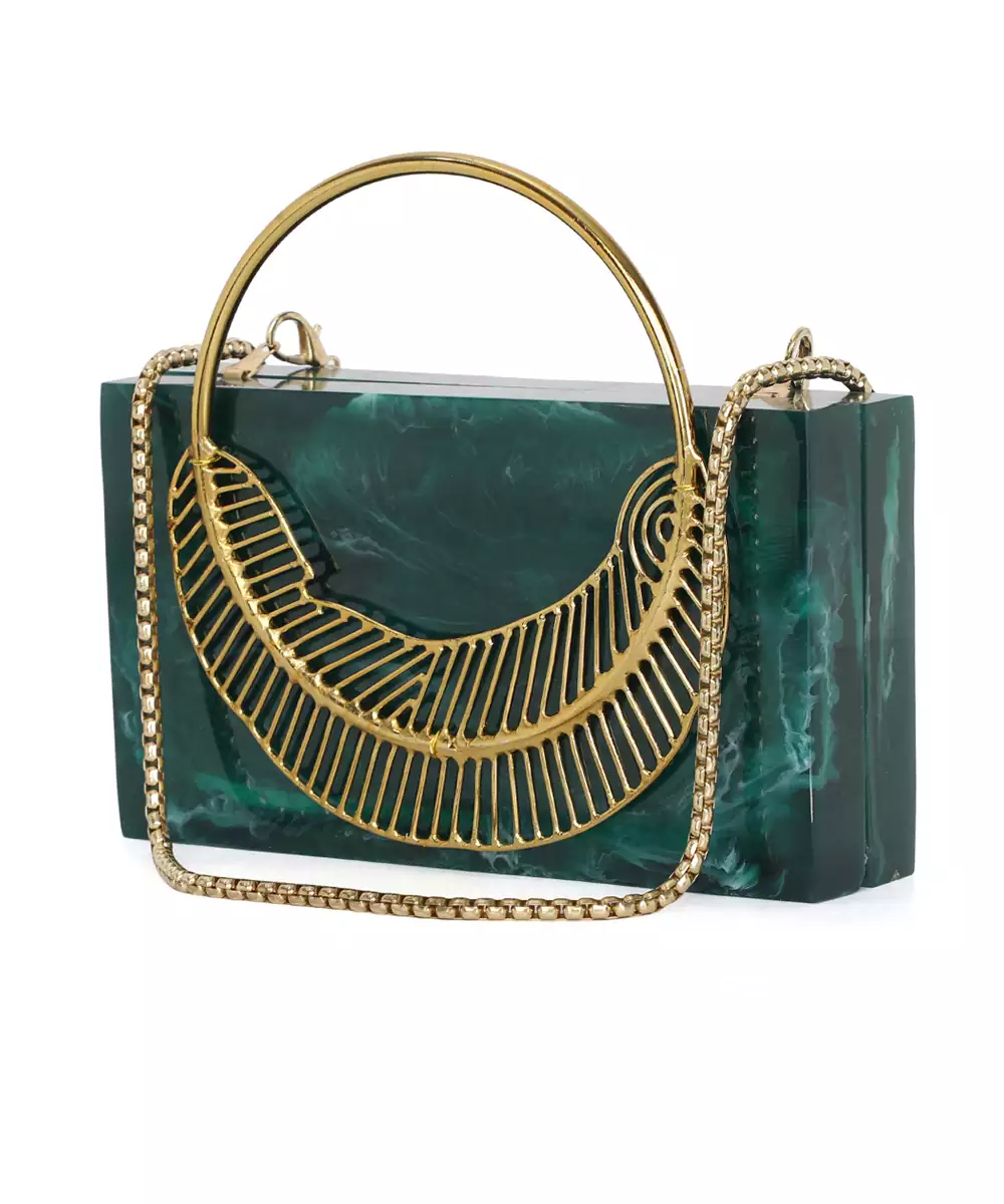 Regal Dark Green Clutch Adorned With Elegant Gold Toned Feather Style Embellishments. Structured Box Silhouette Brings A Bold And Sophisticated Flair To Festive Dressing. Comes With A Shoulder Strap For Comfortable Hands Free Styling. Style Note: Pair With Beige Or Embroidered Green Ensembles To Highlight Its Rich Contrast. Includes One Spacious Main Compartment With Sturdy Click Closure.