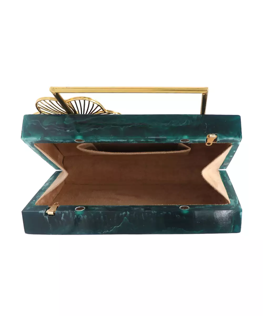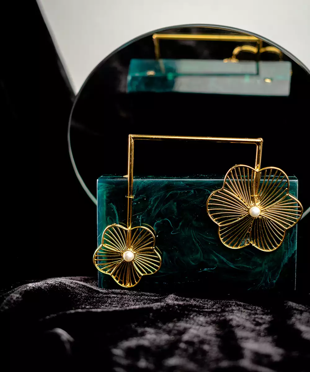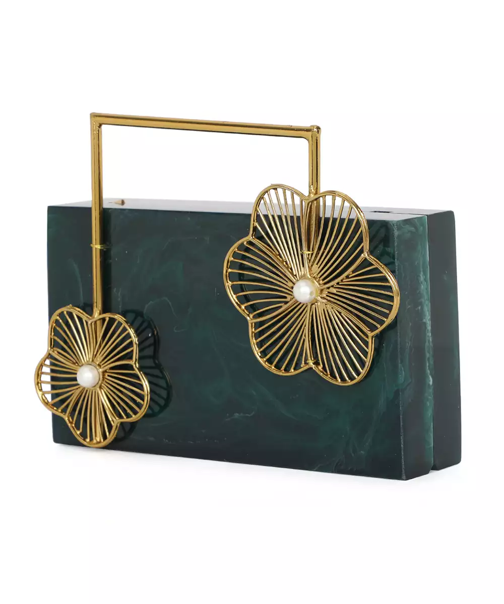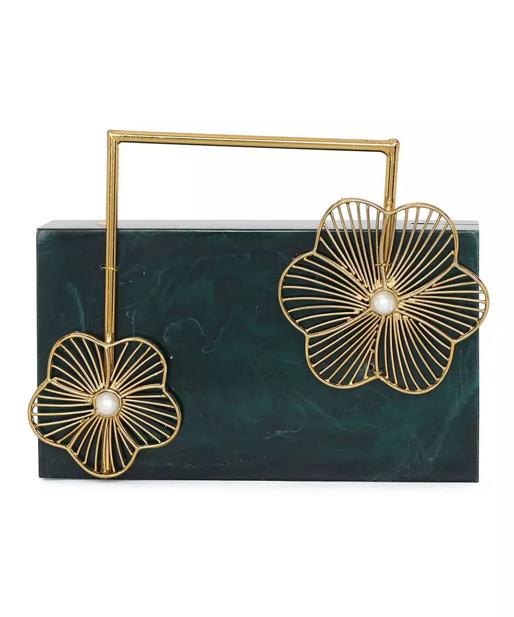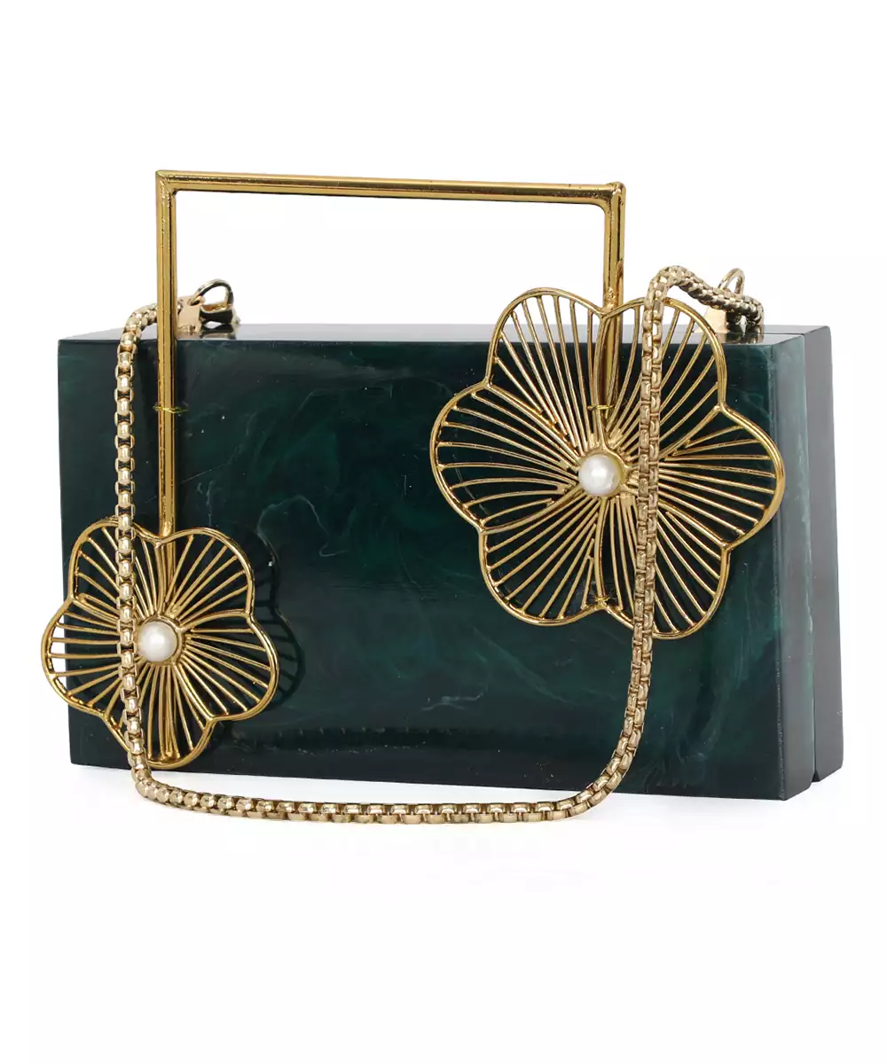 Regal Dark Green Clutch Adorned With Intricate Gold Toned Floral Embellishments For Rich Festive Charm. Structured Box Silhouette Delivers Elegance And Edge To Occasion Styling. Comes With A Shoulder Strap For Effortless Hands Free Wear. Style Note: Pair With Silk Sarees Or Embroidered Sets To Highlight The Clutch’s Luxe Botanical Detailing. One Spacious Main Compartment Secured With A Sturdy...