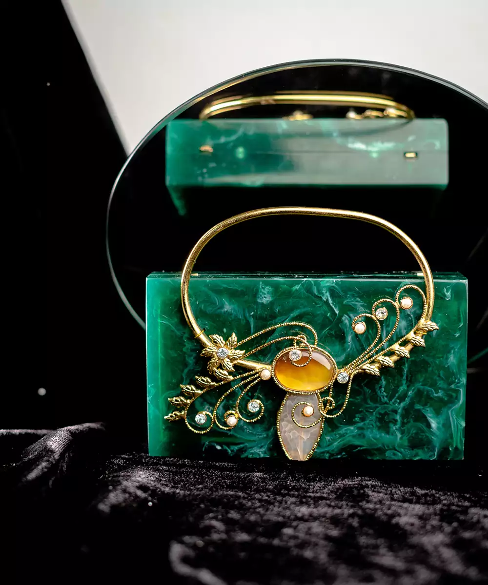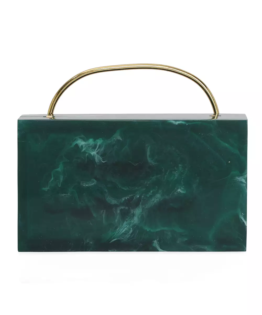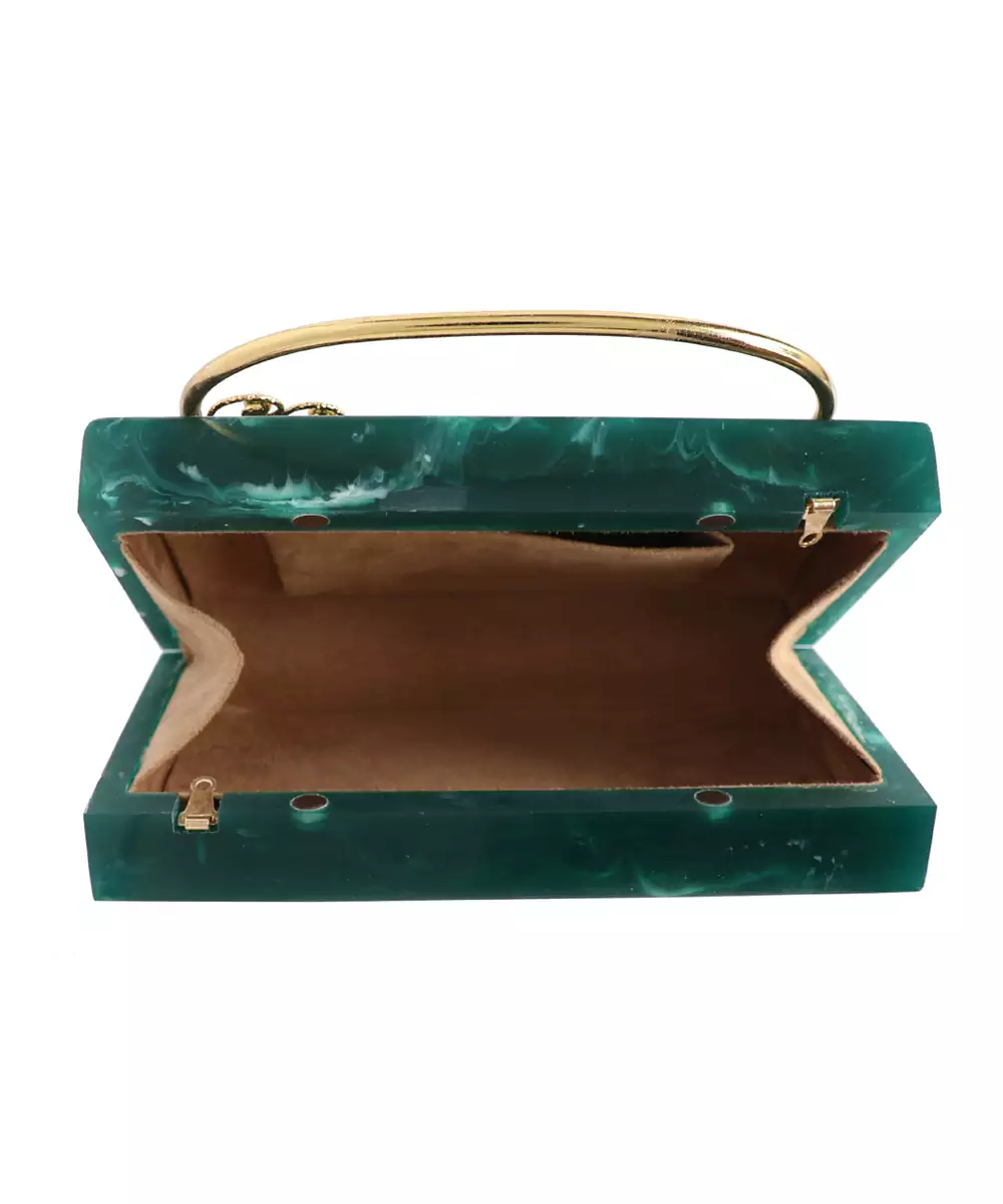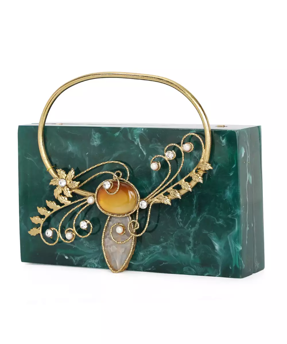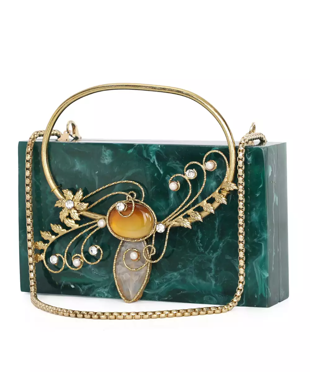 Structured Box Clutch In Rich Dark Green With Gold Toned Floral Embellishments. Comes With A Detachable Shoulder Strap For Hands Free Styling. One Main Compartment Secured With A Click Closure For Essentials. Velvet Finish Adds Depth And Festive Elegance To The Accessory. Style Note: Pair With A Gold Brocade Kurta Or Emerald Lehenga To Highlight The Clutch’s Regal Charm.