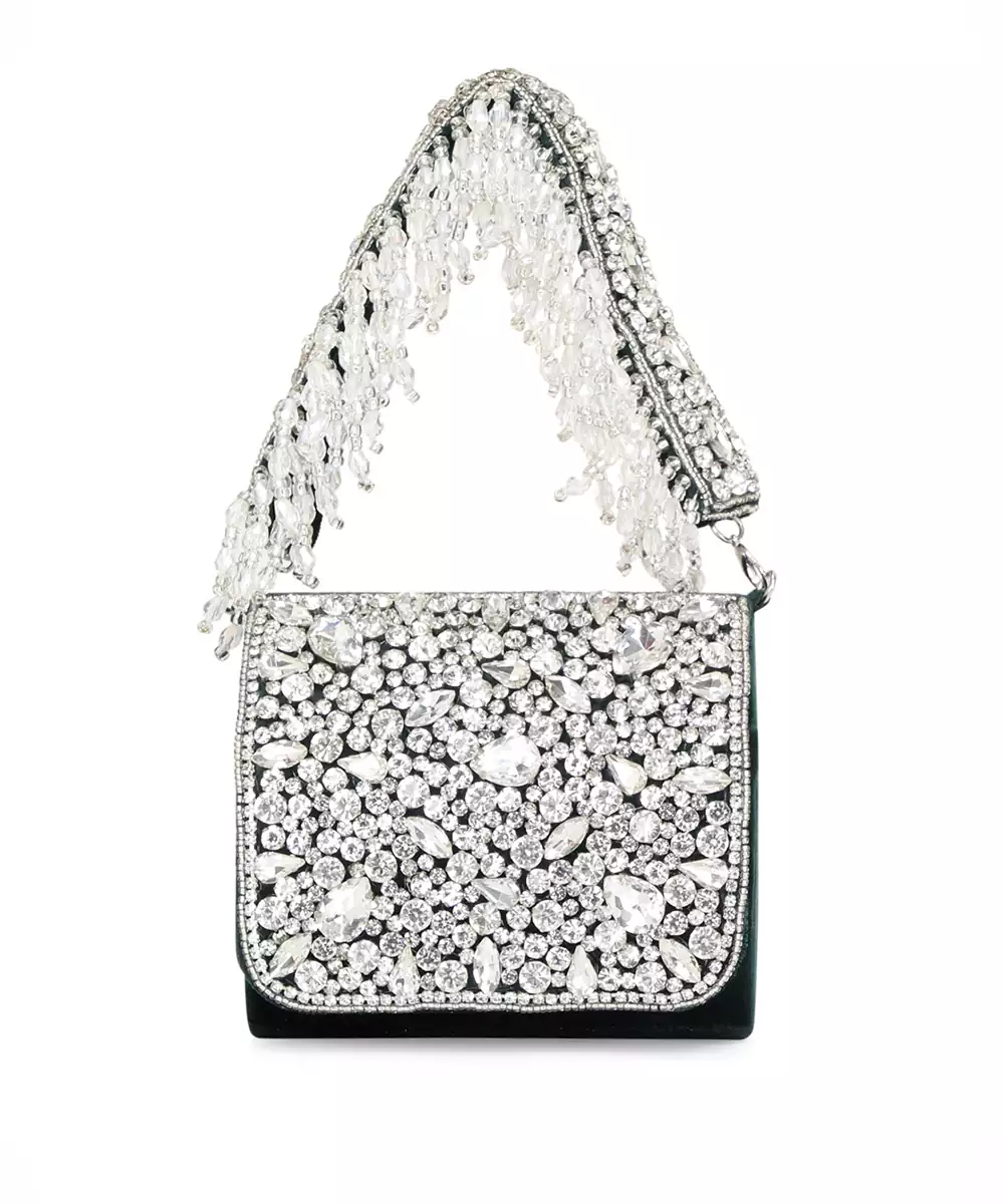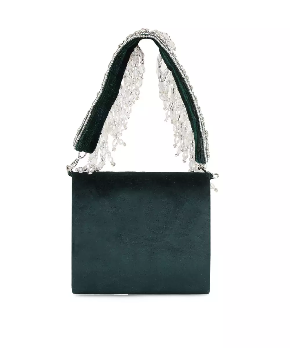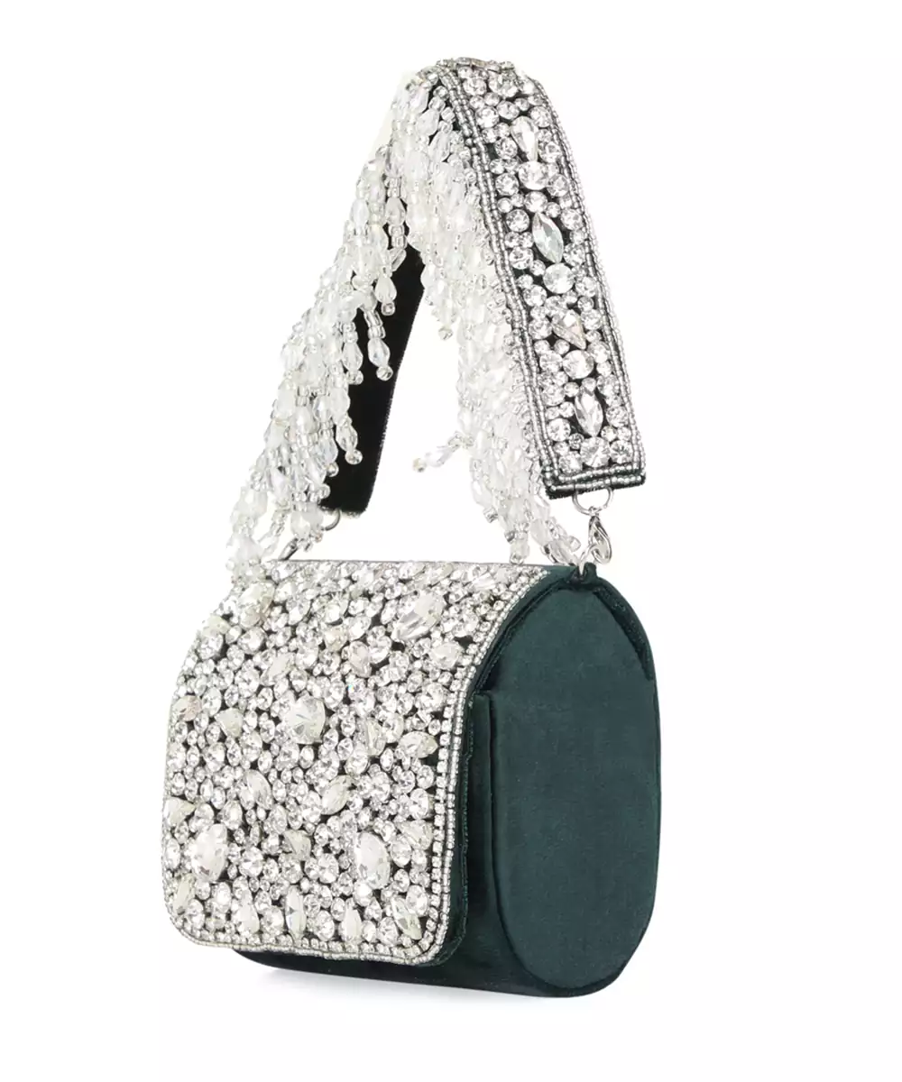 Foldover Clutch In Rich Dark Green, Embellished With Shimmering Diamond Accents. Features A Wrist Loop With Silver Tassels For Festive Flair. Button Closure Secures The Spacious Main Compartment. Perfect For Weddings, Evening Galas, And Upscale Parties. Style Note: Pair With Gold Accented Outfits Or Jewel Toned Lehengas For Dramatic, Regal Elegance.