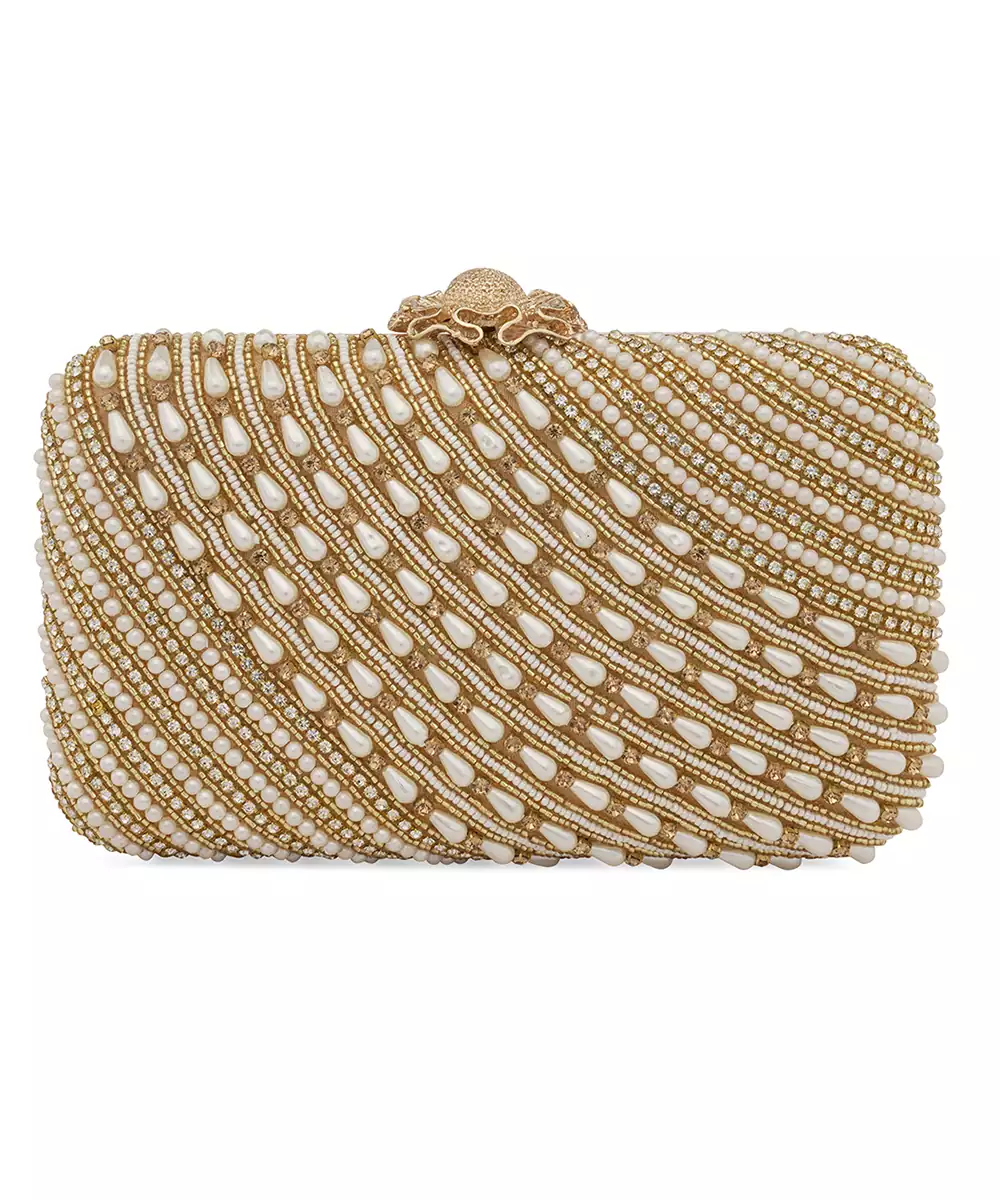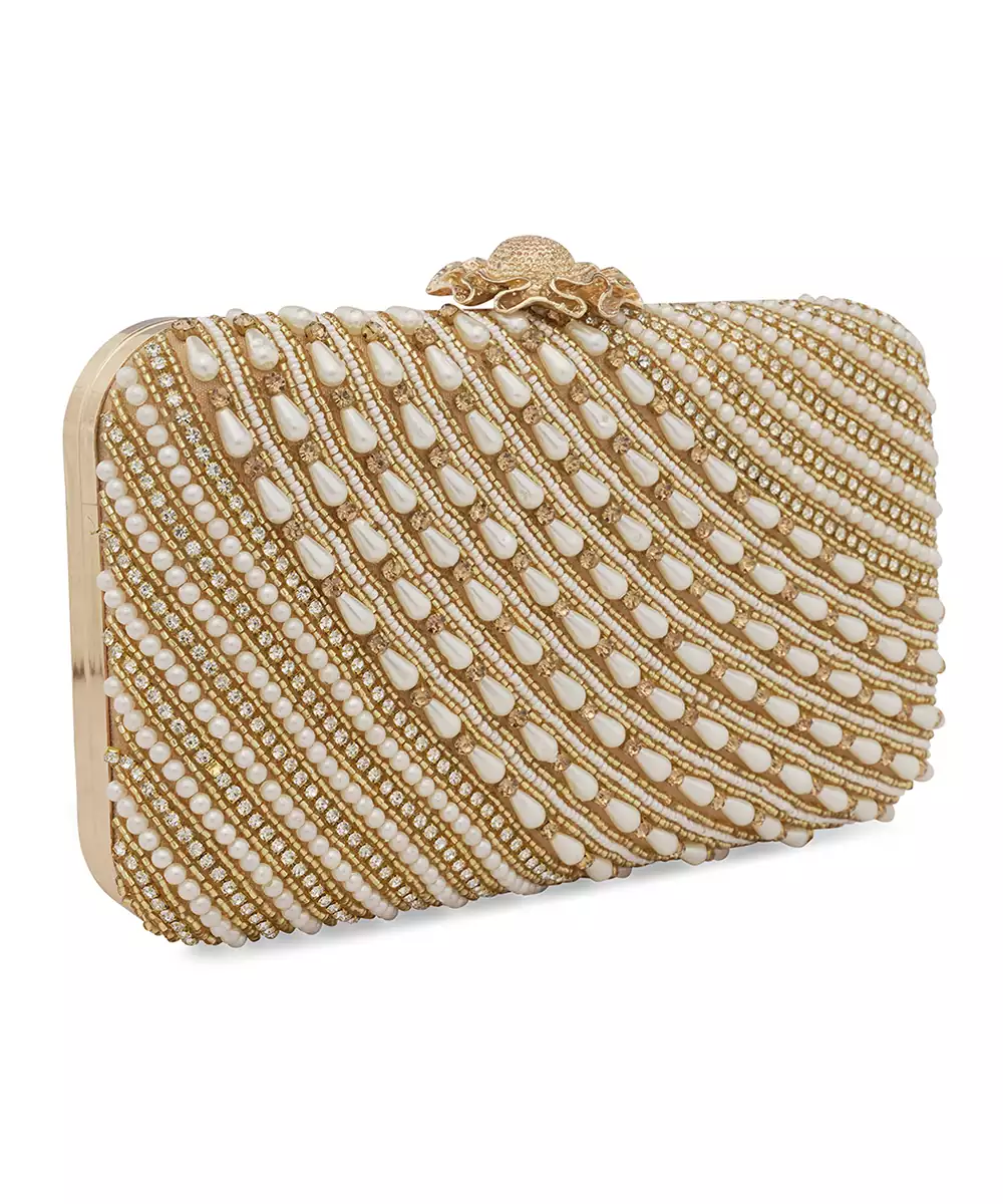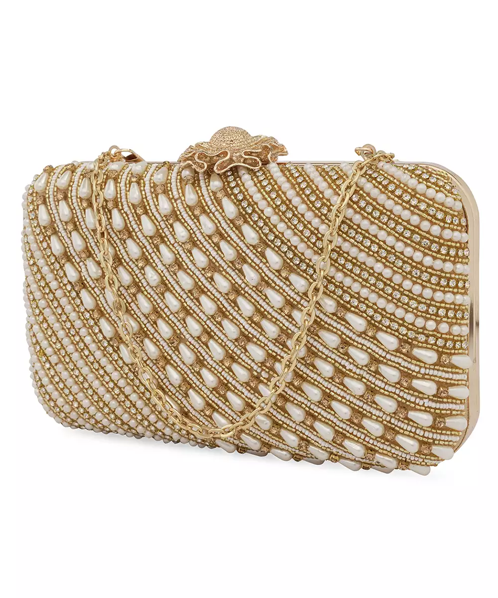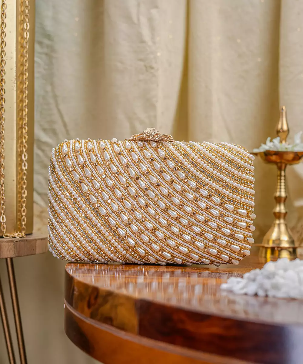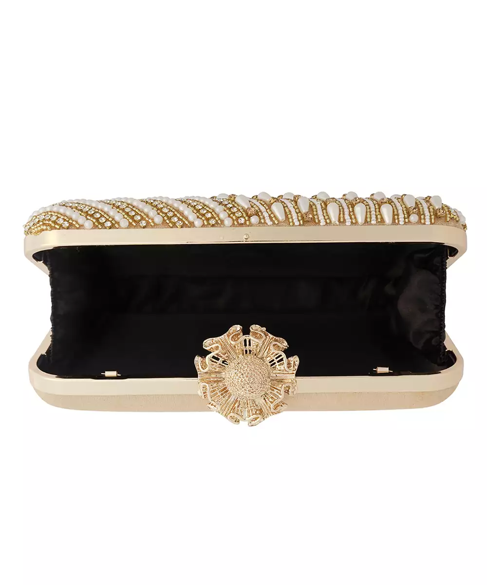 Structured Box Silhouette With Elegant White And Gold Embroidery. Satin Base With Shimmer Threadwork For A Refined Festive Finish. Comes With A Detachable Shoulder Strap For Hands Free Styling. One Main Compartment Secured With A Twist Lock Closure. Style Note: Pair With Ivory Lehengas Or Gold Toned Sarees For A Timeless Rakhi Or Bridal Ready Accent.