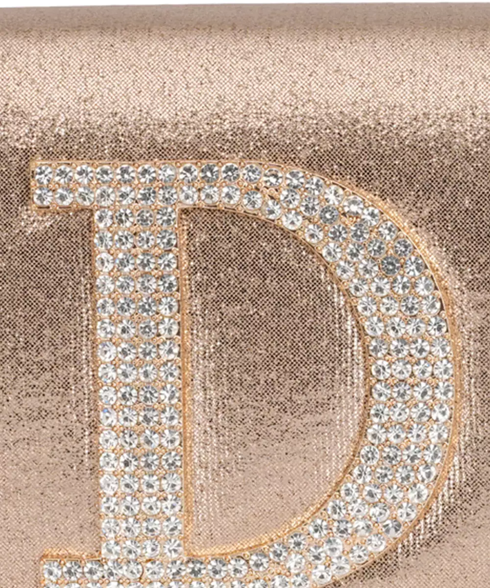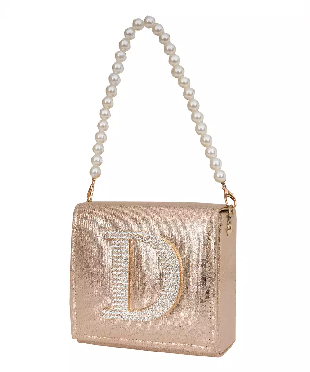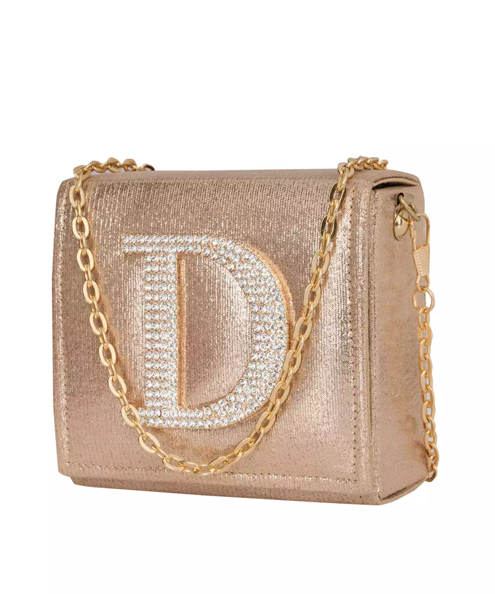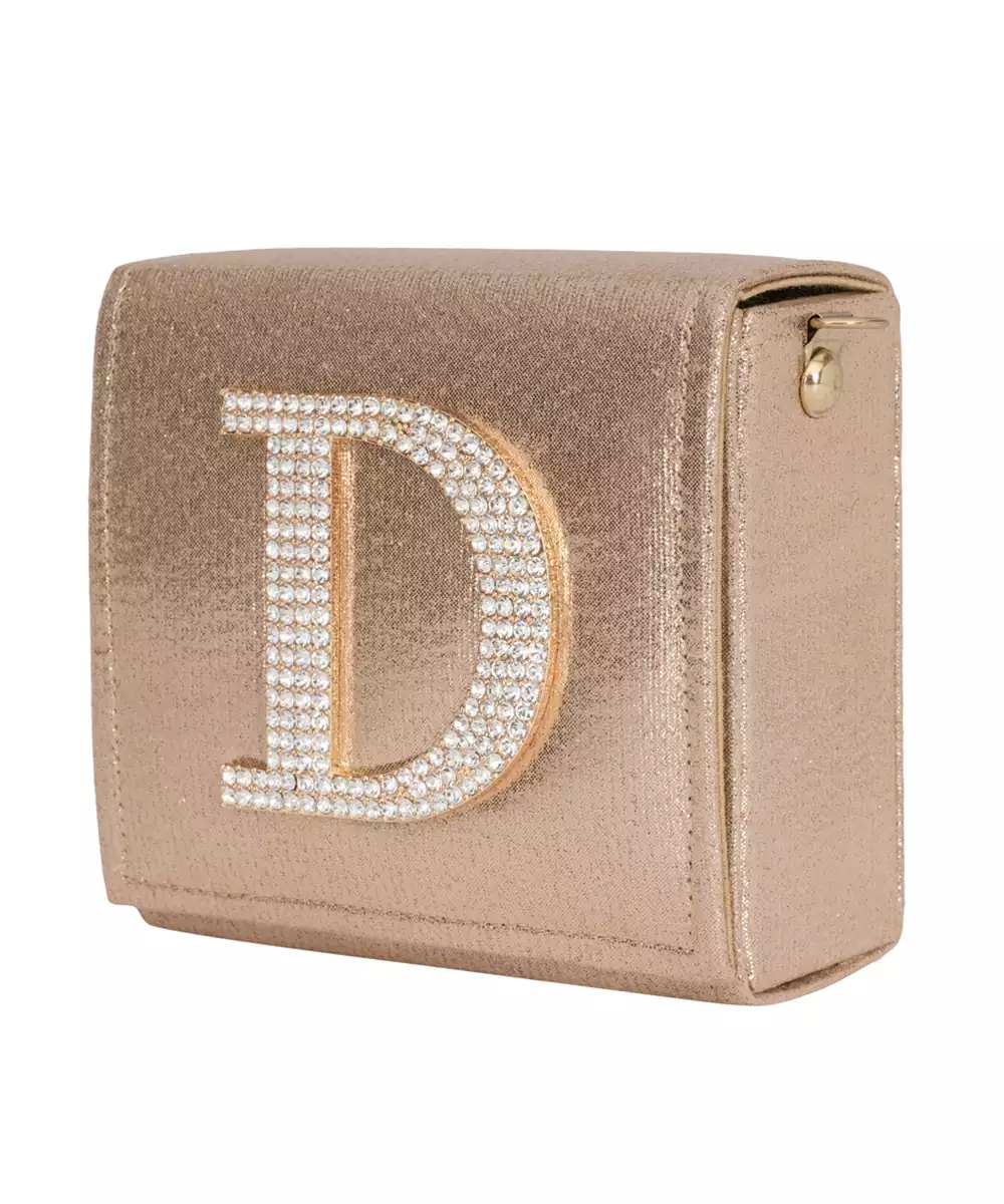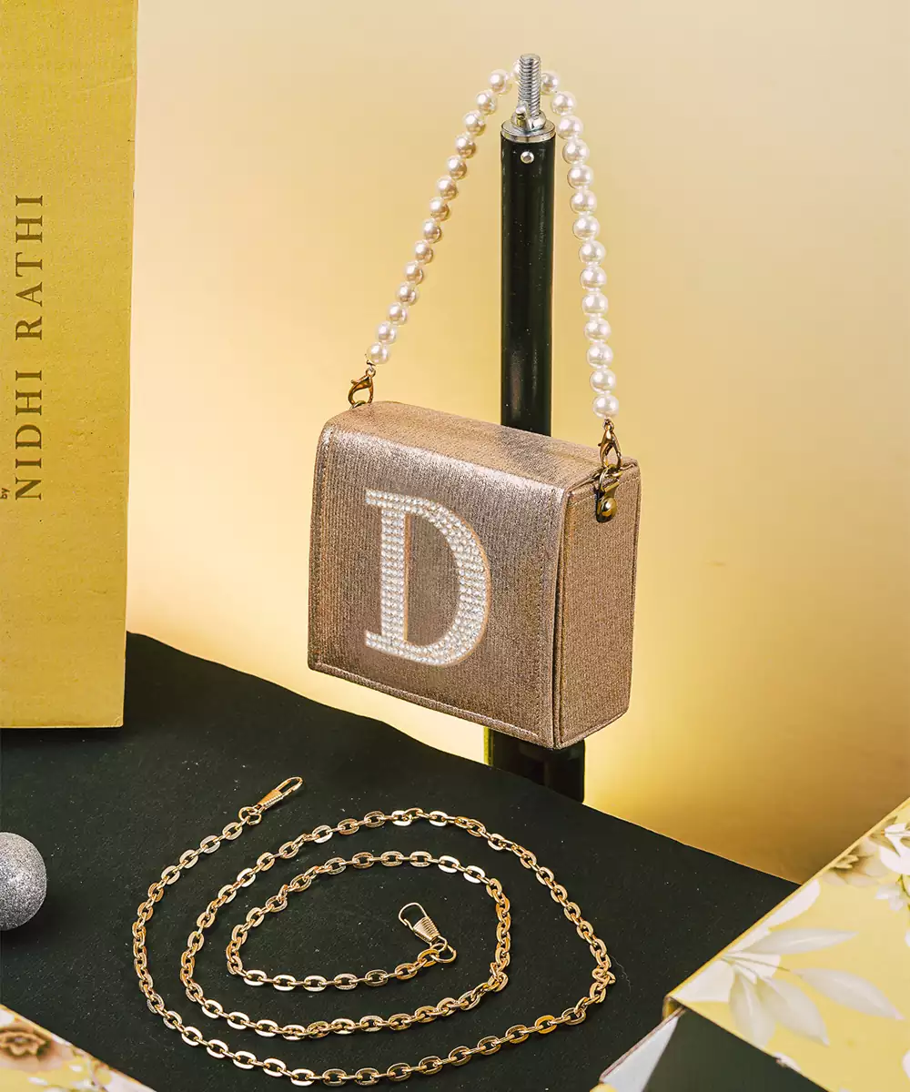 Structured Box Clutch In Gleaming Gold Tone With Diamond Style Embellishments. Features A Bold ‘D’ Alphabet Accent For Personalized Charm. Includes A Detachable Shoulder Strap For Hands Free Styling Flexibility. Button Closure Secures Essentials Within The Roomy Main Compartment. Luxe And Expressive—Perfect For Gifting, Bridal Wear, Or Festive Edits With A Touch Of Identity.