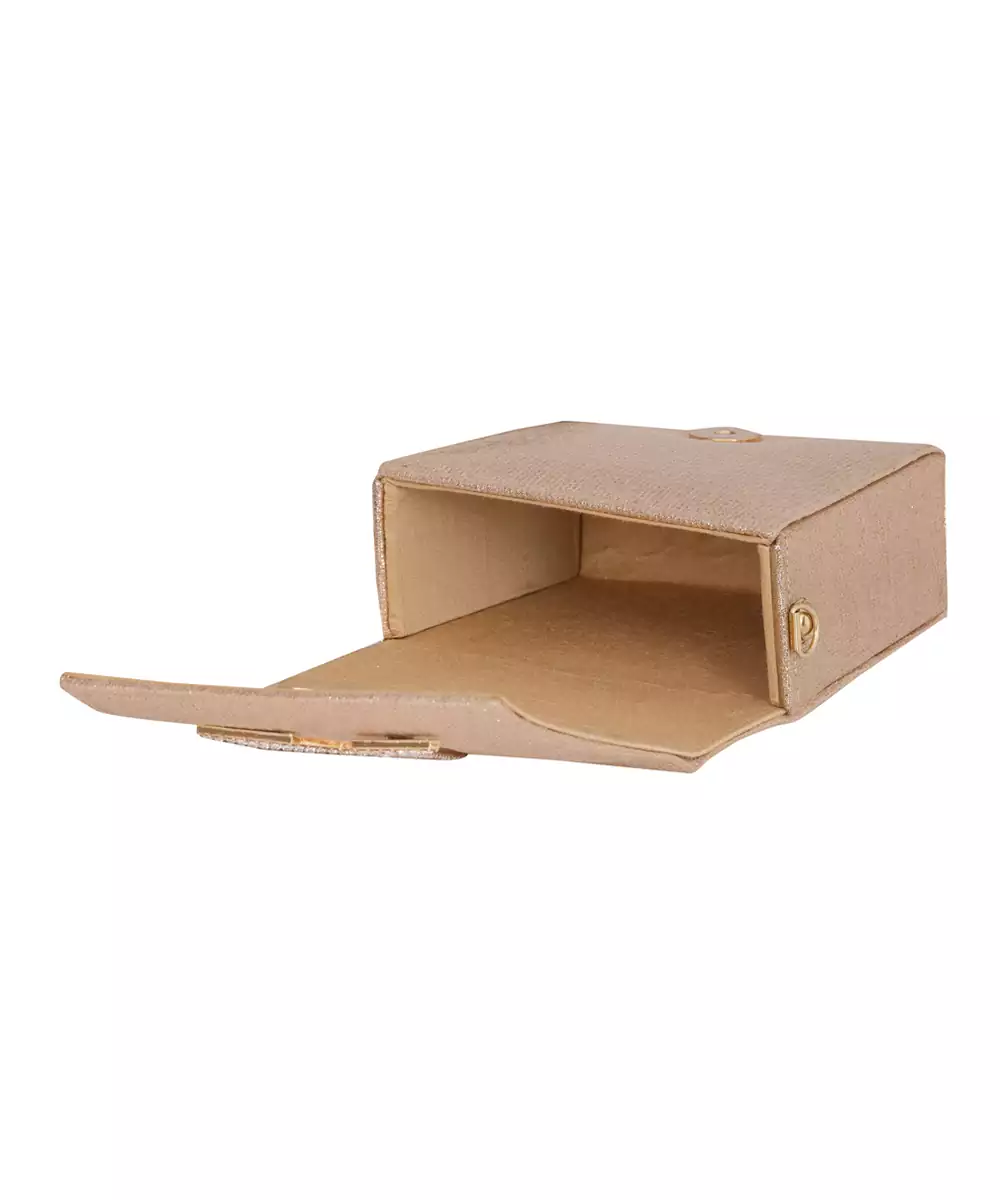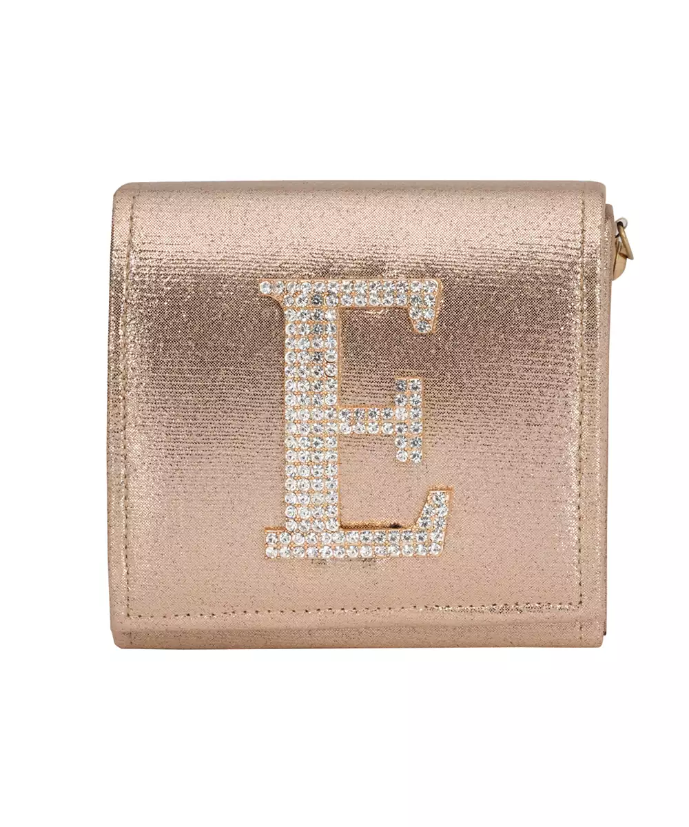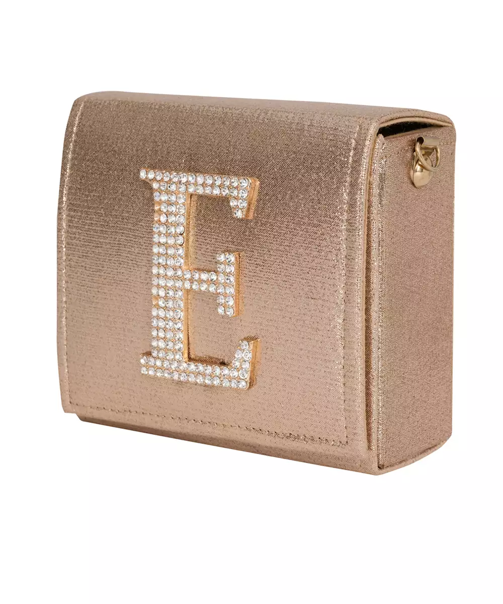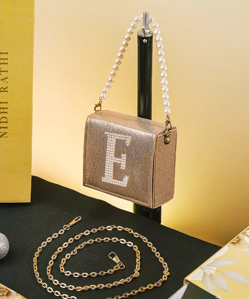 Structured Box Clutch In Gleaming Gold Tone With Diamond Style Embellishments. Features A Bold ‘E’ Alphabet Accent For Personalized Charm. Includes A Detachable Shoulder Strap For Hands Free Styling Flexibility. Button Closure Secures Essentials Within The Roomy Main Compartment. Luxe And Expressive—Perfect For Gifting, Bridal Wear, Or Festive Edits With A Touch Of Identity.