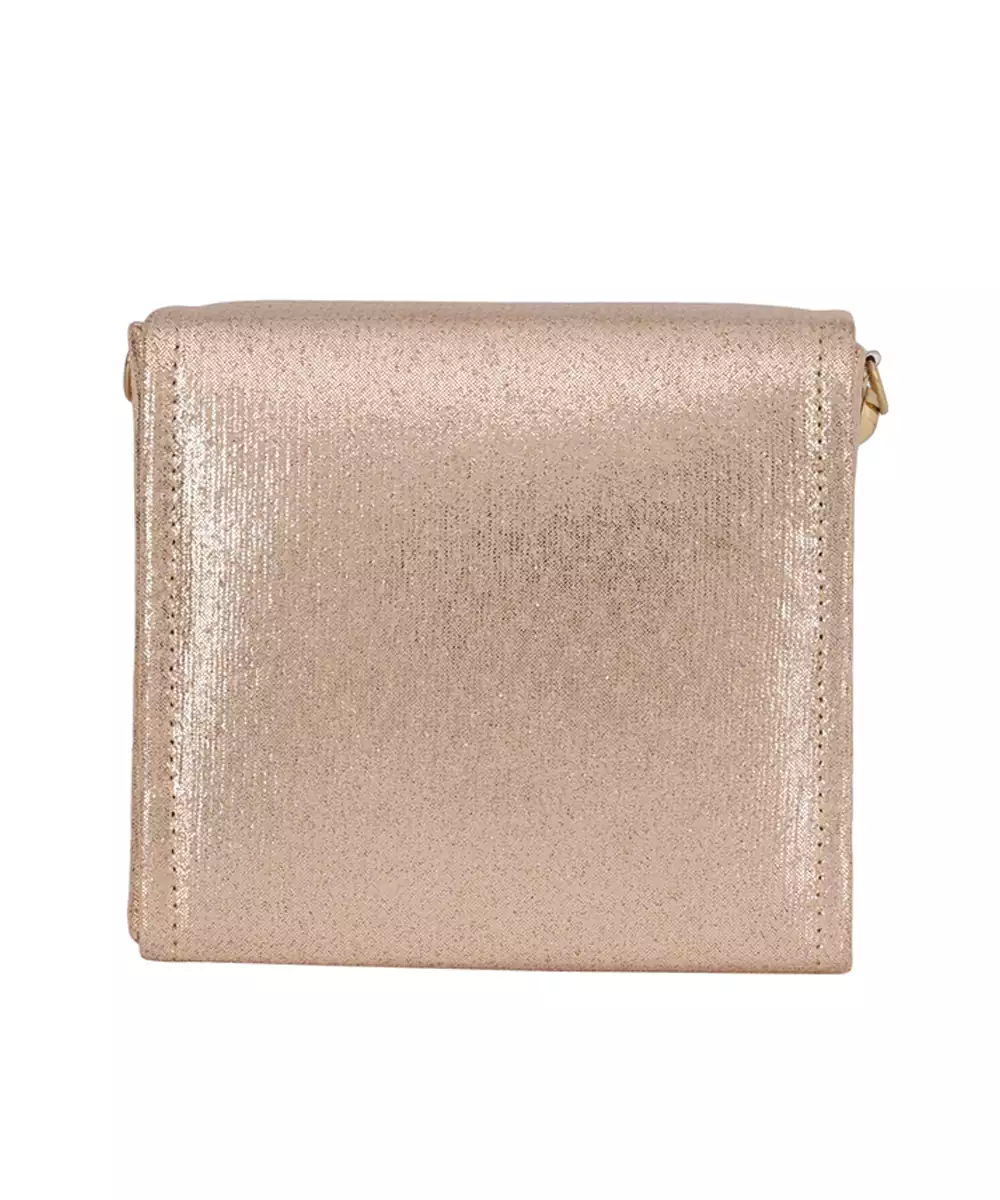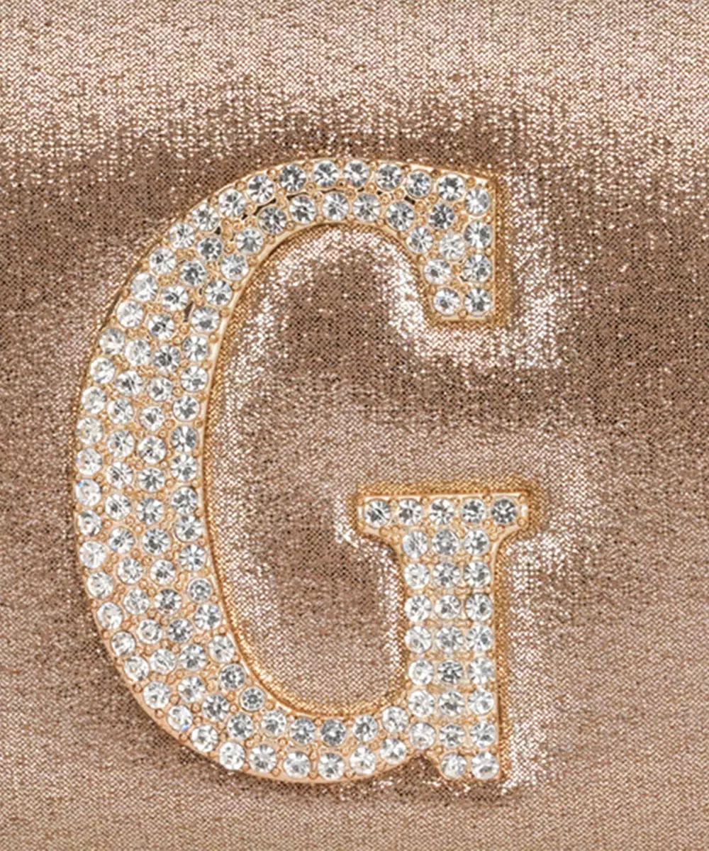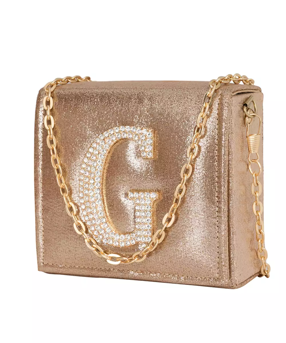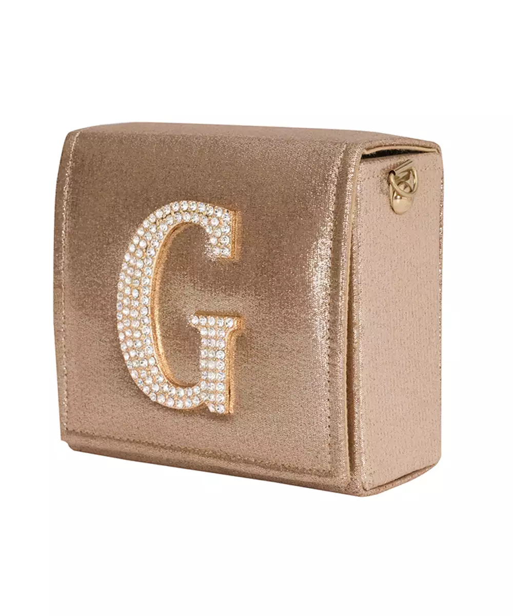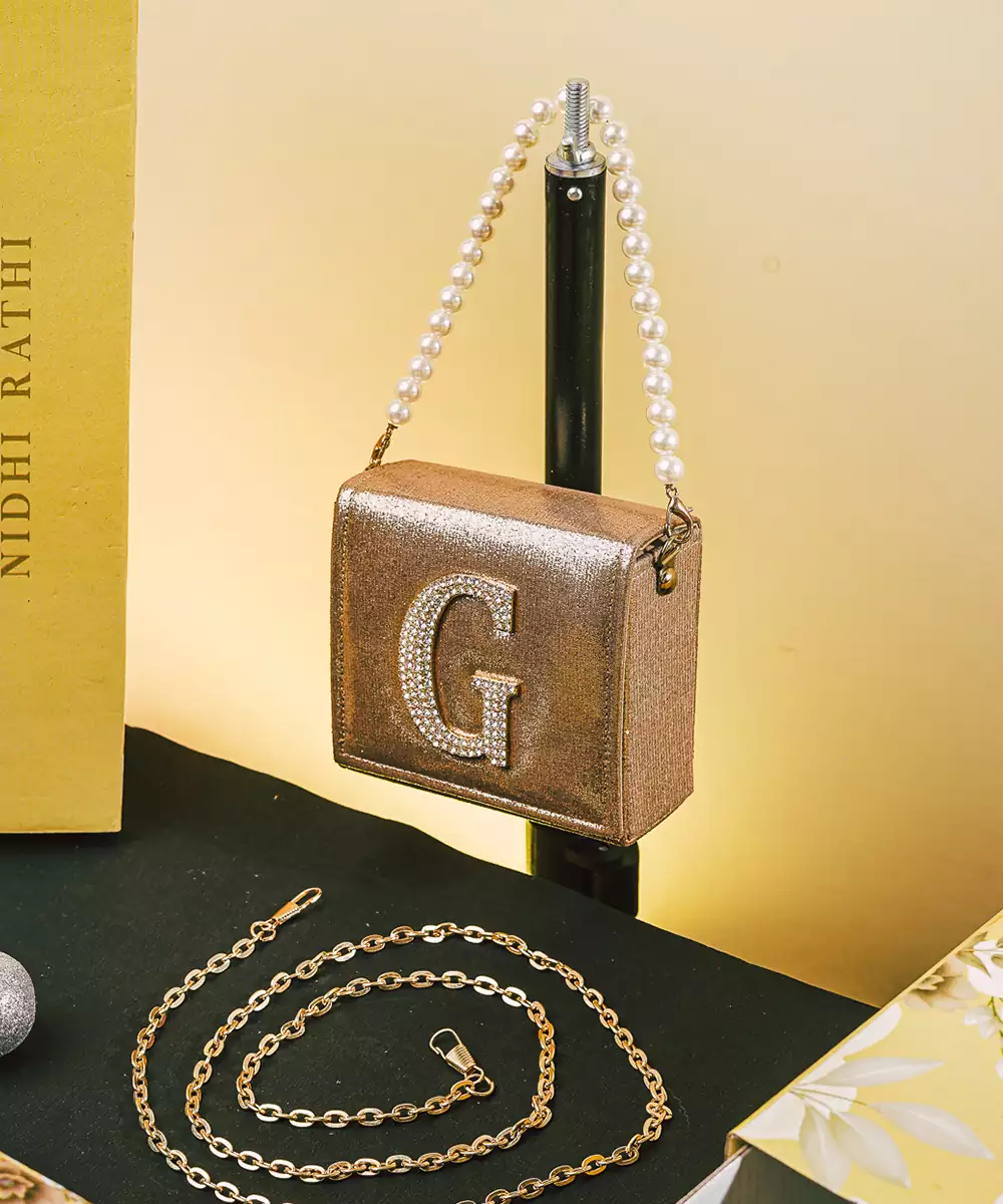 Structured Box Clutch In Gleaming Gold Tone With Diamond Style Embellishments. Features A Bold ‘G’ Alphabet Accent For Personalized Charm. Includes A Detachable Shoulder Strap For Hands Free Styling Flexibility. Button Closure Secures Essentials Within The Roomy Main Compartment. Luxe And Expressive—Perfect For Gifting, Bridal Wear, Or Festive Edits With A Touch Of Identity.