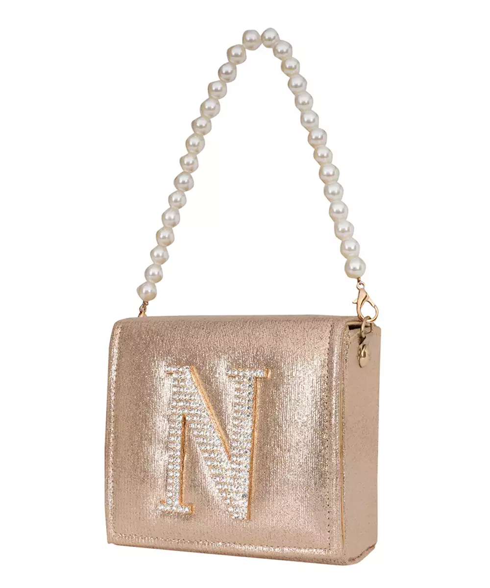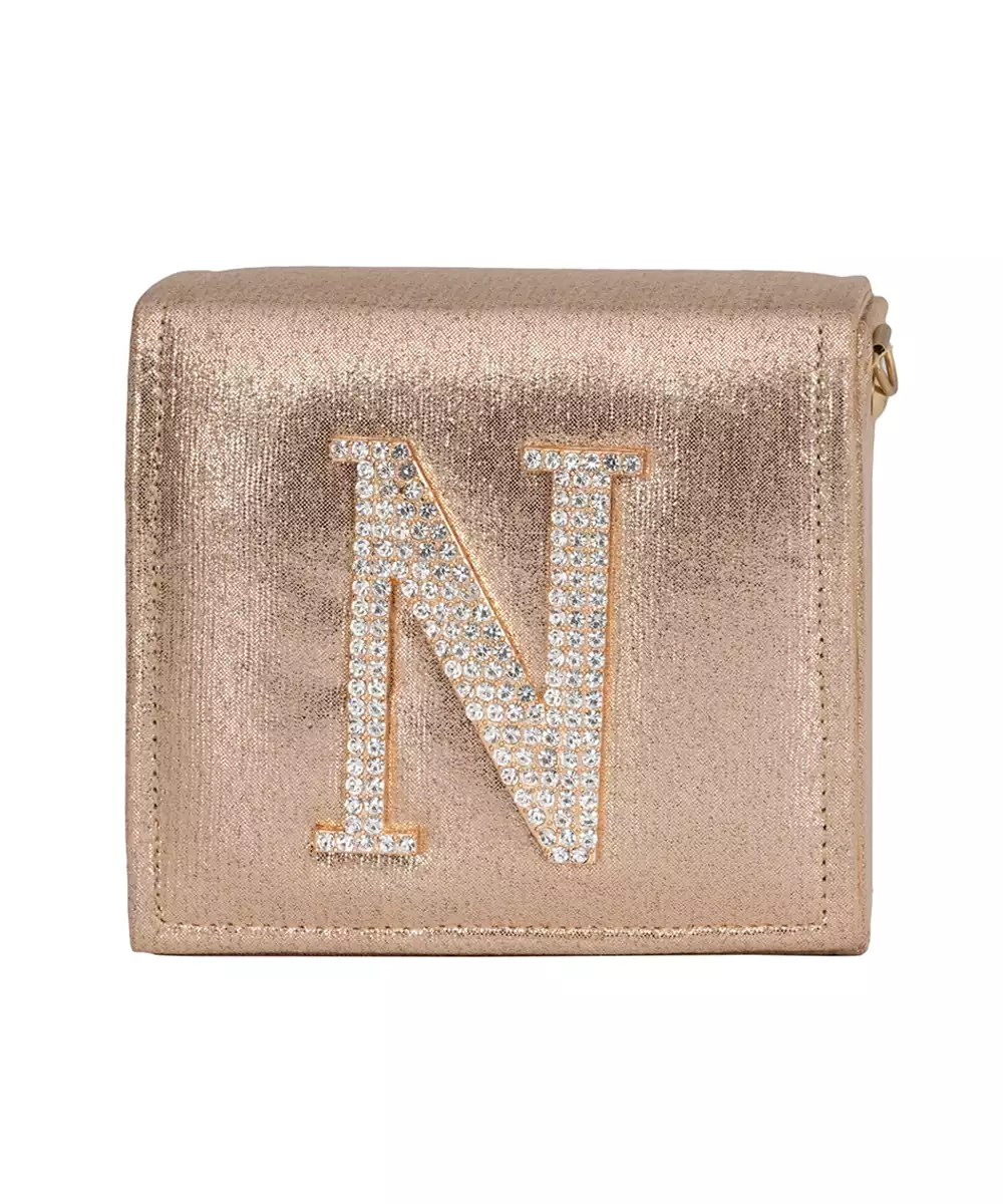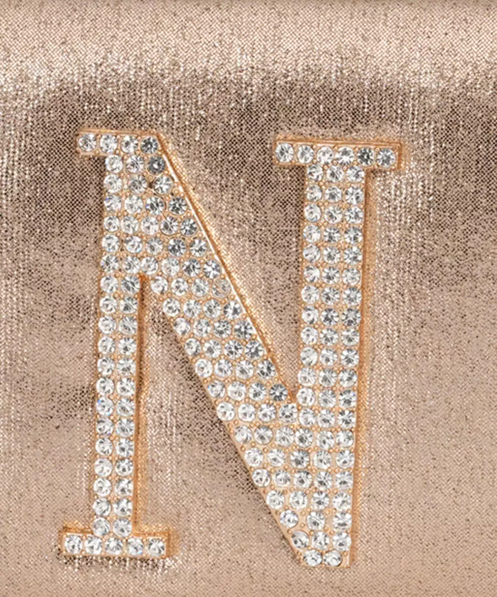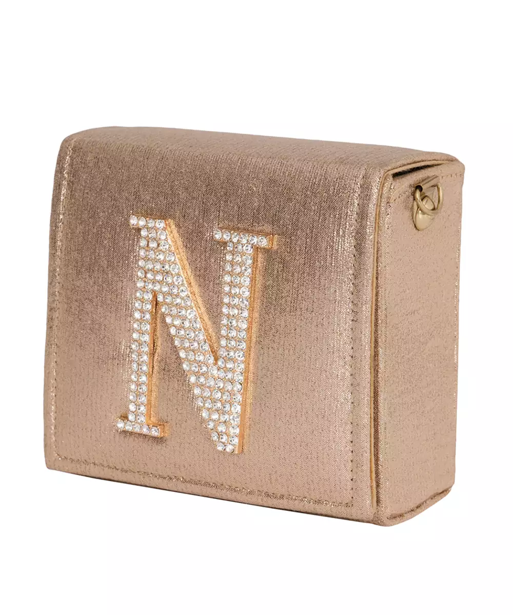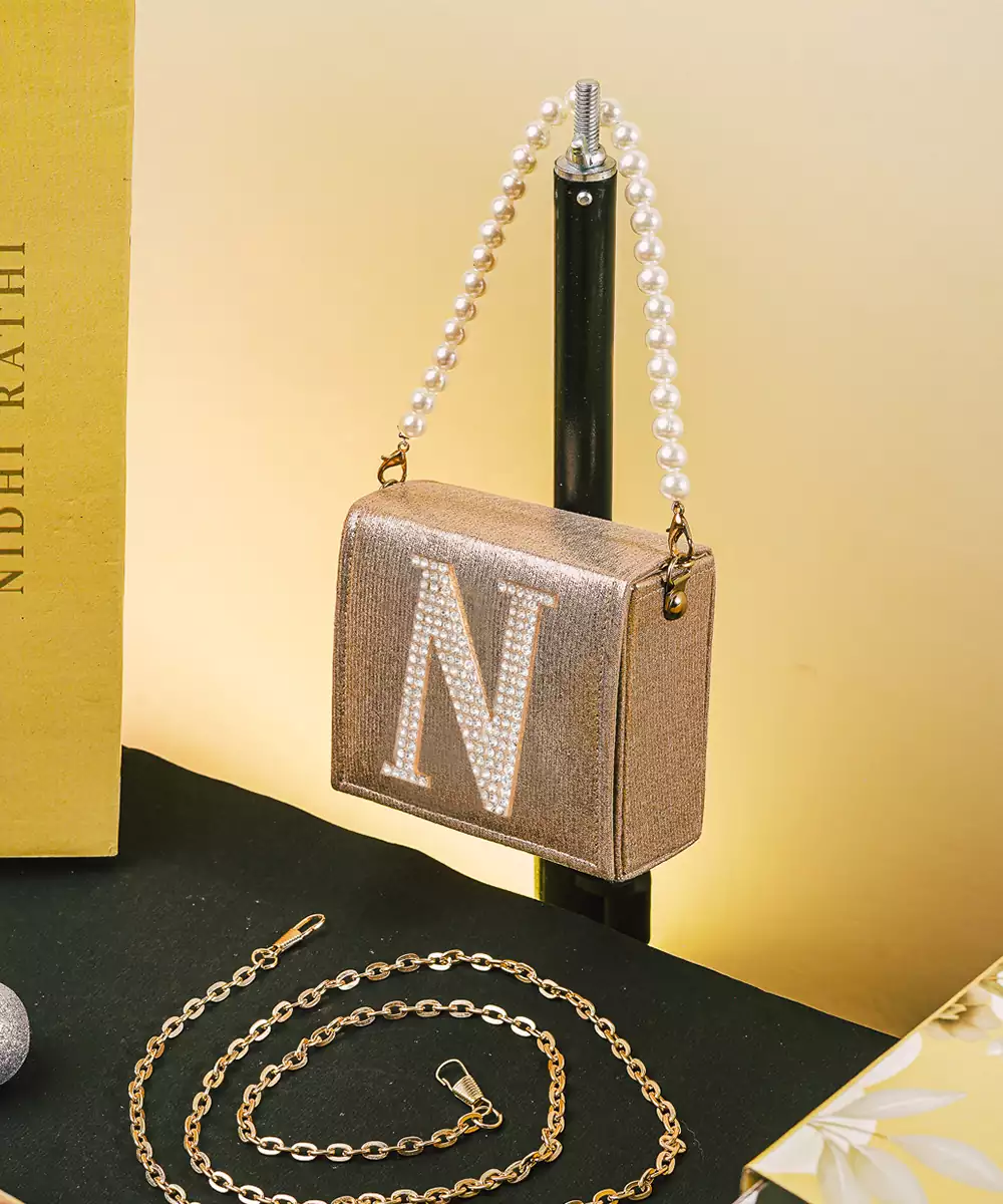 Structured Box Clutch In Gleaming Gold Tone With Diamond Style Embellishments. Features A Bold ‘N’ Alphabet Accent For Personalized Charm. Includes A Detachable Shoulder Strap For Hands Free Styling Flexibility. Button Closure Secures Essentials Within The Roomy Main Compartment. Luxe And Expressive—Perfect For Gifting, Bridal Wear, Or Festive Edits With A Touch Of Identity.