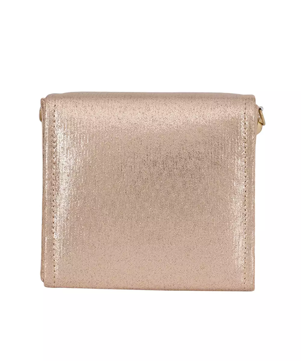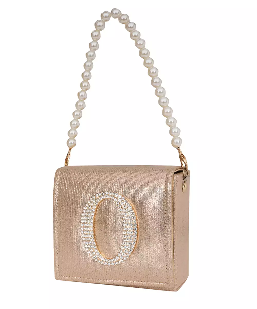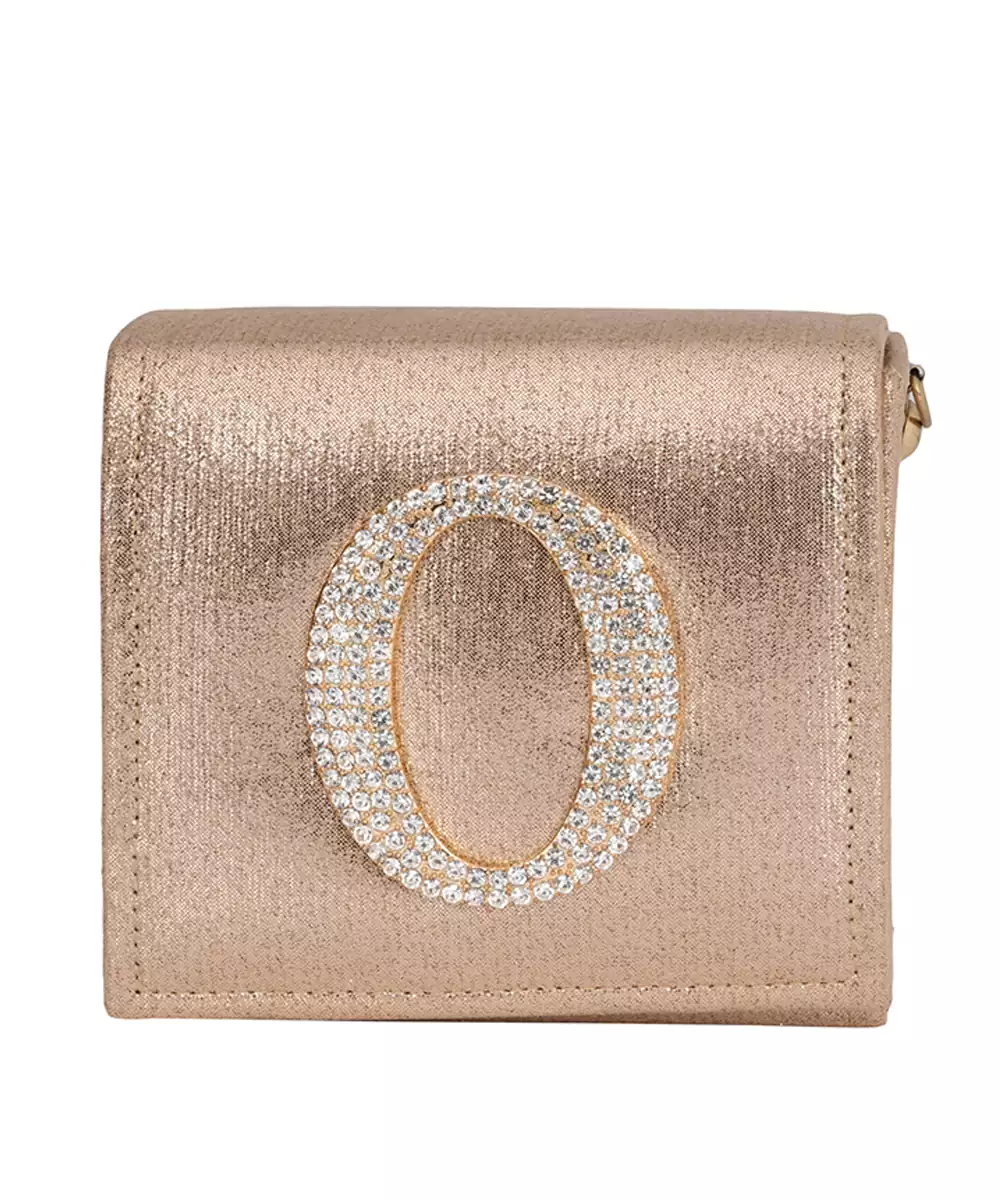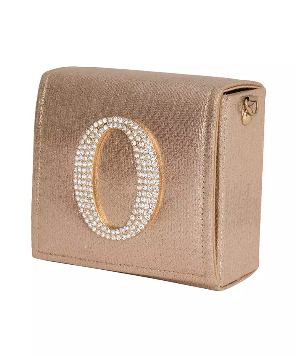 Structured Box Clutch In Gleaming Gold Tone With Diamond Style Embellishments. Features A Bold ‘O’ Alphabet Accent For Personalized Charm. Includes A Detachable Shoulder Strap For Hands Free Styling Flexibility. Button Closure Secures Essentials Within The Roomy Main Compartment. Luxe And Expressive—Perfect For Gifting, Bridal Wear, Or Festive Edits With A Touch Of Identity.