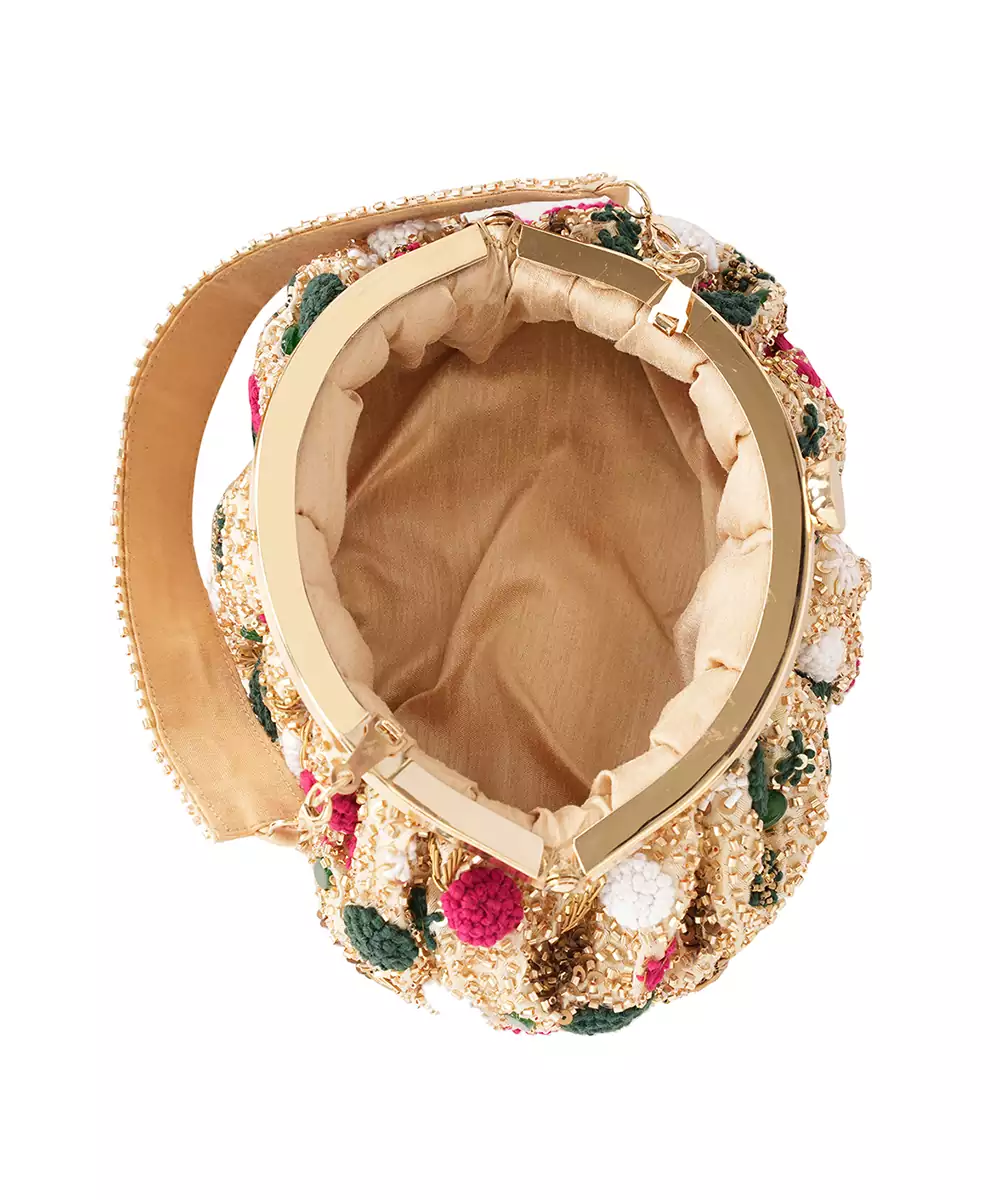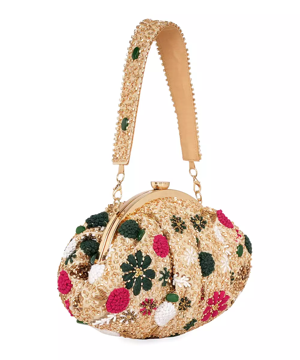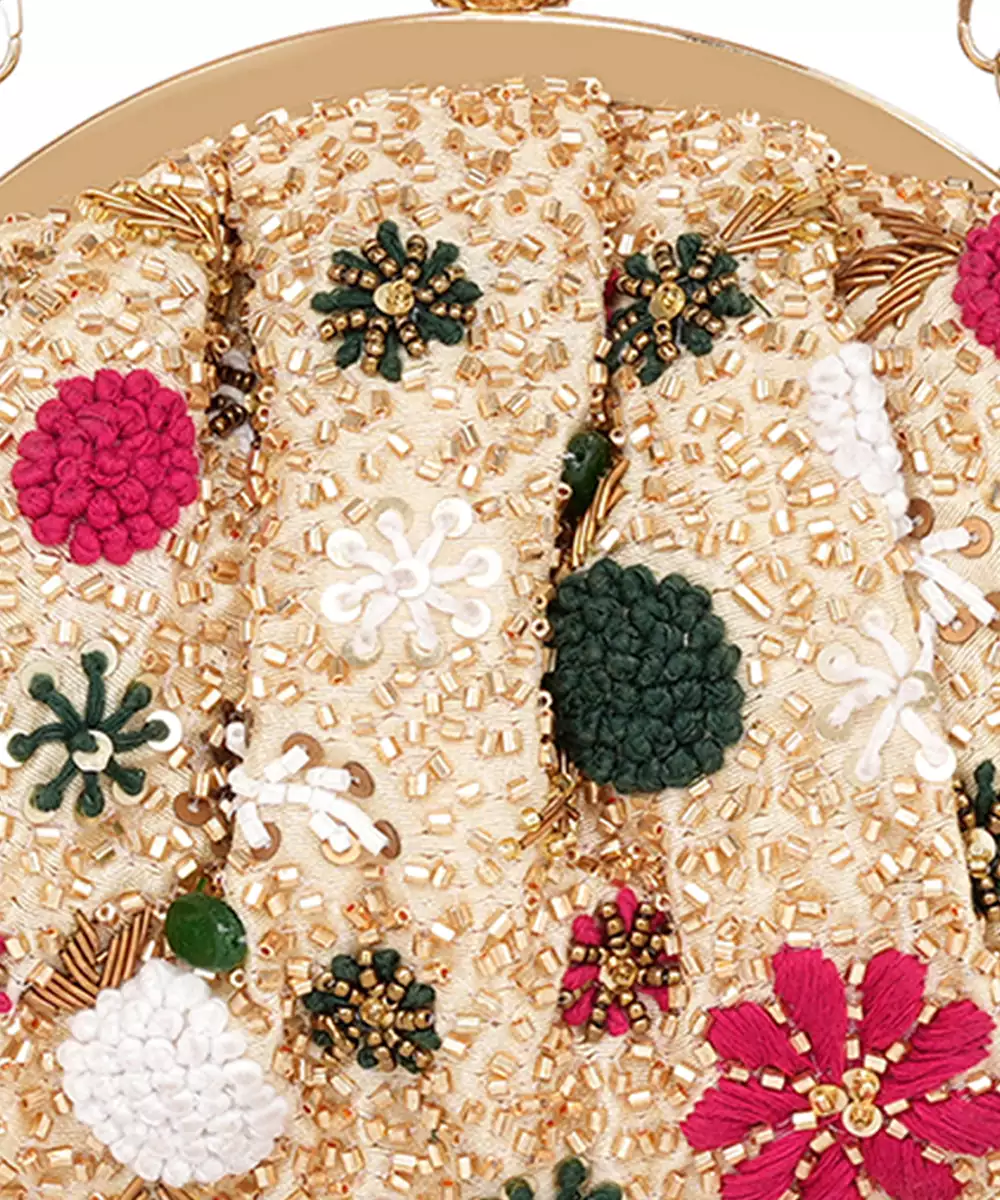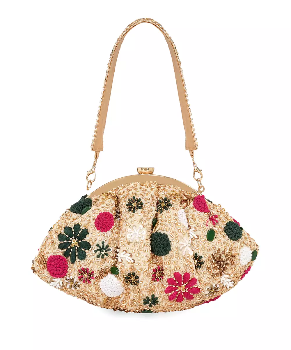 Half Moon Silhouette In Radiant Gold Tone, Adorned With Vibrant Multicolored Floral Print Embroidery. Features A Twist Lock Closure And A Spacious Single Compartment For Essentials. Wrist Loop Offers Easy And Elegant Handheld Styling. Perfect For Haldi Brunches, Festive Evenings, Or Summer Celebrations. Style Note: Pair It With Printed Fusion Sets Or Pastel Draped Sarees To Bring Out The...