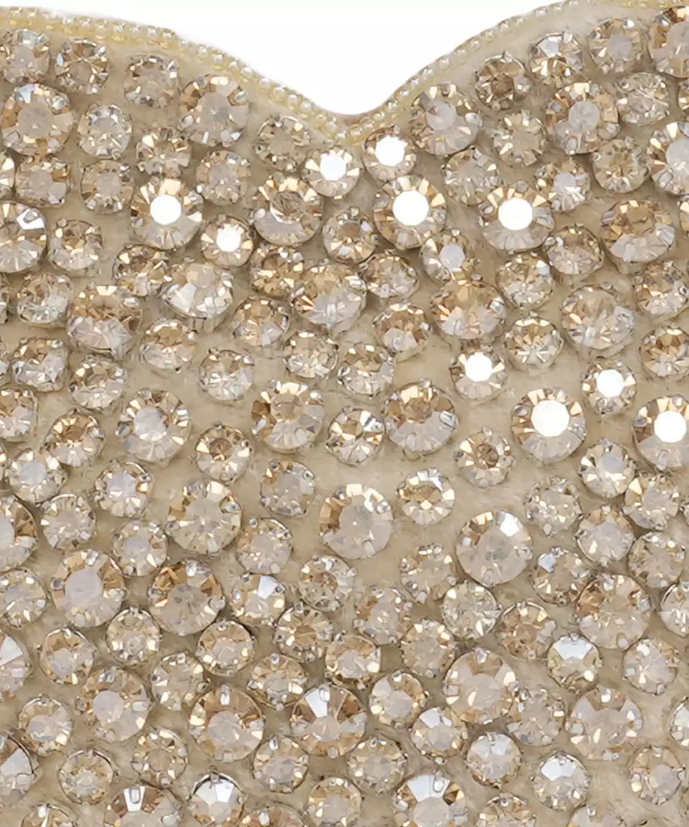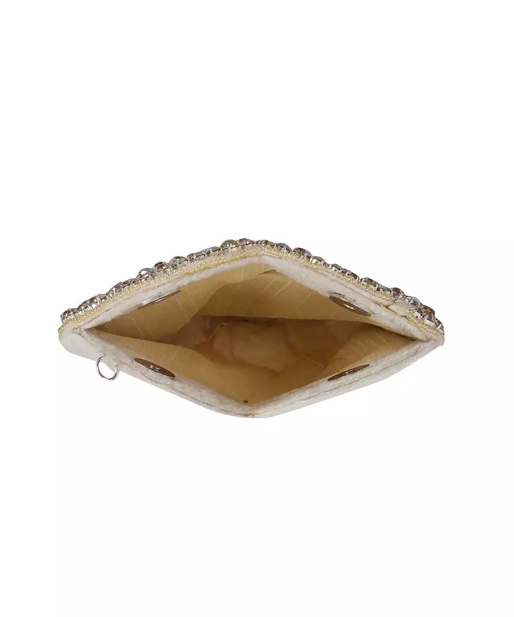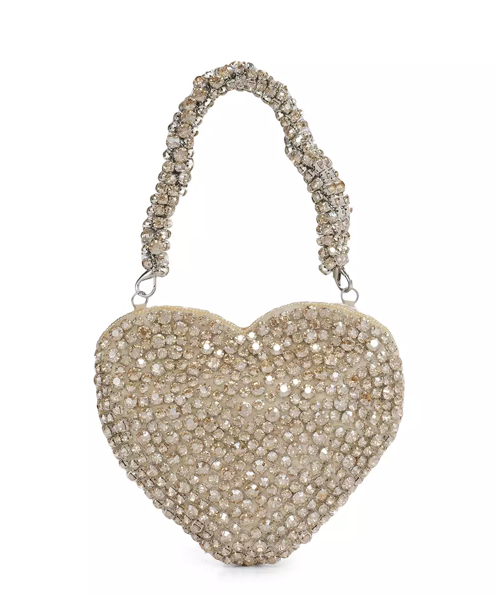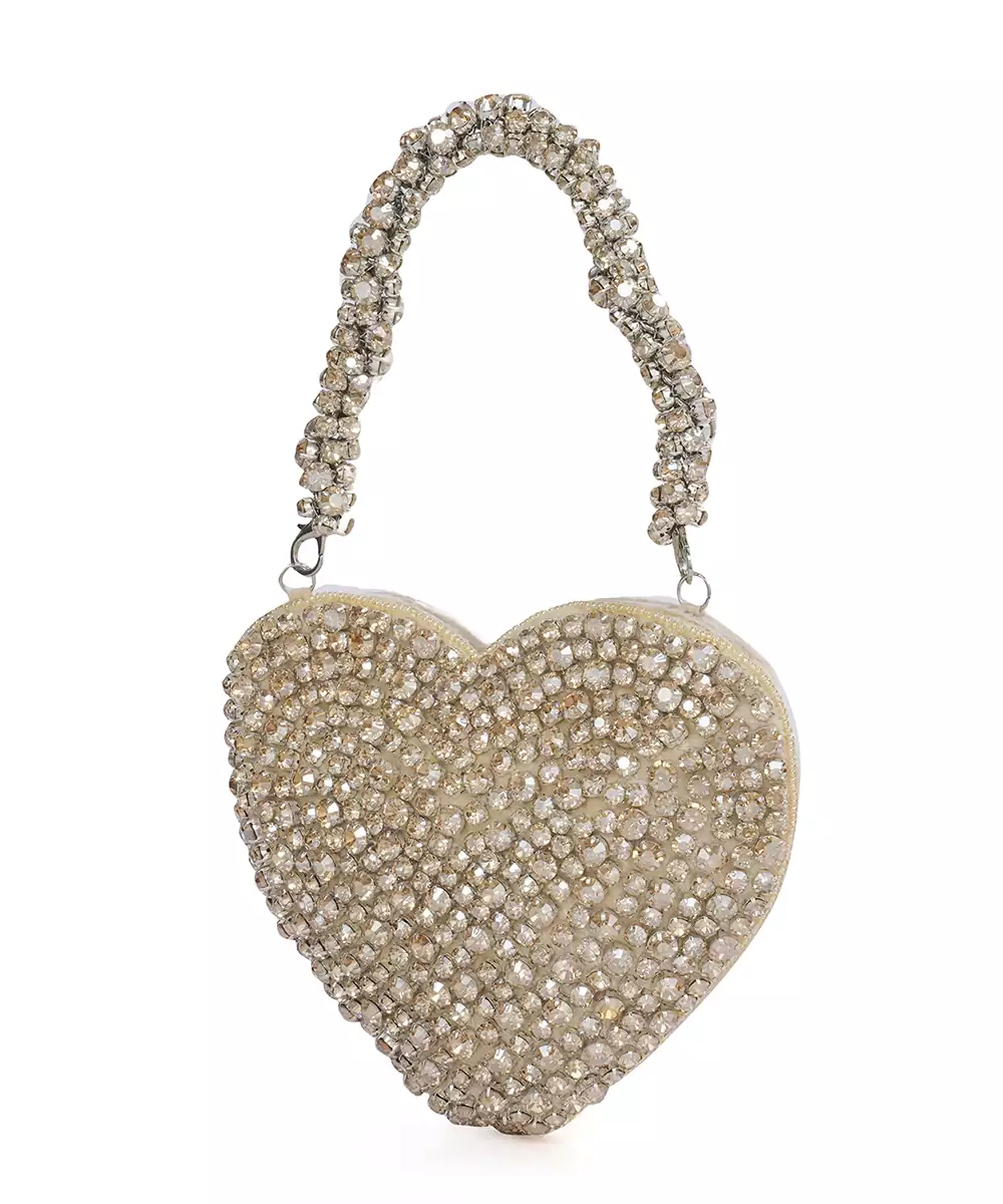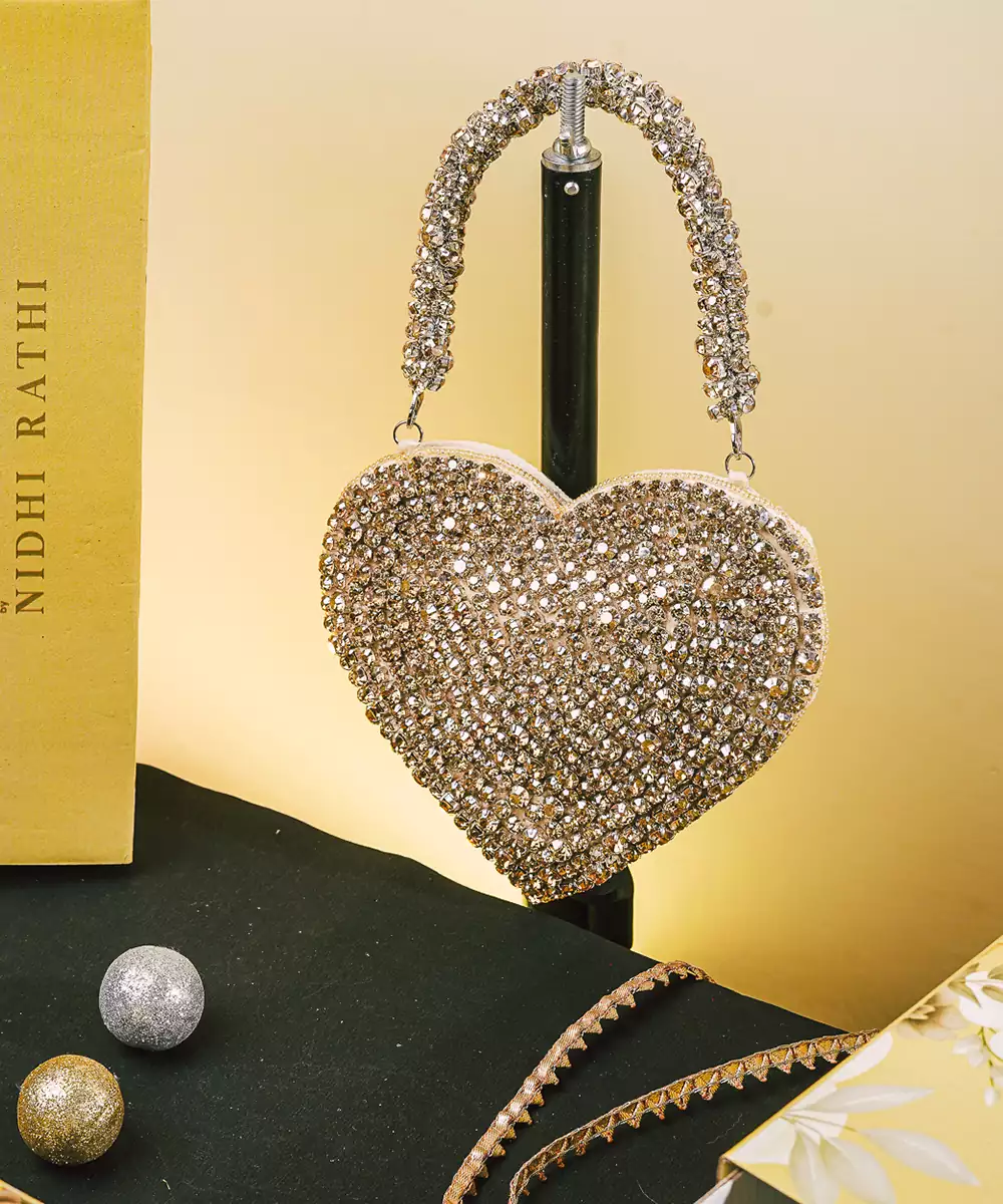 Heart Shaped Purse Clutch In Radiant Gold Tone With Luxe Diamond Embellishments. Features A Gem Studded Wrist Loop For Elegant And Secure Carry. Button Closure Secures Essentials Inside The Spacious Main Compartment. Chic And Dazzling—Perfect For Receptions, Anniversary Dinners, Or Bridal Events. Style Note: Pair With Metallic Gowns, Embellished Sarees, Or Romantic Fusion Wear To Echo The...