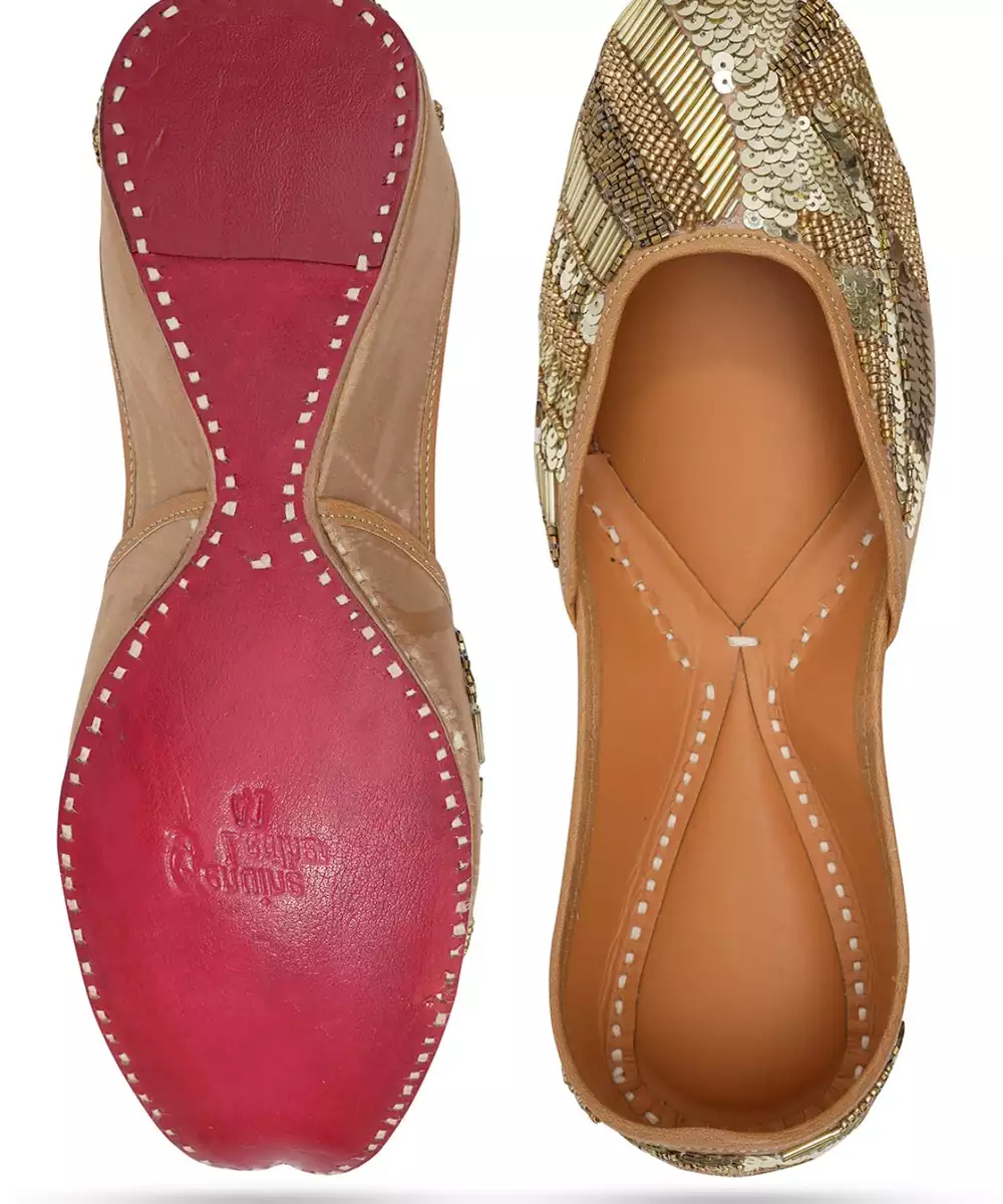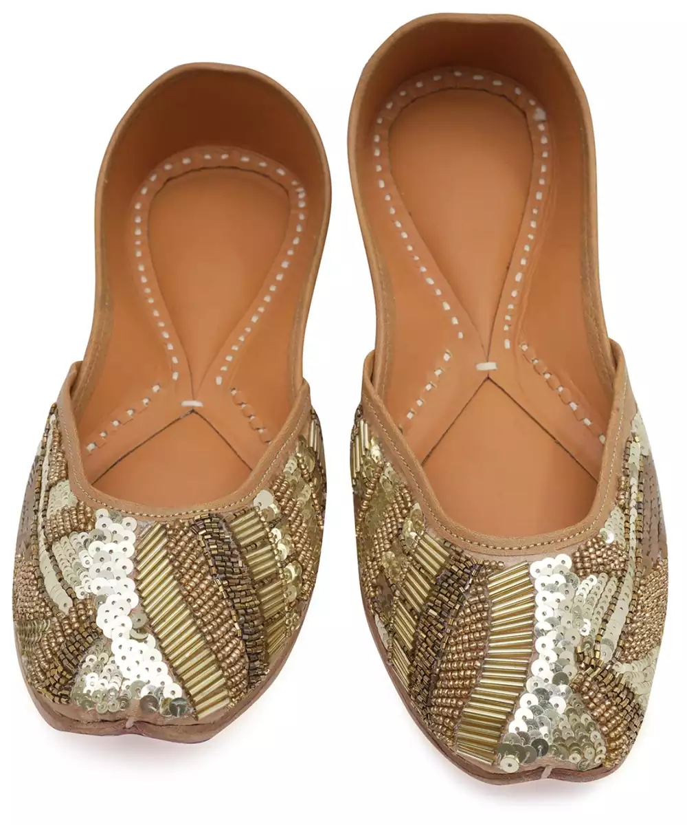 These Gold Embroidered Leather Mojaris Are A Perfect Blend Of Tradition And Elegance. Handcrafted From Premium Leather, They Feature Delicate Embroidery That Adds A Touch Of Sophistication. Comfortable And Stylish, They Pair Beautifully With Ethnic And Festive Outfits, Making Them An Ideal Choice For Weddings, Celebrations, And Special Occasions.