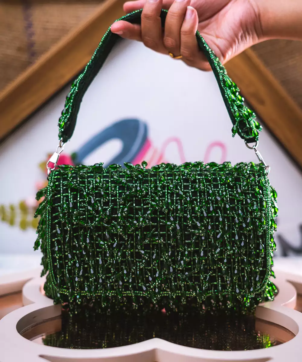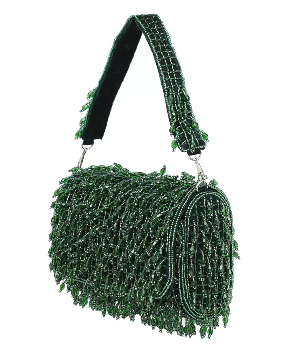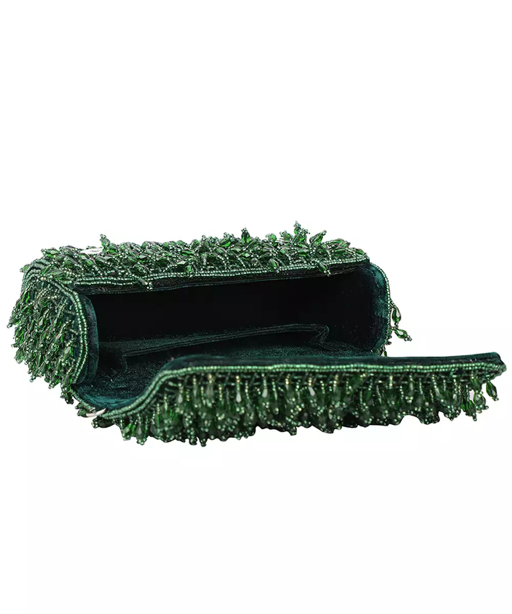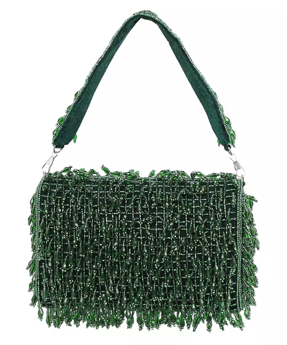 Rich Green Foldover Clutch With Intricate Embroidery And Shimmering Embellishments. Designed With A Sleek Wrist Loop For Easy, Graceful Carrying. Button Closure Secures One Roomy Compartment For Essentials. An Elegant Pick For Receptions, Mehendi Functions, Or Evening Galas. Style Note: Pair With Contrasting Golden Ensembles Or Layered Silks To Spotlight Its Festive Glam.