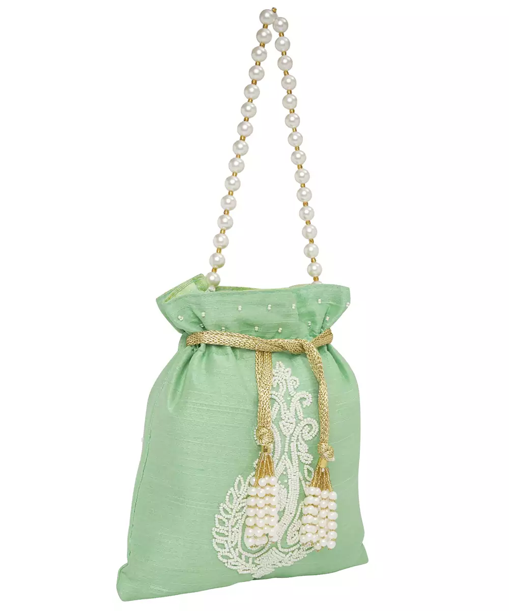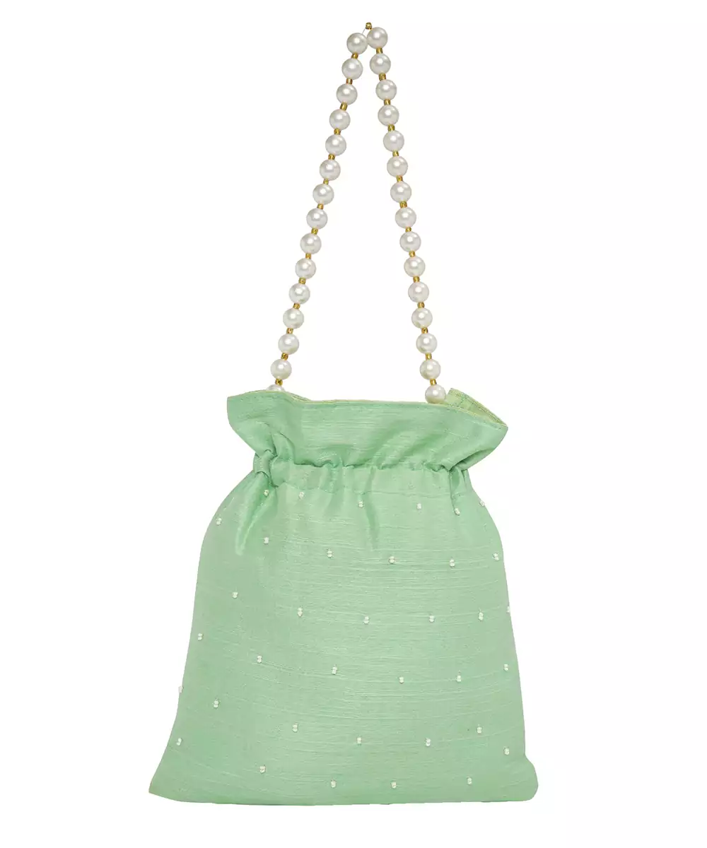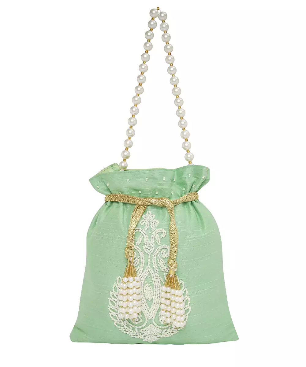 Ethnic Potli Clutch In A Fresh Sea Green Base, Adorned With White And Gold Toned Embroidery For A Rich Finish. Features A Drawstring Closure Securing One Spacious Main Compartment. Wrist Loop Offers Effortless Charm And Traditional Ease. Ideal For Haldi Rituals, Housewarming Pujas, Or Festive Day Events. Style Note: Complement It With Ivory Chikankari Sets Or Contrast Dhoti Kurta Ensembles For...
