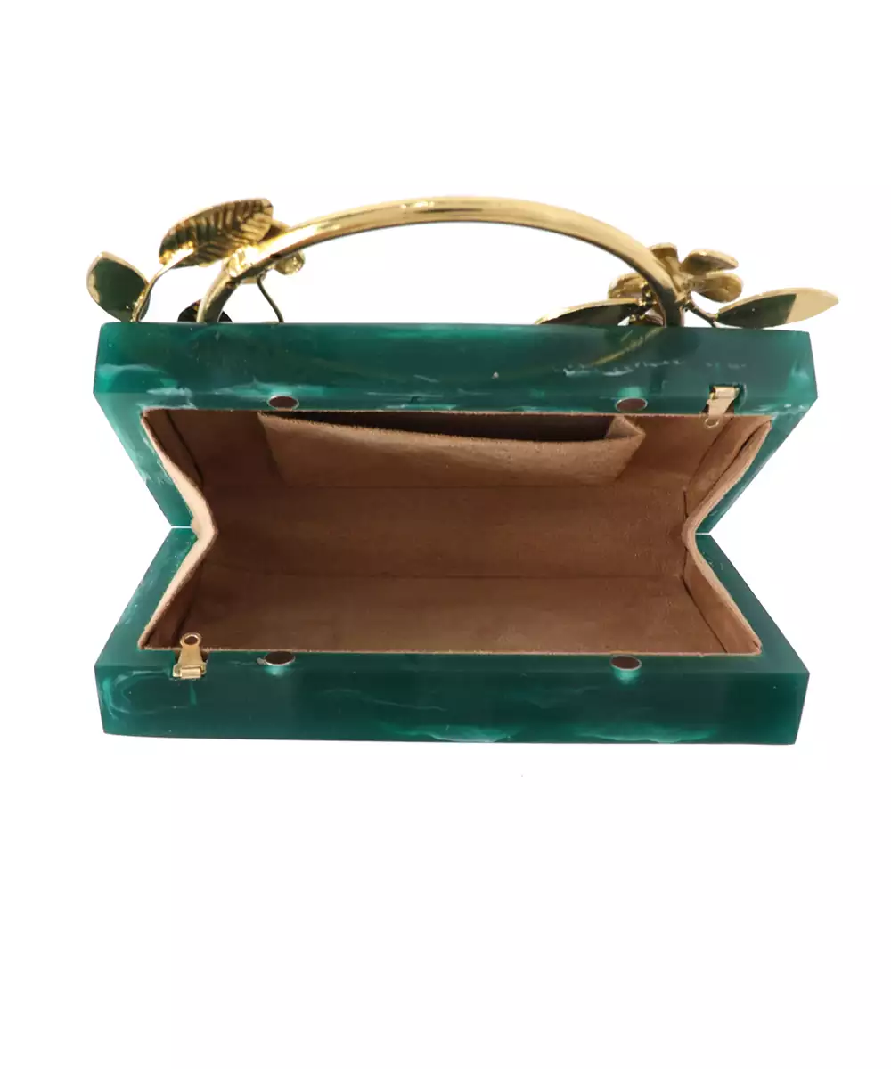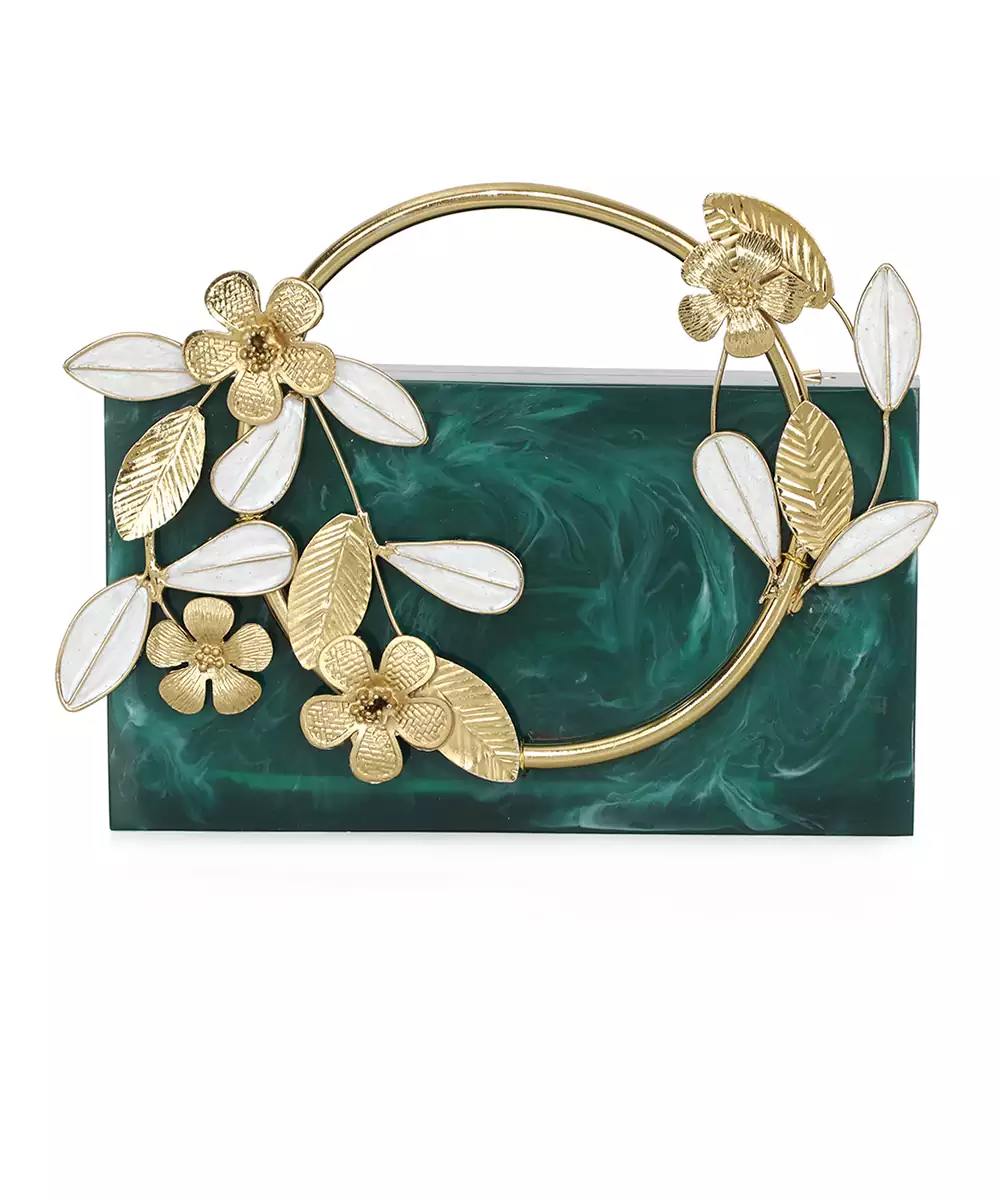 Chic Box Clutch Featuring Intricate Floral Embellishments In Green, Gold Toned, And White Hues. Comes With A Detachable Shoulder Strap For Versatile Styling—Carry It Or Sling It. Secure Click Lock Closure Reveals One Roomy Main Compartment For Your Party Essentials. Ideal For Sangeet Nights, Mehendi, Or Festive Brunches. Style Note: Pair It With Embroidered Anarkalis Or Pastel Sarees To Elevate...