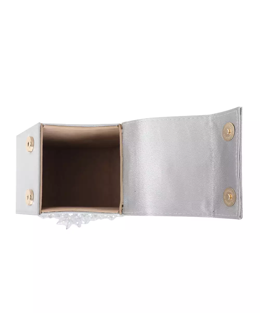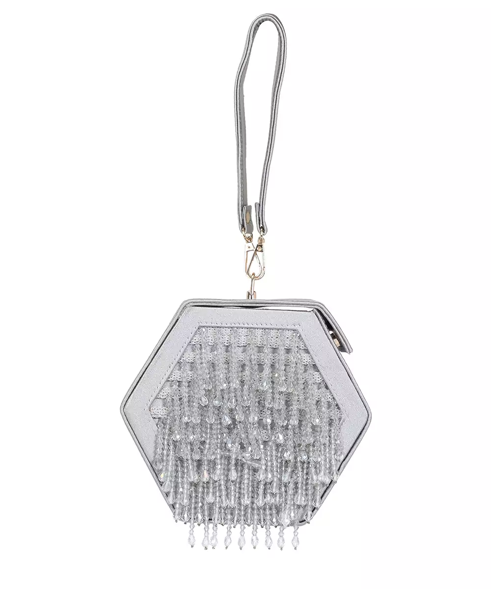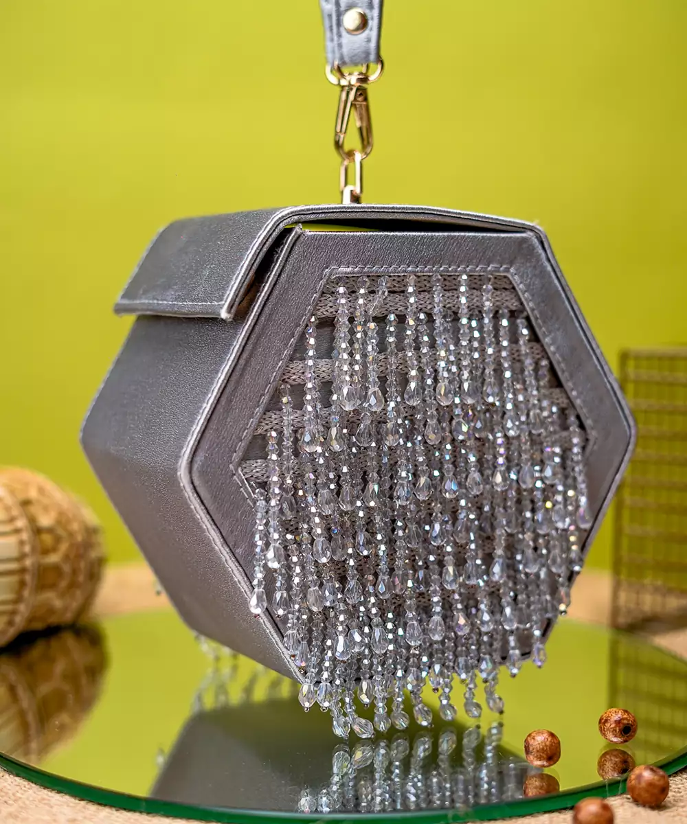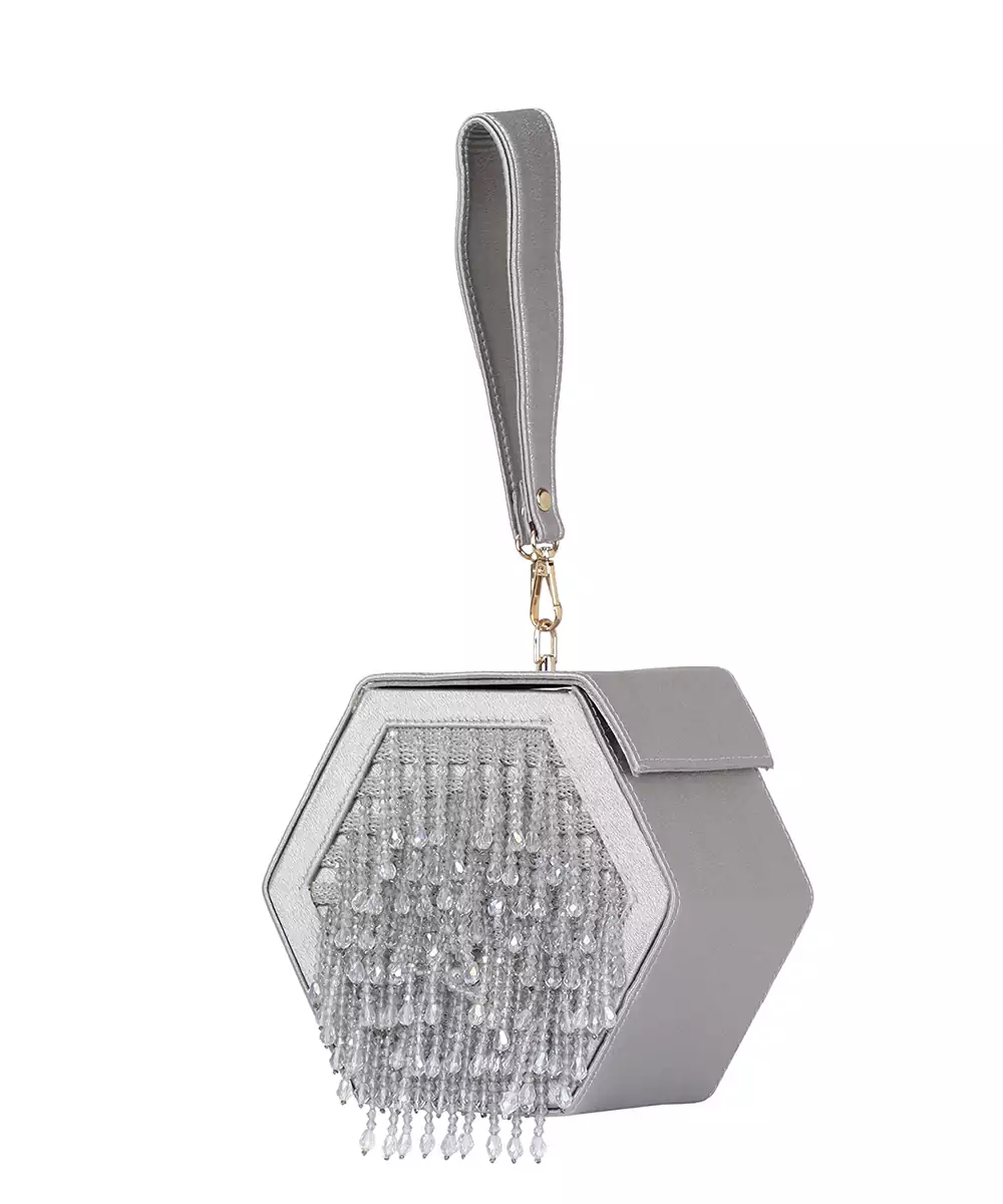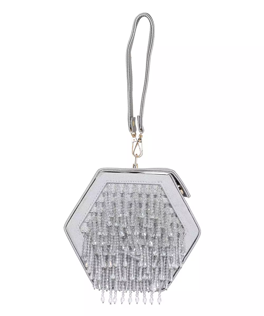 Box Clutch In Muted Grey, Finished With Striking Hexagon Shaped Embellishments. Designed With A Wrist Loop For Easy, Elegant Carry. Tasselled Trims Add Festive Movement And Visual Interest. Button Closure Secures The Spacious Main Compartment For Your Essentials. Style Note: Pair With Silver Accented Sarees Or Monochrome Indo Western Sets To Highlight The Clutch’s Sculptural Chic.