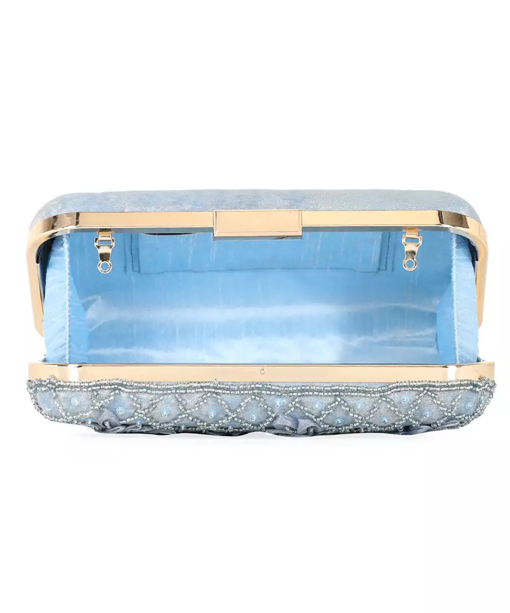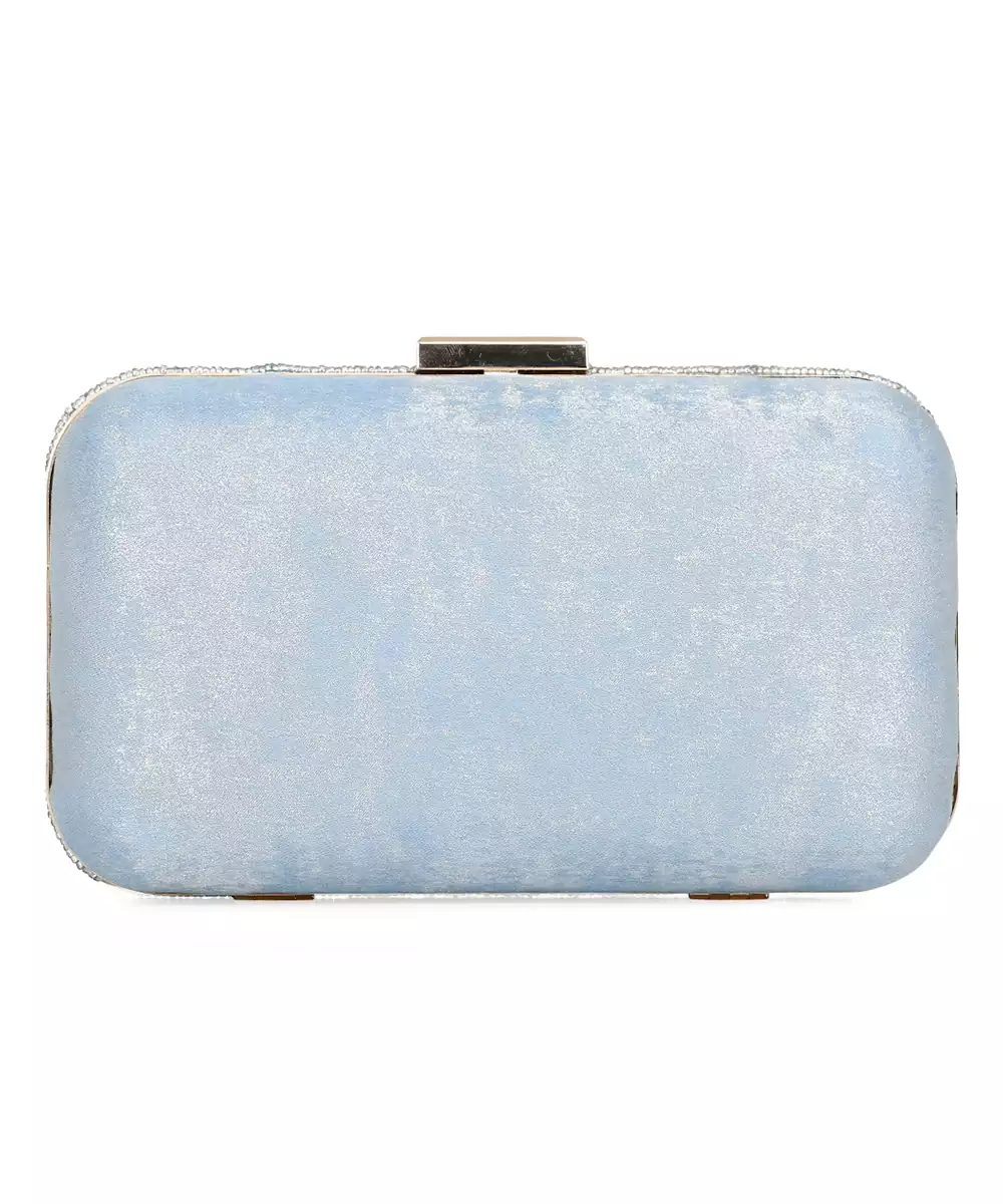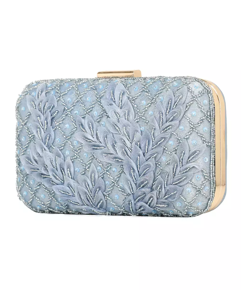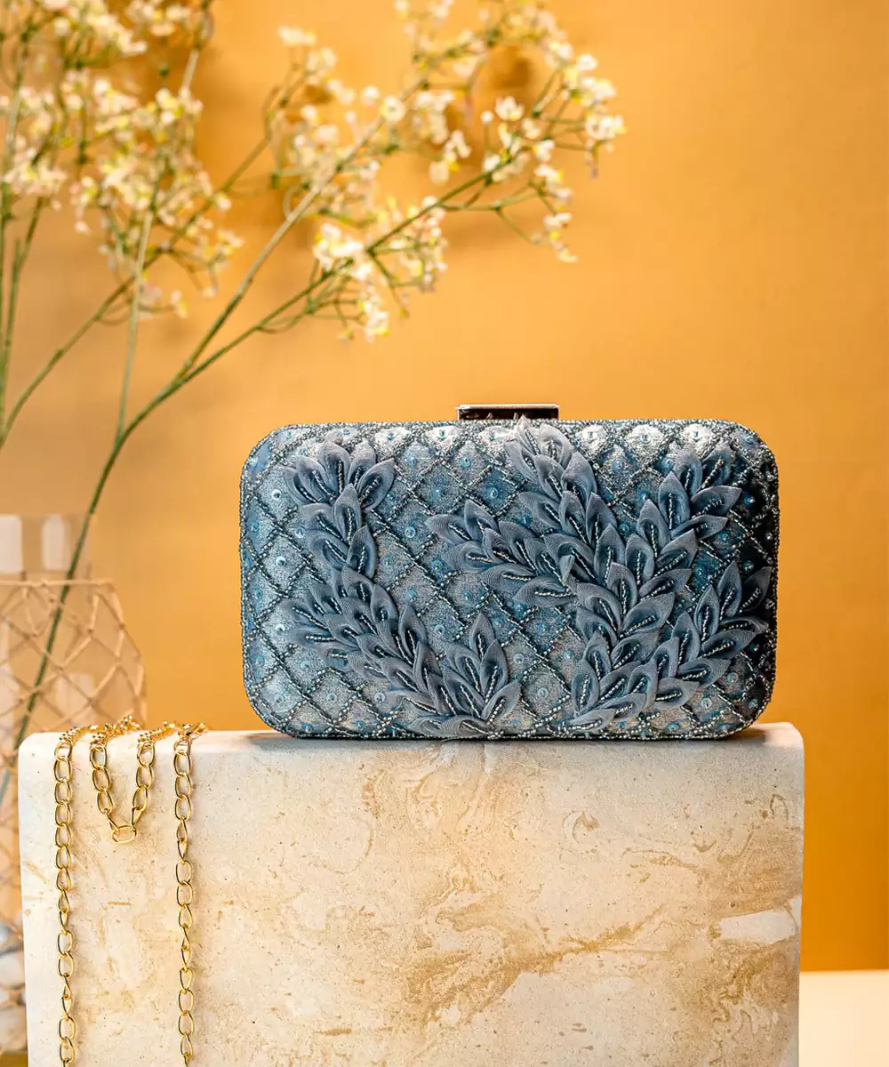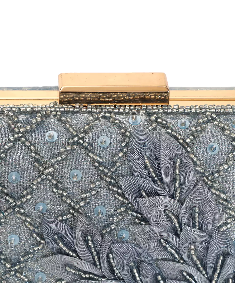 Luxe Box Clutch In Grey With Silver Toned Embellishments For A Glamorous Touch. Includes A Detachable Shoulder Strap For Versatile Styling Options. Click Lock Closure Opens To A Spacious Single Compartment For Essentials. Refined Accessory For Cocktail Evenings, Receptions, Or Festive Outings. Style Note: Pair With Metallic Sarees Or Sequined Gowns For A Dazzling, Statement Worthy Finish. Feel...
