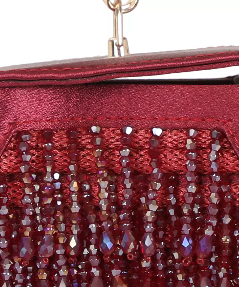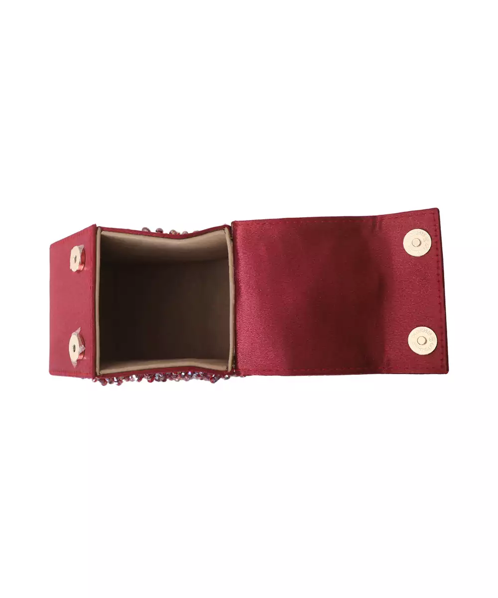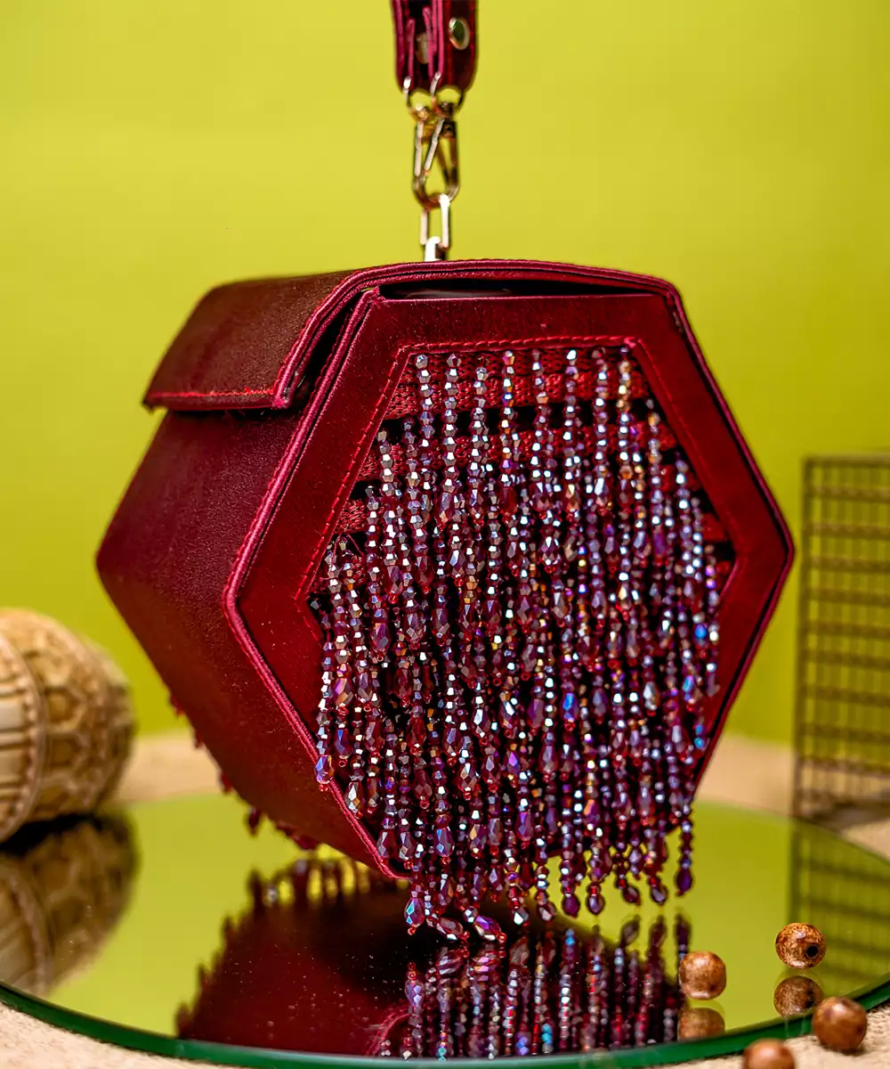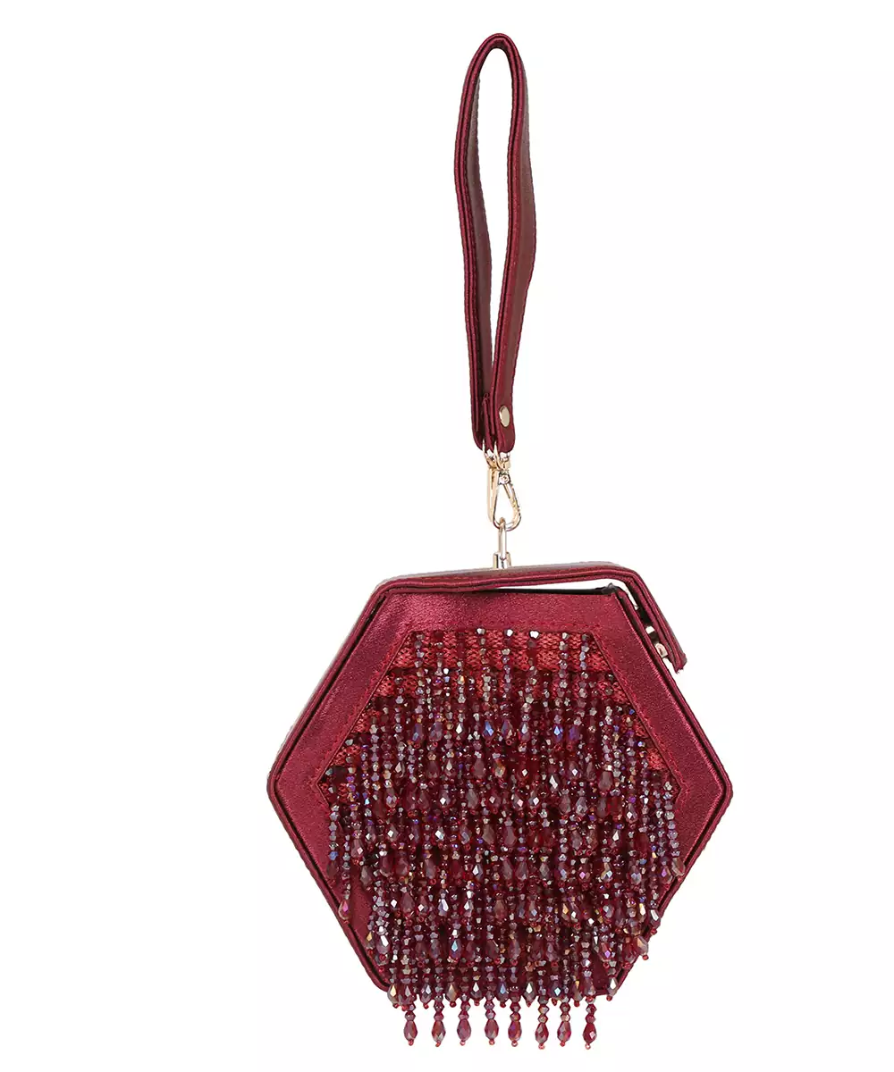 Box Clutch In Deep Maroon, Highlighted With Hexagon Shaped Embellishments For Structured Elegance. Comes With A Matching Wrist Loop For Secure And Stylish Carry. Tasselled Accents Add Festive Texture And Movement. Button Closure Secures The Spacious Main Compartment For Evening Essentials. Style Note: Pair With Wine Toned Lehengas Or Gold Bordered Sarees To Echo The Clutch’s Regal Vibe.