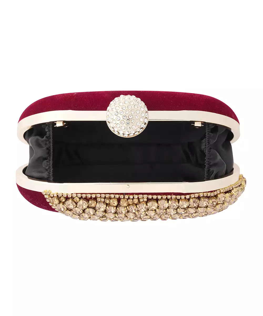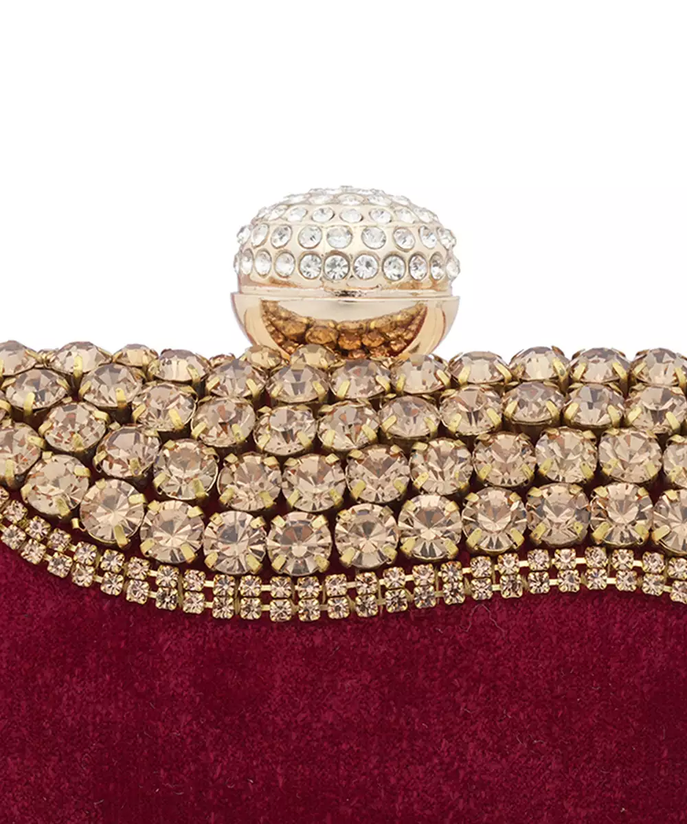 Regal Box Clutch In Rich Maroon Base Adorned With Dazzling Gold Toned Diamond Embellishments. Features A Detachable Shoulder Strap For Seamless Shift Between Handheld And Sling Styling. Twist Lock Closure Opens To A Roomy Main Compartment For Party Essentials. Perfect For Cocktail Evenings, Wedding Receptions, Or Gala Nights. Style Note: Pair It With Zari Woven Sarees Or Structured Velvet Sets...