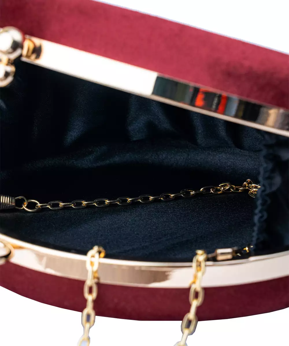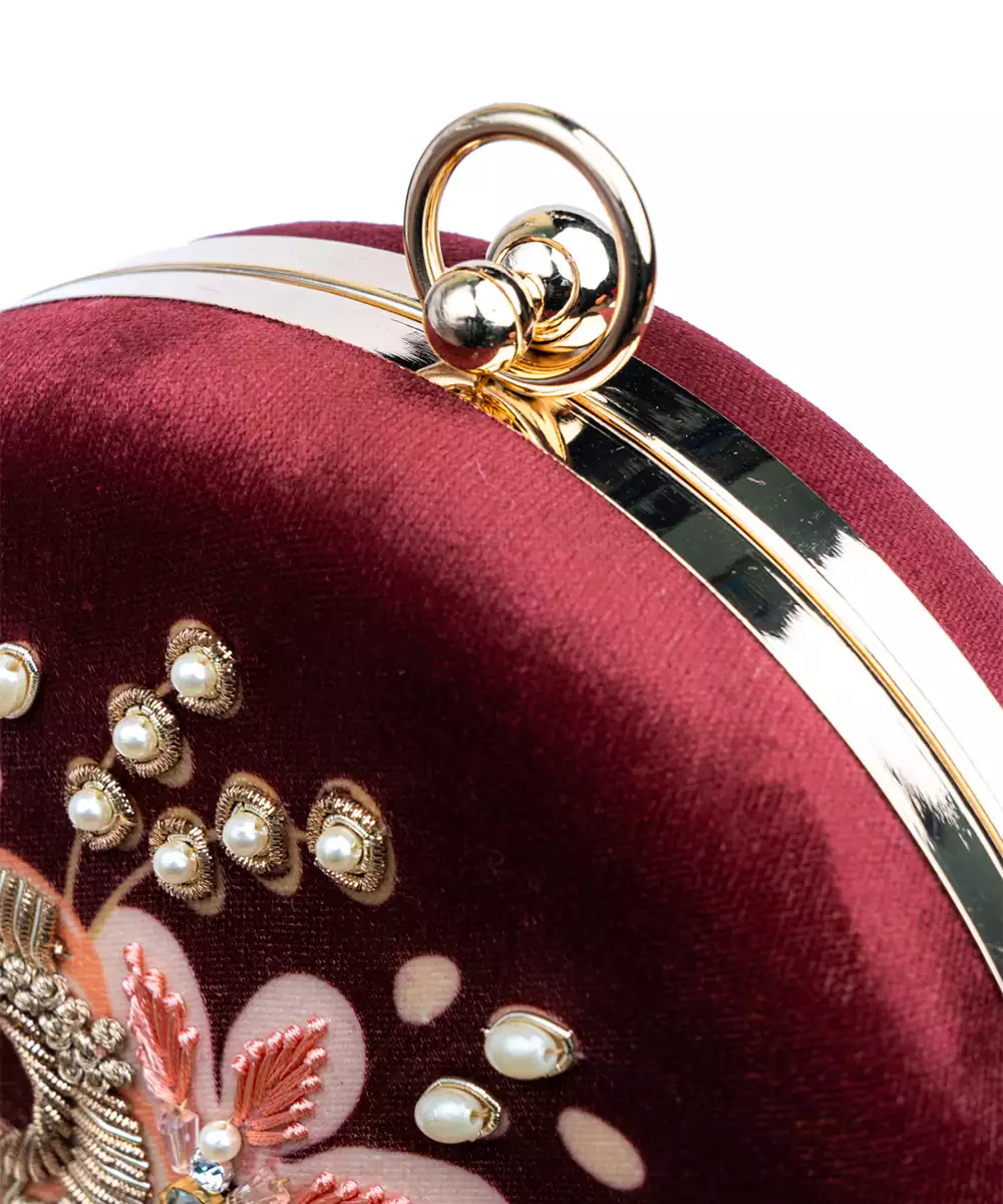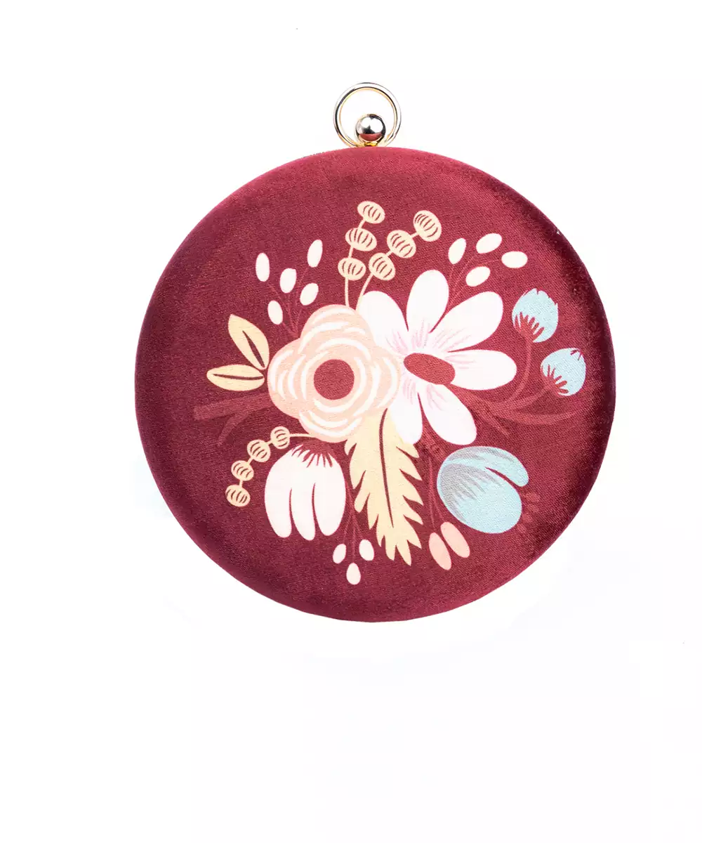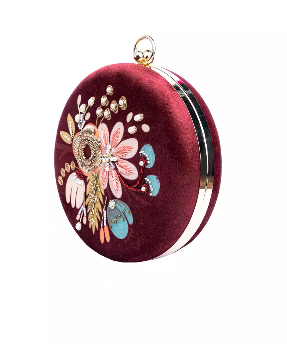 Features Intricate Maroon And Gold Toned Embroidery On A Sleek Round Silhouette. Elegant Circular Design Offers A Modern Twist To Traditional Styles. Includes One Main Compartment Secured With A Twist Closure For Reliable Access. Comes With A Shoulder Strap For Versatile Hands Free Styling. A Regal Accessory Perfect For Weddings, Festive Occasions, And Statement Ethnic Wear.