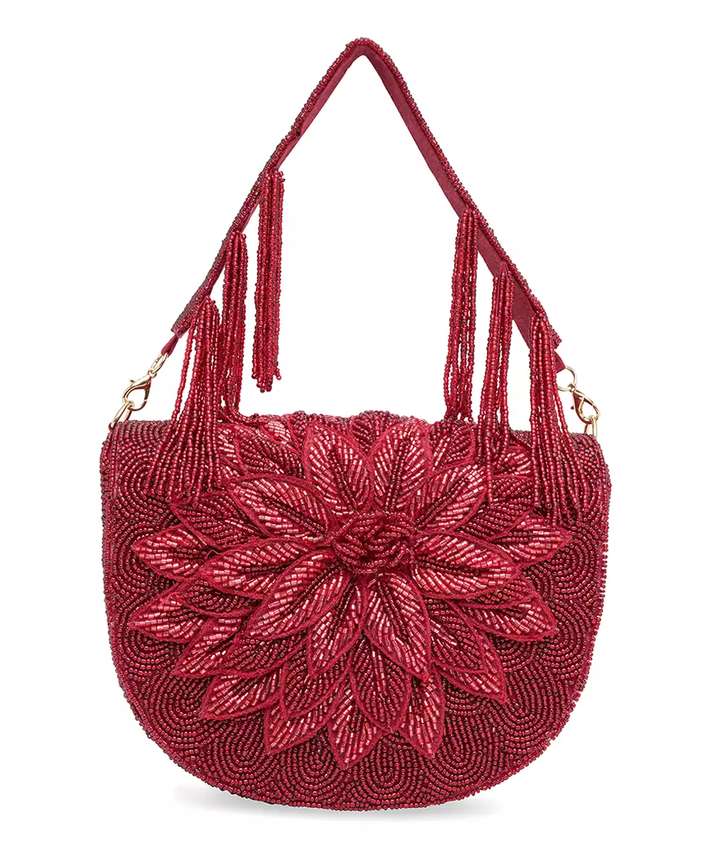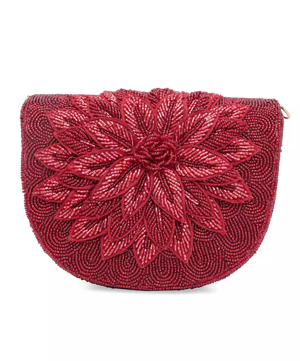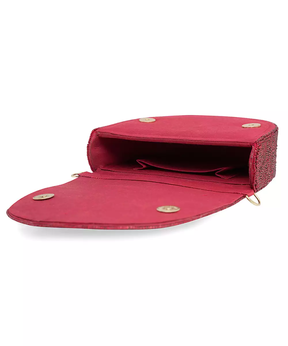 Deep Maroon Silk Base With Intricate Bead Embroidery And Tonal Embellishments. Foldover Silhouette With Button Closure And Wrist Loop For Graceful Carrying. One Main Compartment To Hold Essentials—Lipstick, Cards, Keys. Ideal For Bridal Edits, Festive Gifting, Or Evening Wear. Style Note: Pair With Beige Sarees, Gold Lehengas, Or Wine Toned Gowns For A Rich, Regal Accent.