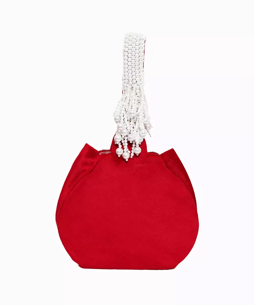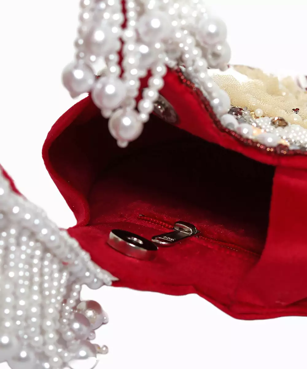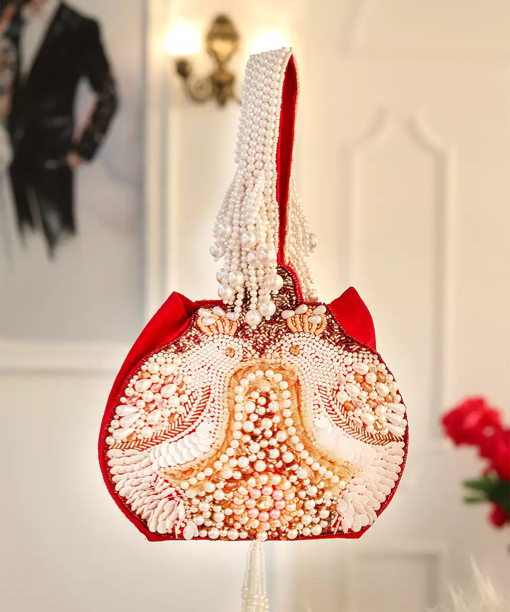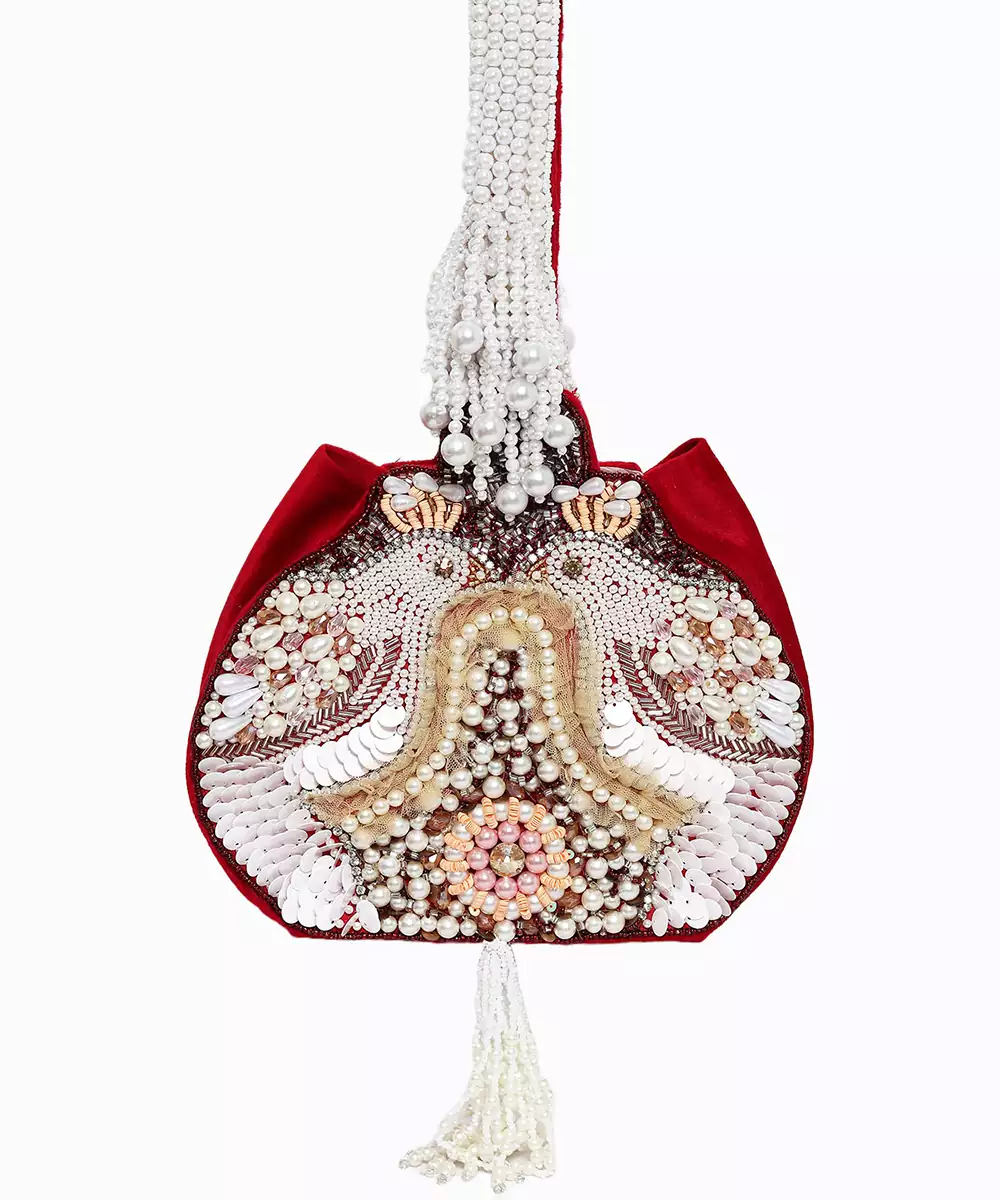 Embroidered In Rich Maroon And Soft Off White For A Sophisticated, Ethnic Aesthetic. Potli Silhouette Adds Traditional Charm And Cultural Depth To Festive Edits. One Main Compartment Secured With A Button Closure For Secure, Stylish Access. Comes With A Shoulder Strap For Hands Free Versatility And Graceful Styling. A Warm Toned Accessory Ideal For Wedding Wear, Gifting Trousseau, Or Elegant...