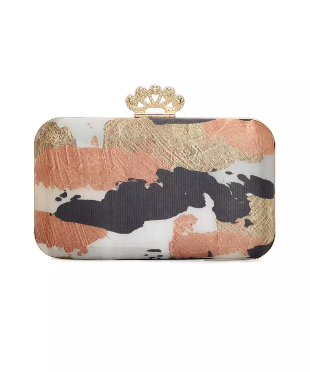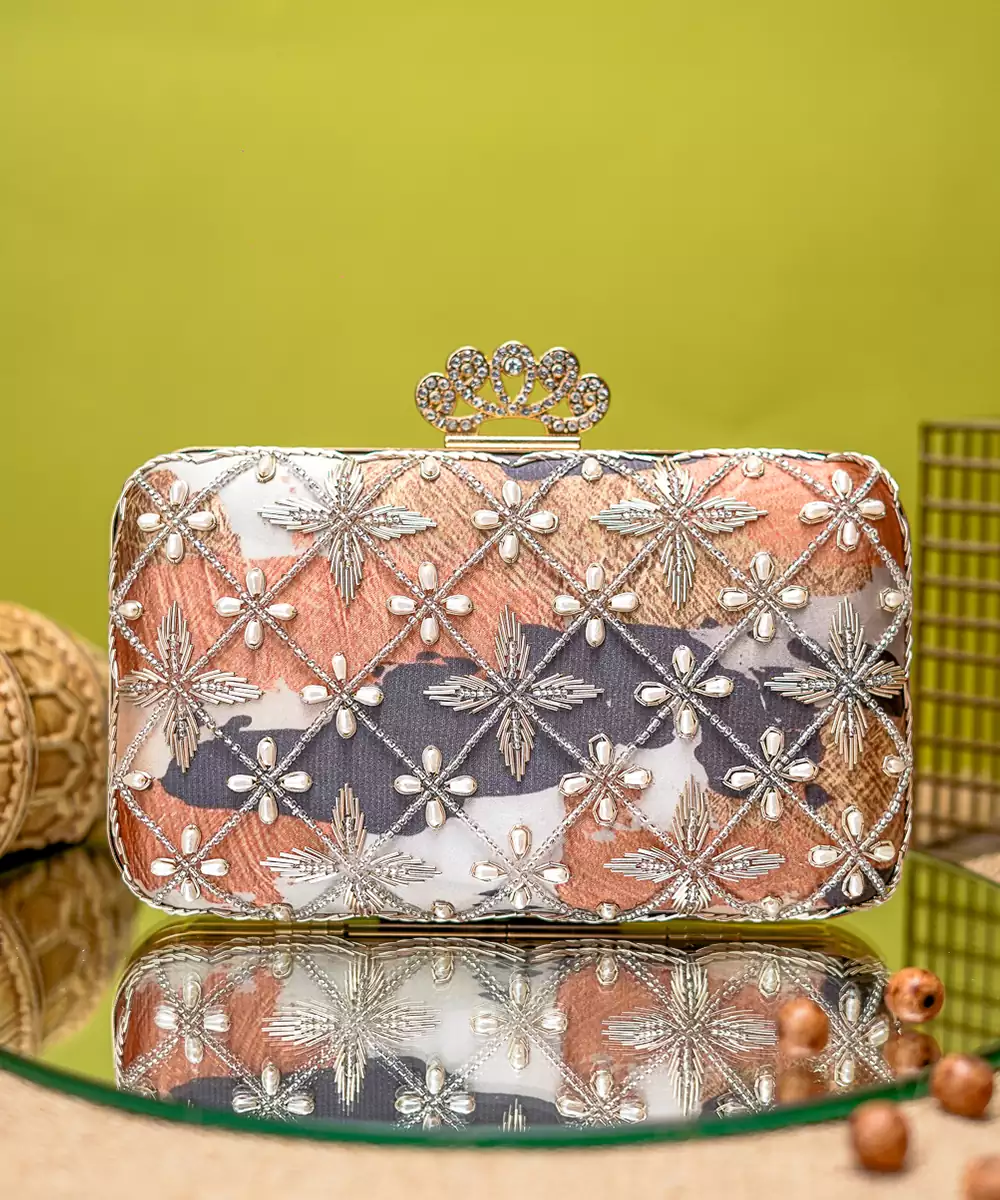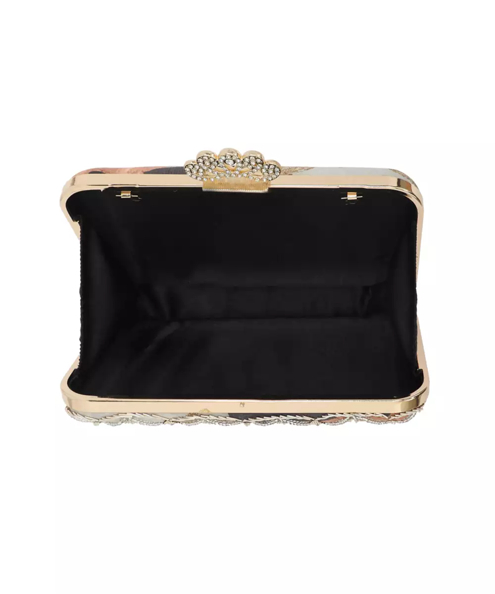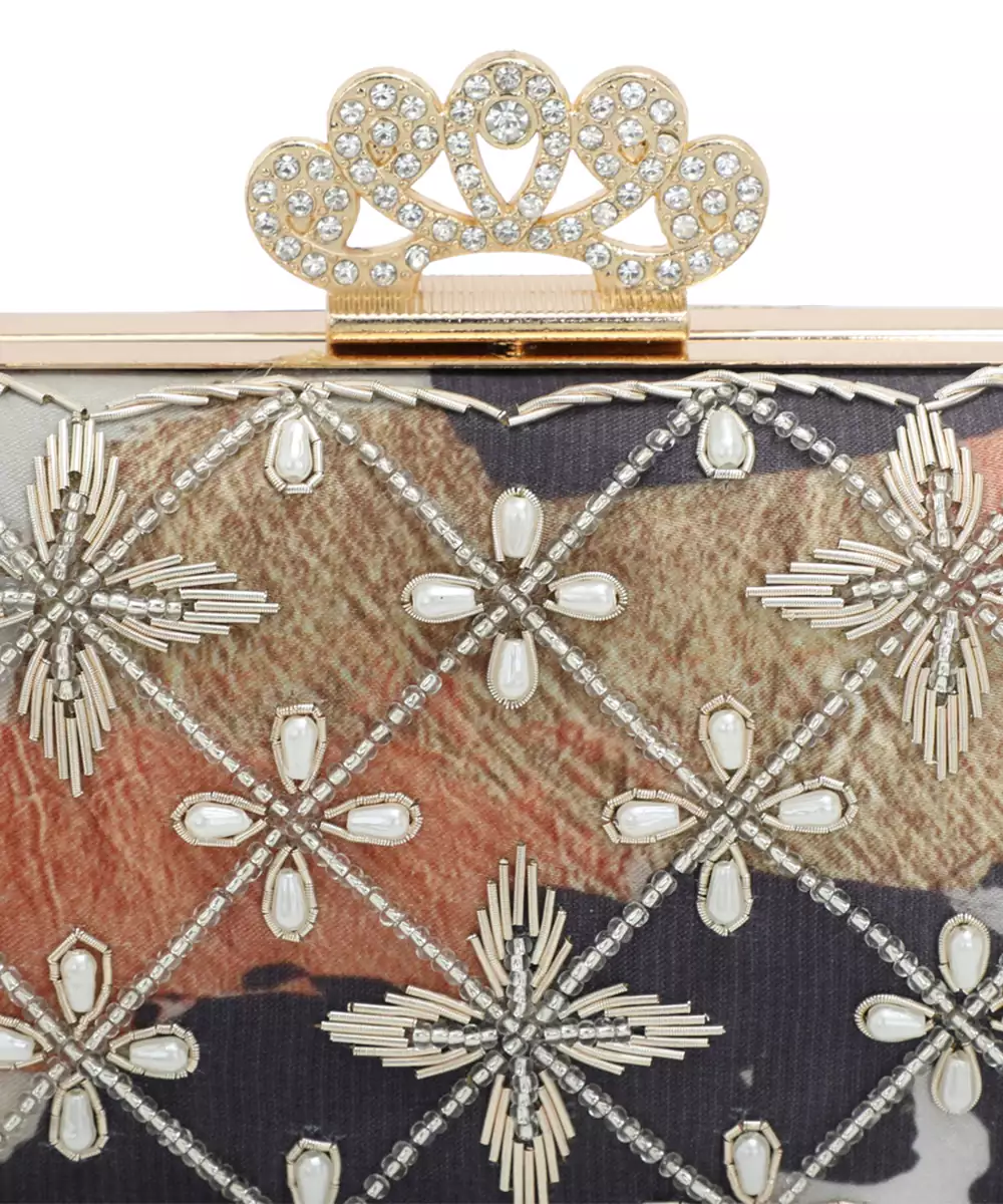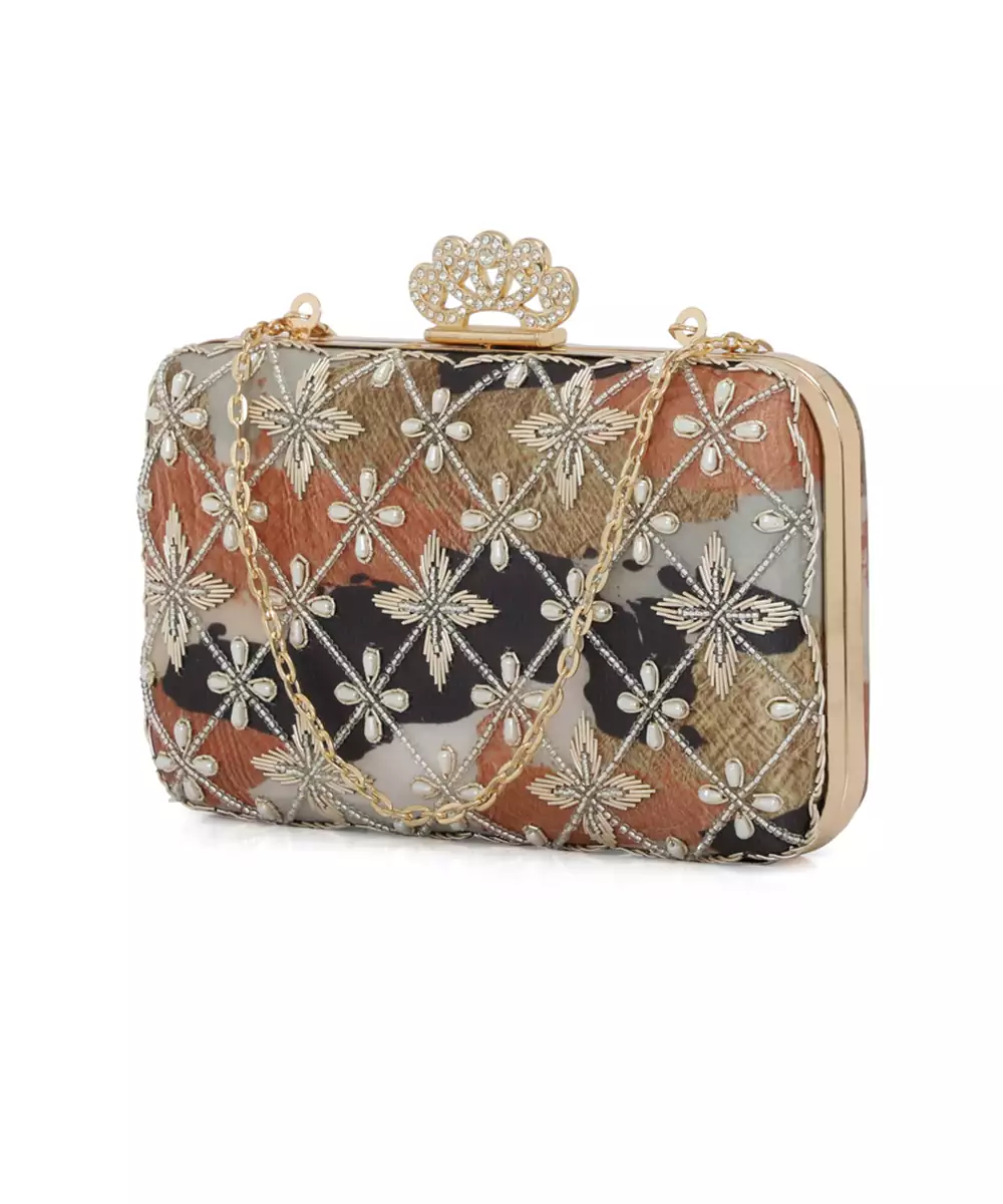Box Clutch Featuring Rich Embroidery In Black, Brown, Gold, And White Tones. Comes With A Detachable Shoulder Strap For Versatile Styling. Click Lock Closure Secures Your Essentials With Ease. Spacious Main Compartment—Ideal For Festive And Formal Occasions. Style Note: Team With Printed Sarees Or Neutral Fusion Wear To Let The Clutch's Multicolored Palette Shine.