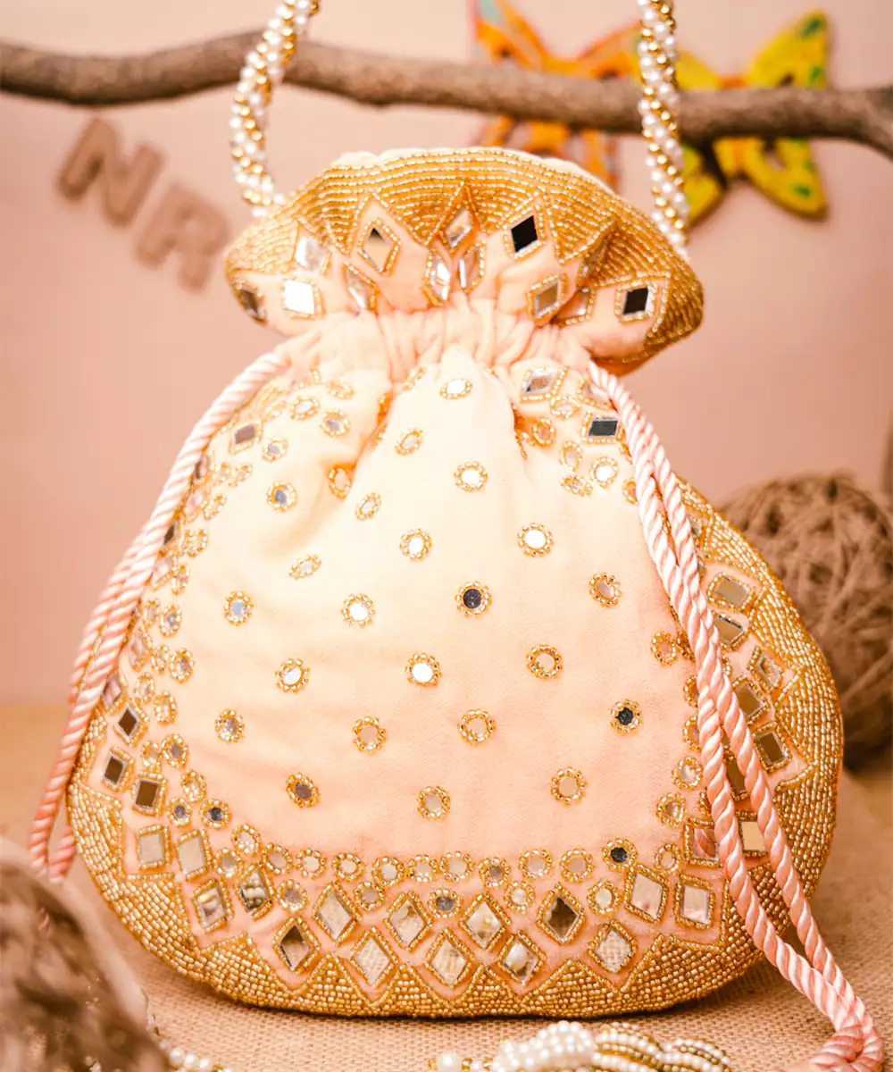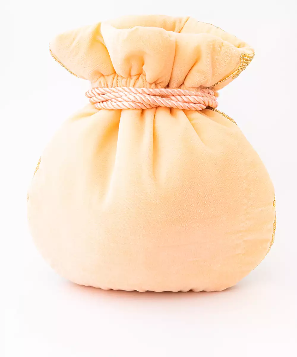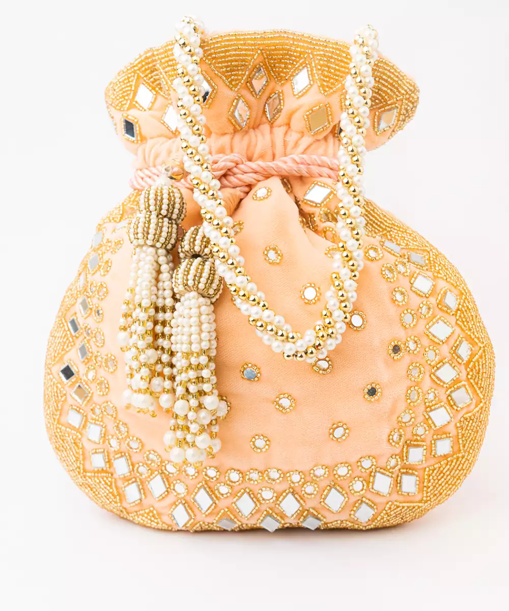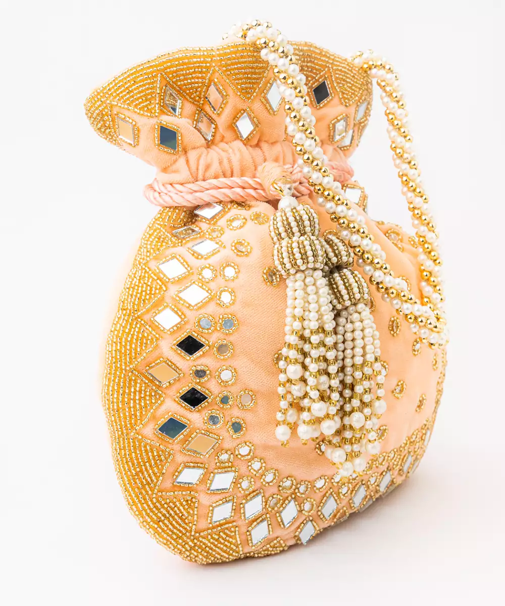 Embroidered In Peach And Gold Tones With Intricate Detailing And Dazzling Mirror Work For Added Sparkle. Traditional Potli Silhouette Enhanced By Drawstring Closure For Secure And Graceful Styling. Includes One Main Compartment Ideal For Carrying Essentials During Festive Occasions. Comes With A Wrist Loop For Ornamental Handheld Elegance And Easy Portability. A Perfect Pick For Weddings, Haldi...