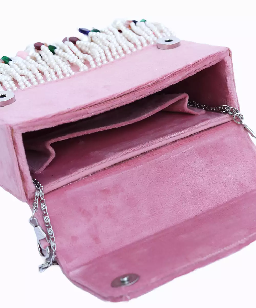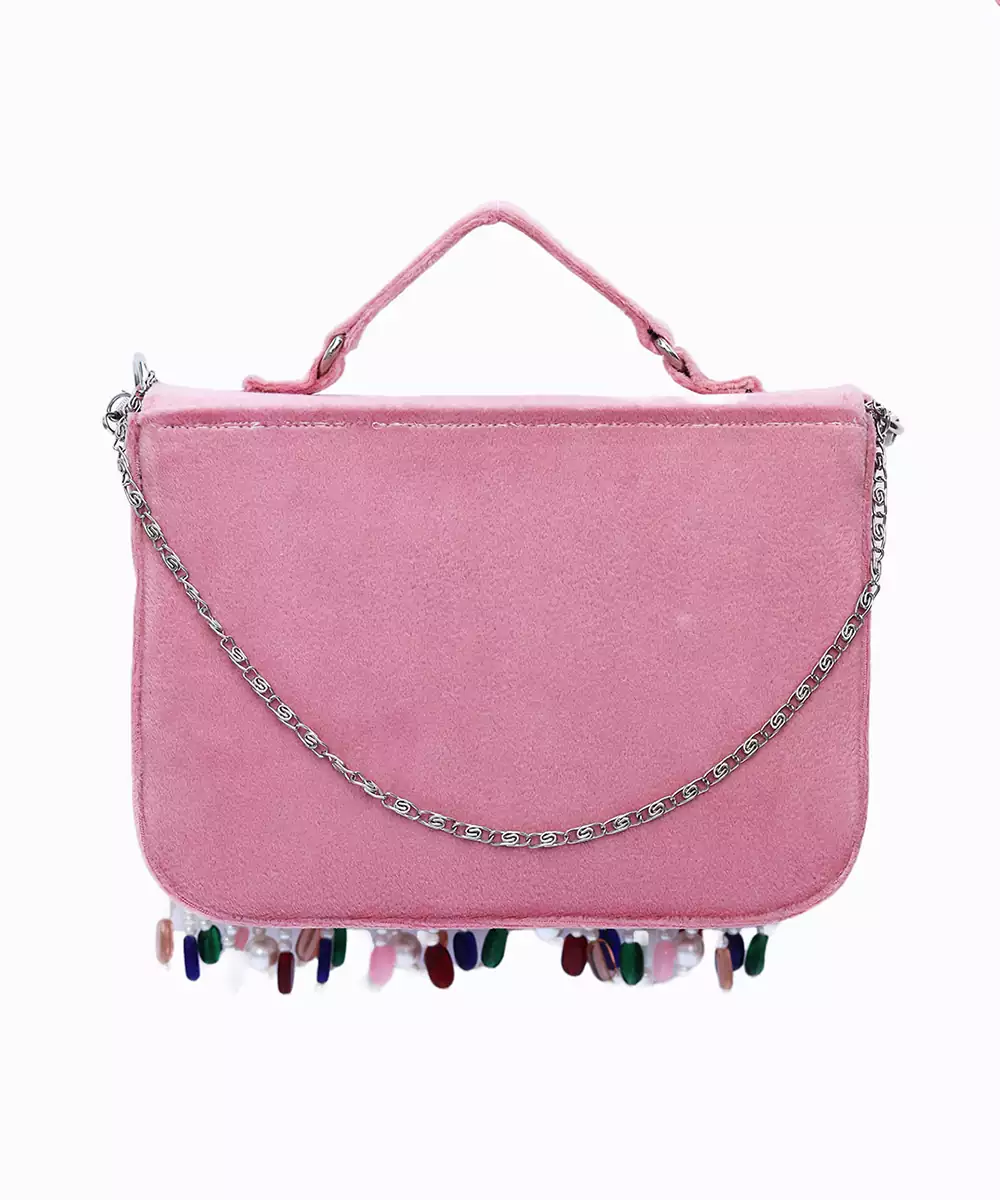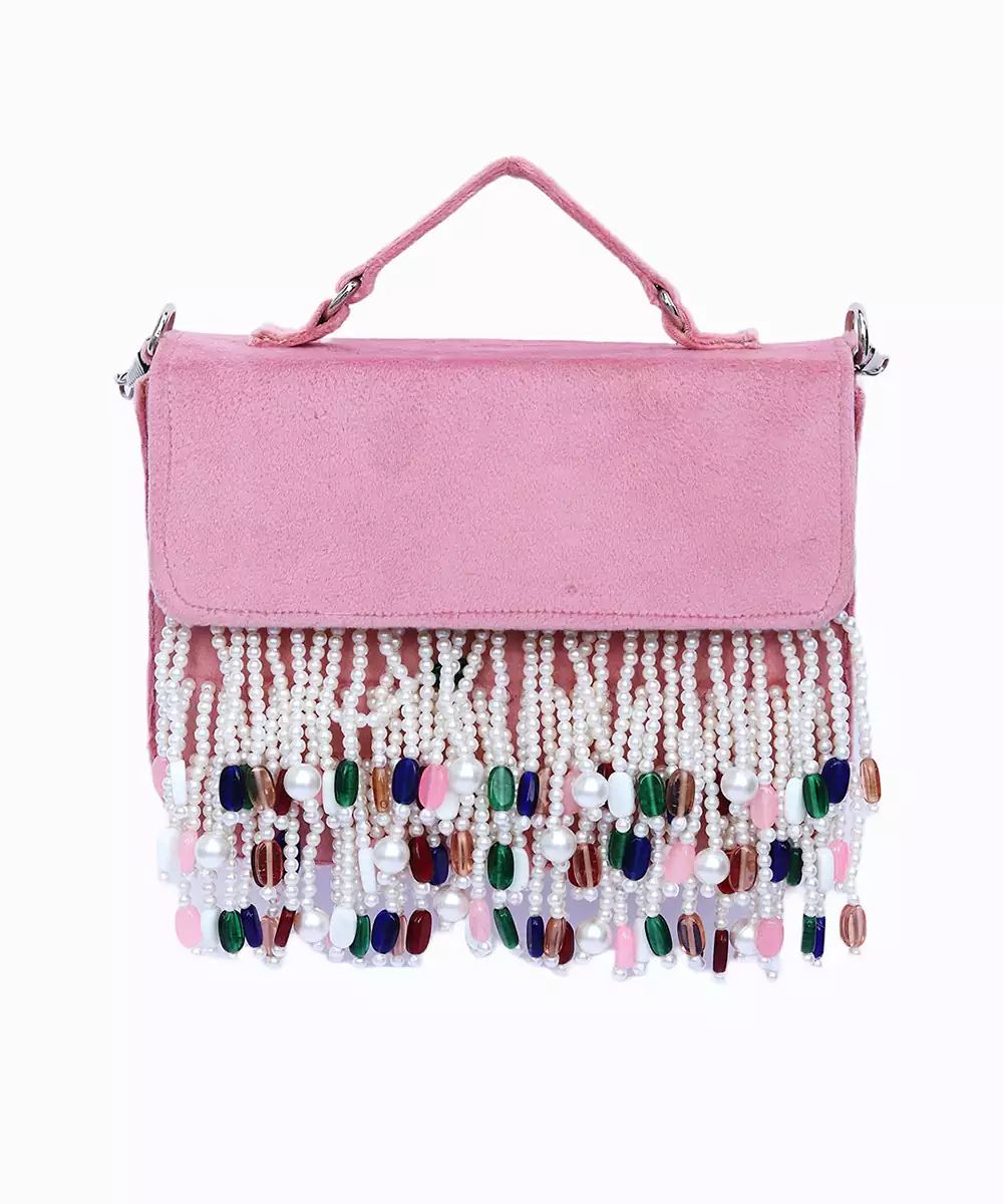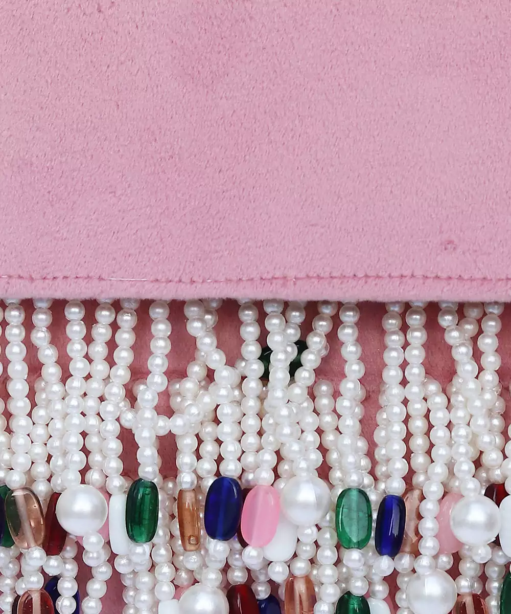 Embellished In Romantic Pink And White Tones For A Feminine, Festive Look. Tassel Detailing Adds Movement And Charm To The Compact Purse Silhouette. One Main Compartment Secured With A Button Closure For Easy And Secure Storage. Comes With A Shoulder Strap For Hands Free Comfort And Versatile Styling. A Sweet Pick For Bridal Edits, Daytime Functions, Or Curated Pastel Gifting Drops.