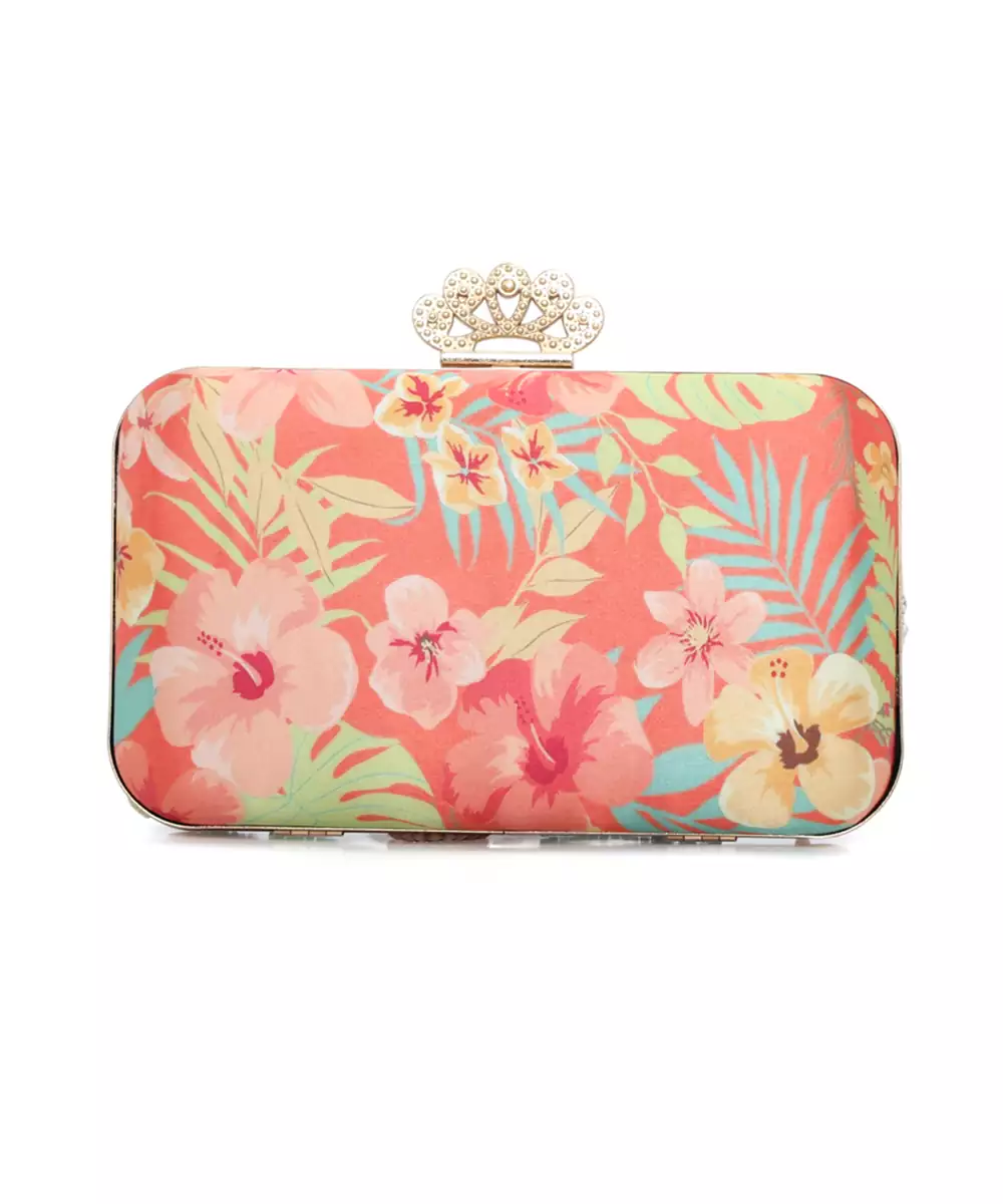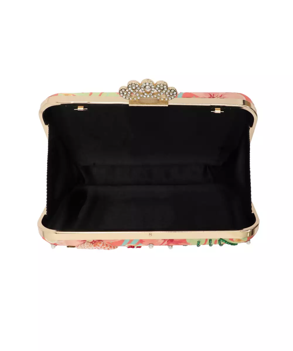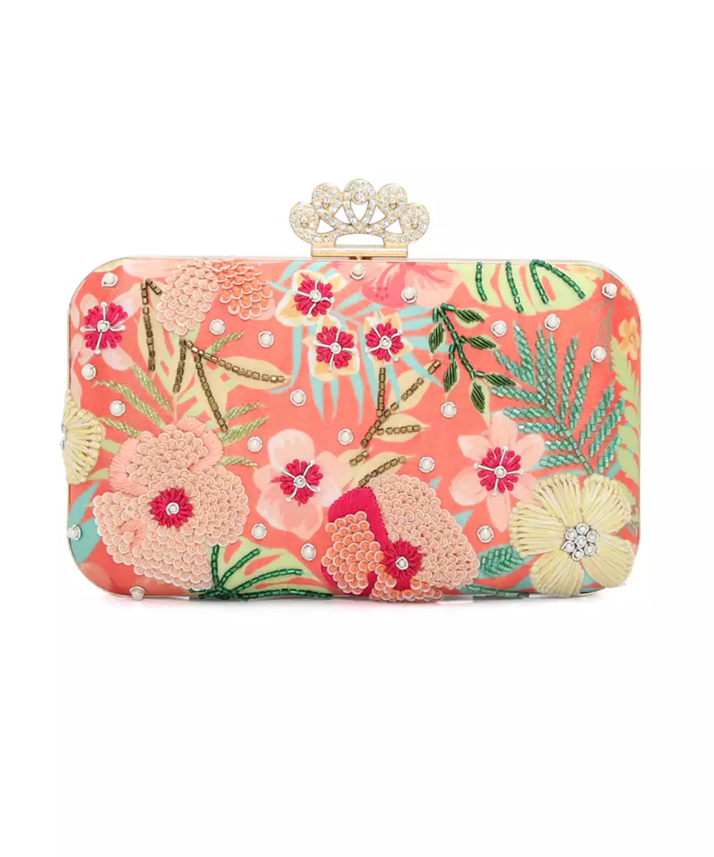 Box Clutch With Pink Floral Print And Detailed Beaded Embroidery. Comes With A Detachable Shoulder Strap For Flexible Styling. Twist Lock Closure Secures The Spacious Main Compartment. Lightweight Yet Statement Making—Ideal For Day Weddings Or Brunch Events. Style Note: Pair With Blush Sarees Or Pastel Dresses To Let The Clutch's Soft Tones Sing.