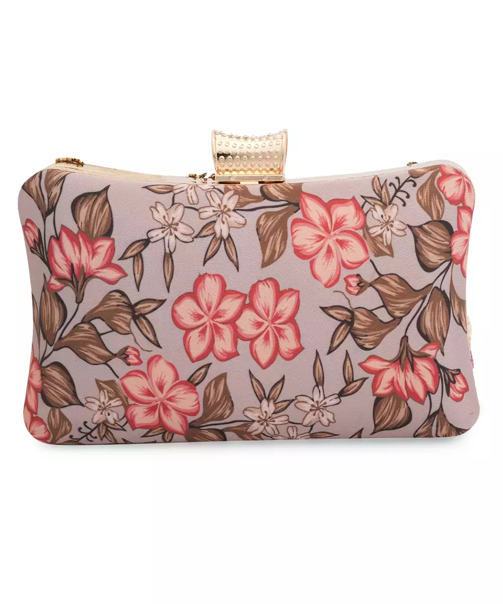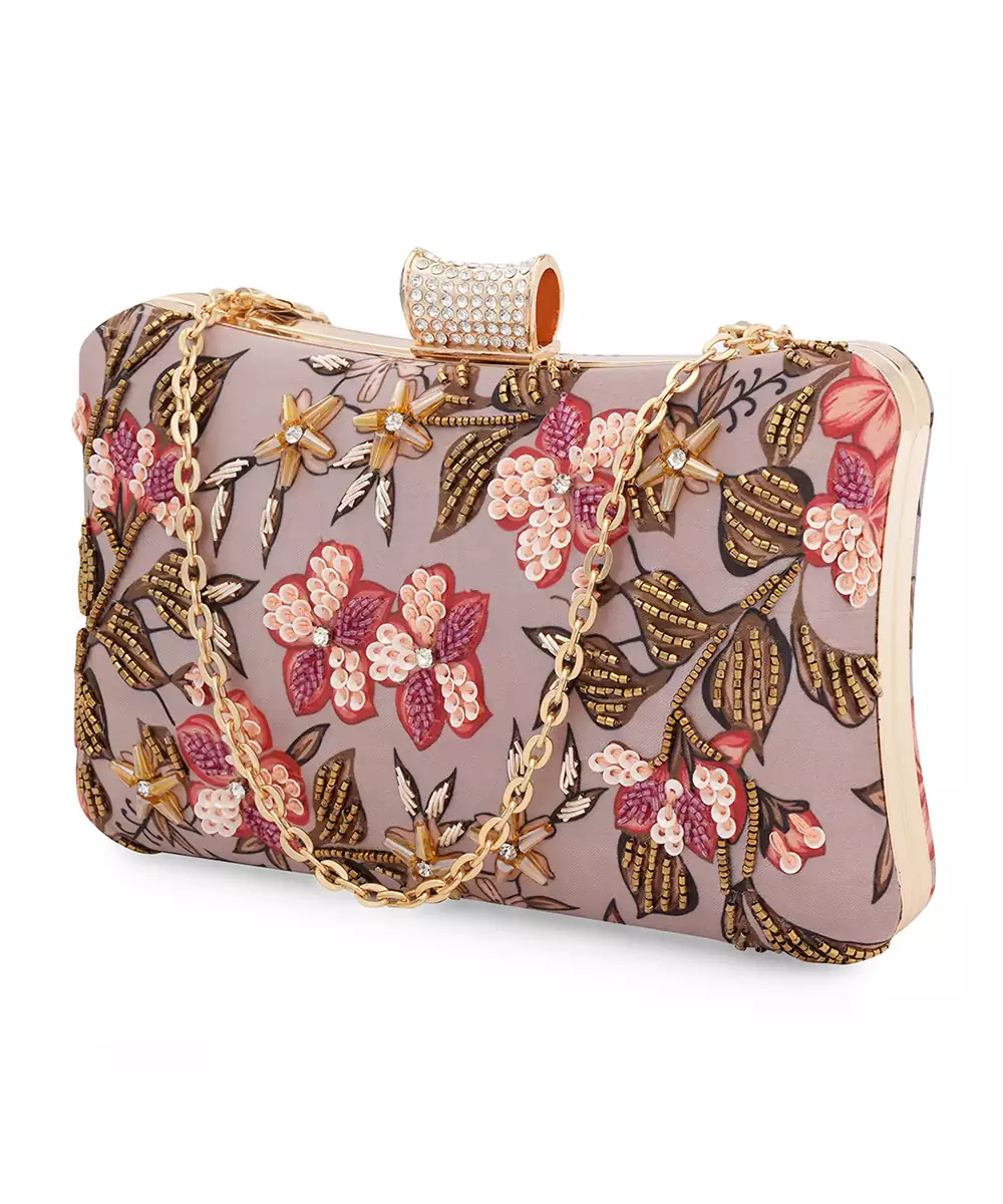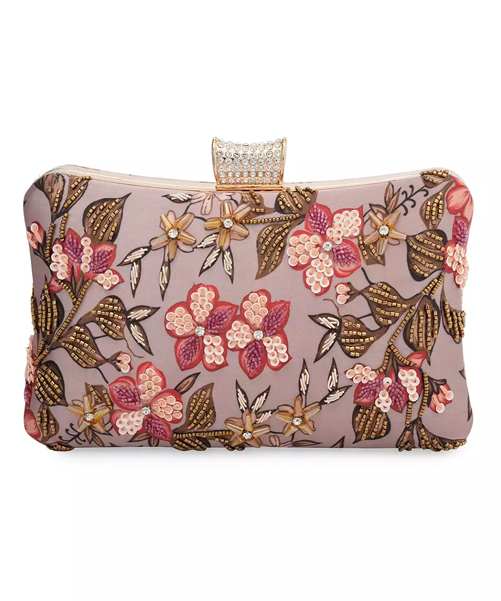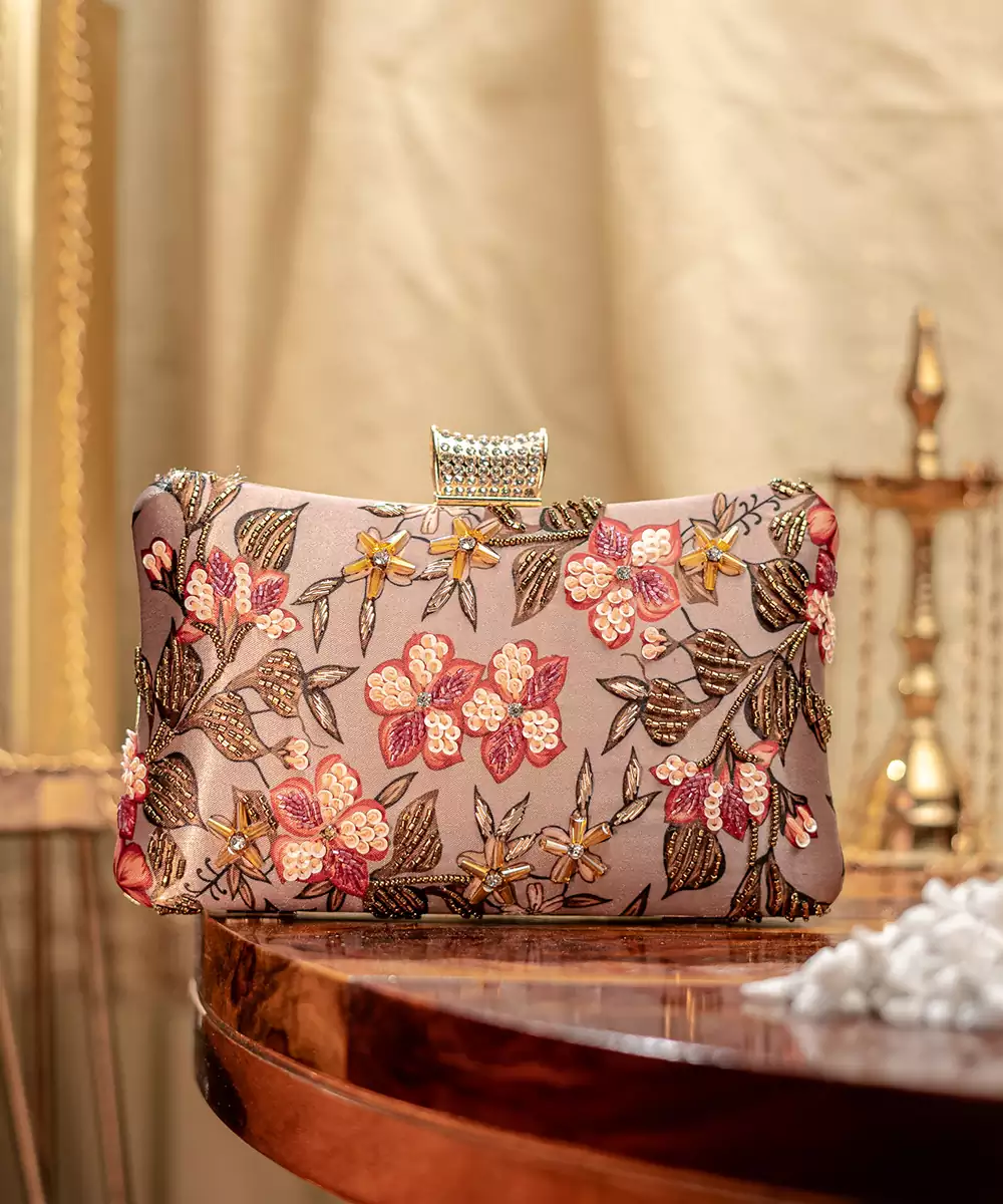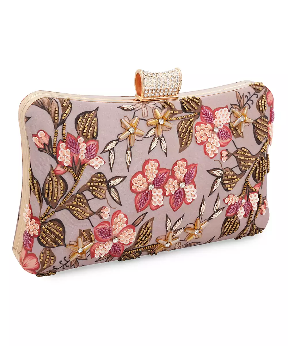 Elegant Box Clutch In Soft Pink With Delicate Floral Embroidery. Includes A Detachable Shoulder Strap For Versatile Styling. Twist Lock Closure Opens To One Spacious Compartment For Essentials. Perfect Pick For Festive Occasions, Daytime Events, Or Gifting. Style Note: Pair With Lace Trimmed Lehengas Or Pastel Shararas For A Dreamy, Feminine Touch.