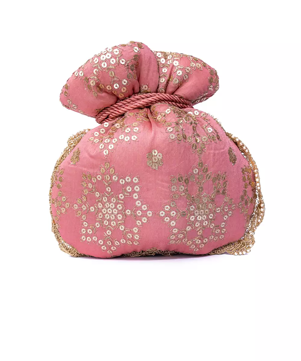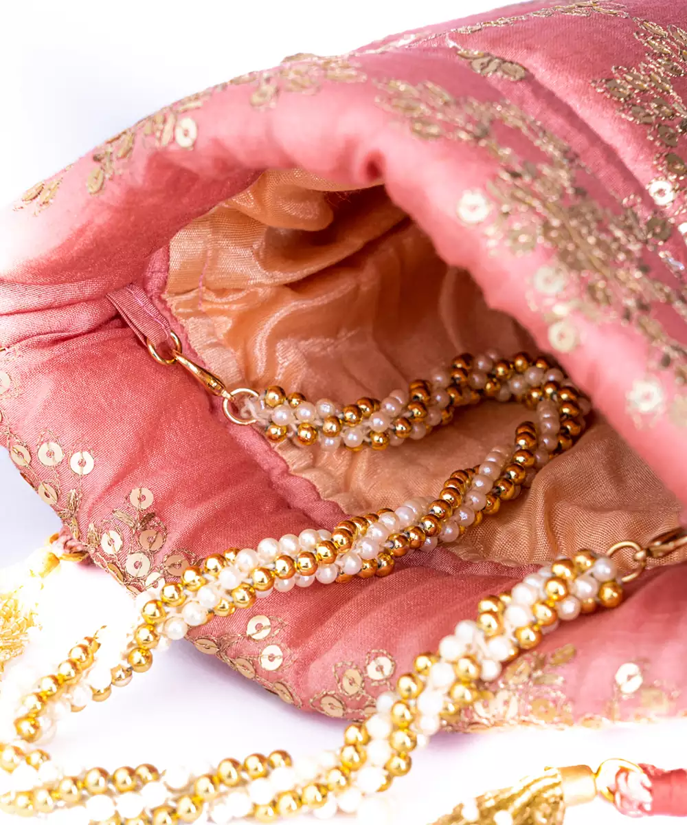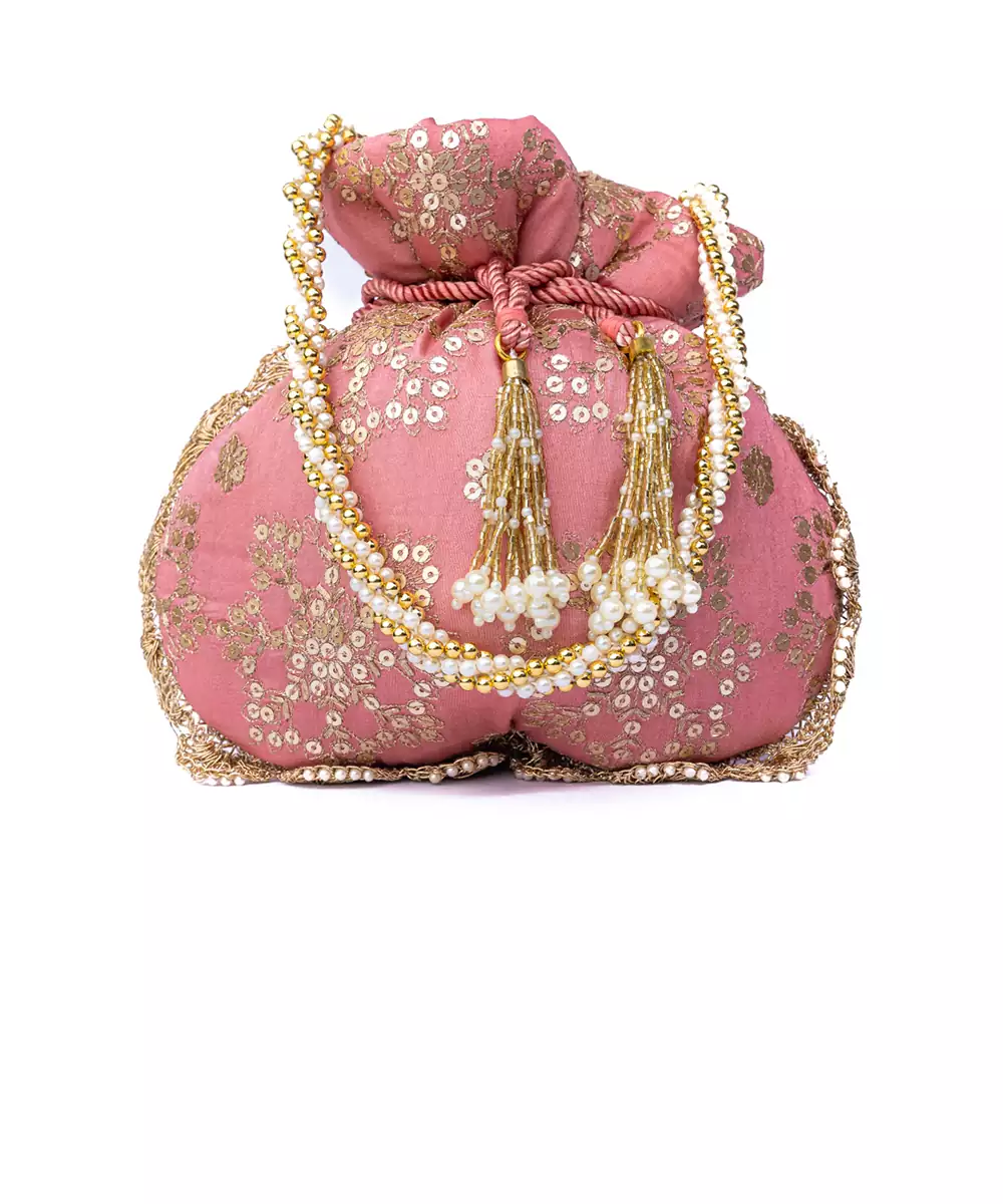 Embroidered In Delicate Light Pink With Gold Accents For A Feminine, Festive Vibe. Potli Silhouette Adds Ethnic Charm And A Touch Of Elegance To Celebration Wear. One Main Compartment Secured With A Drawstring Closure For Accessible Storage. Features A Shoulder Strap For Hands Free Convenience And Versatile Styling. A Beautiful Pick For Haldi, Mehndi, Or Pastel Themed Bridal And Gifting Edits.