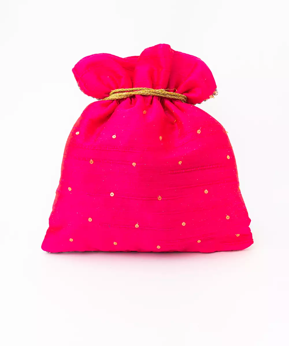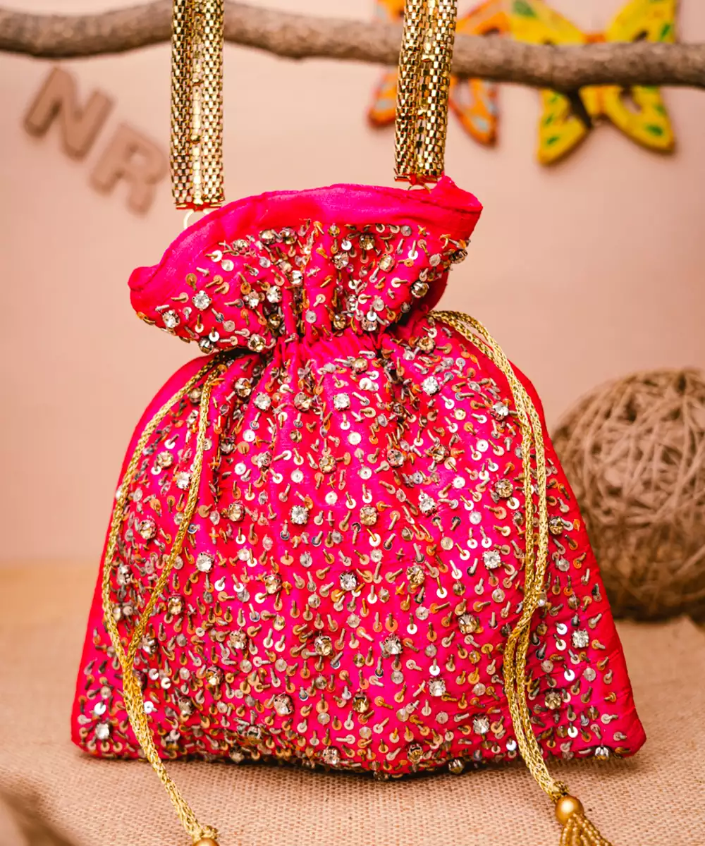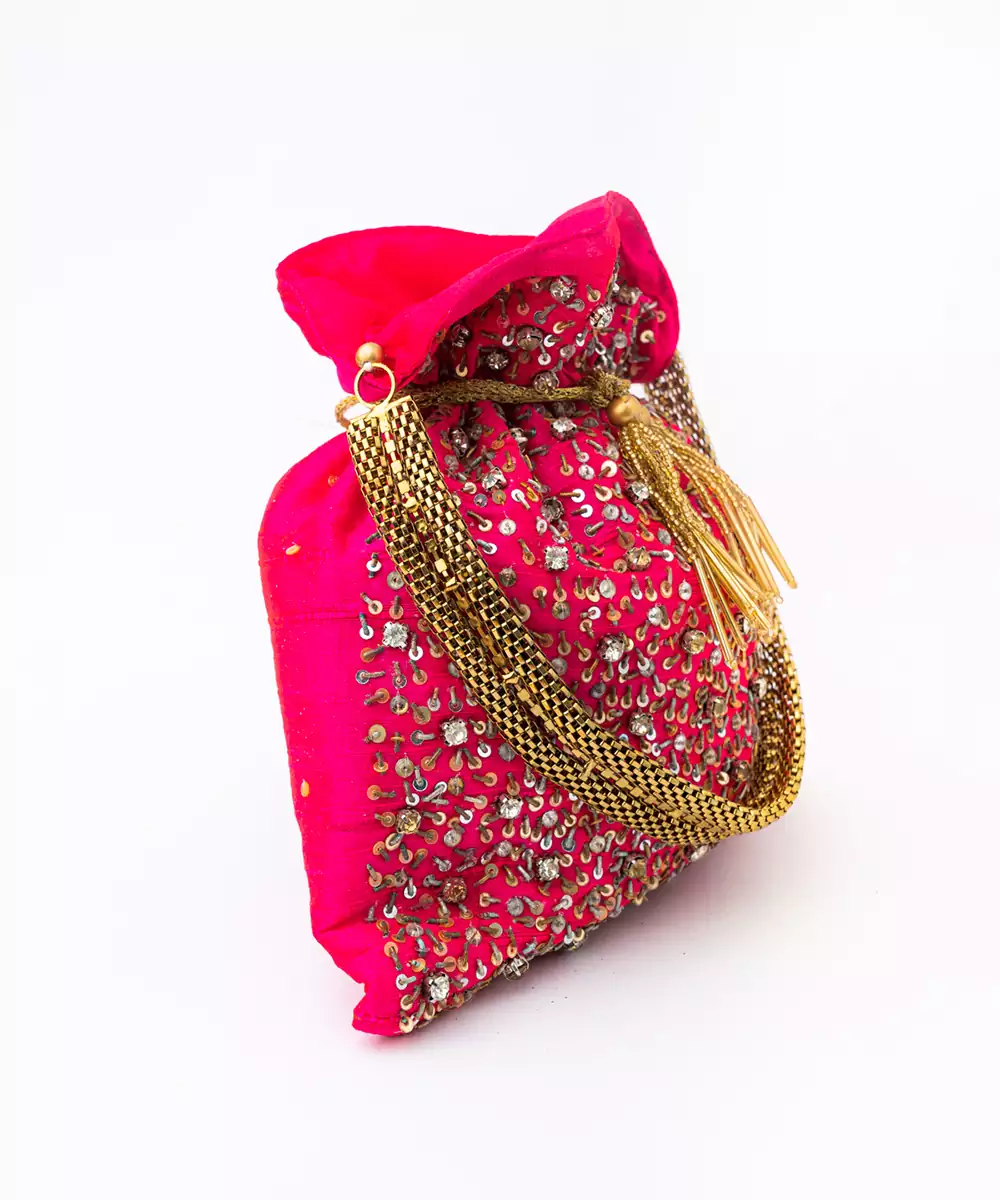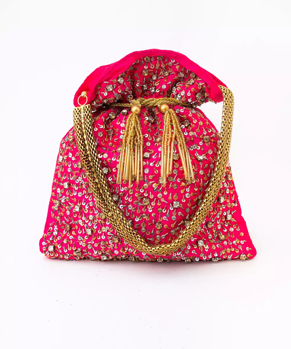Elegant Potli Silhouette With Intricate Pink And Gold Embroidery. Soft Silk Base With Shimmering Threadwork For A Regal Finish. Comes With A Shoulder Strap For Versatile Styling. One Main Compartment Secured With A Drawstring Closure. Style Note: Perfect For Bridal Trousseaus Or Festive Soirées—Pair With Pastel Lehengas Or Gold Toned Sarees For A Graceful Accent.