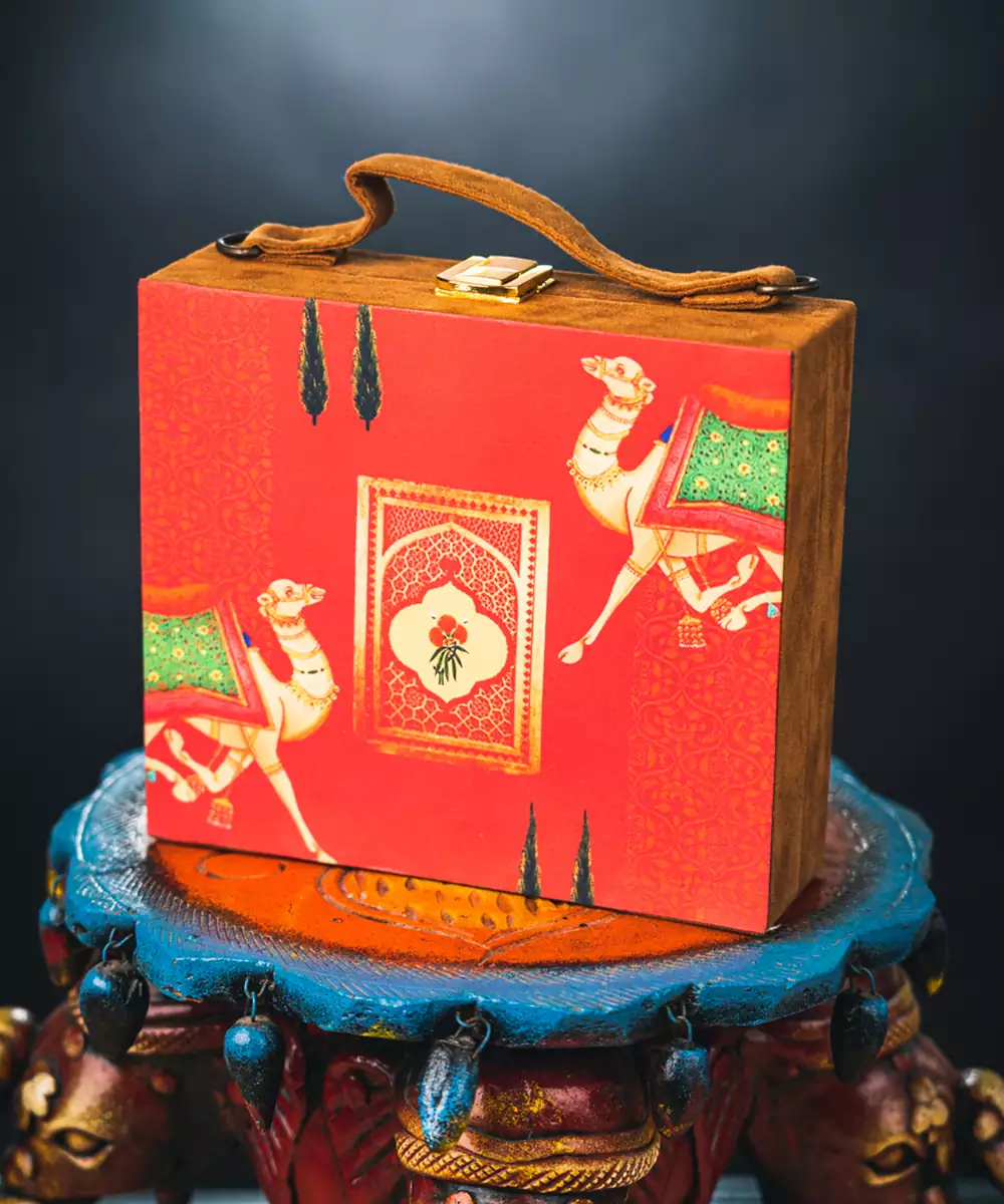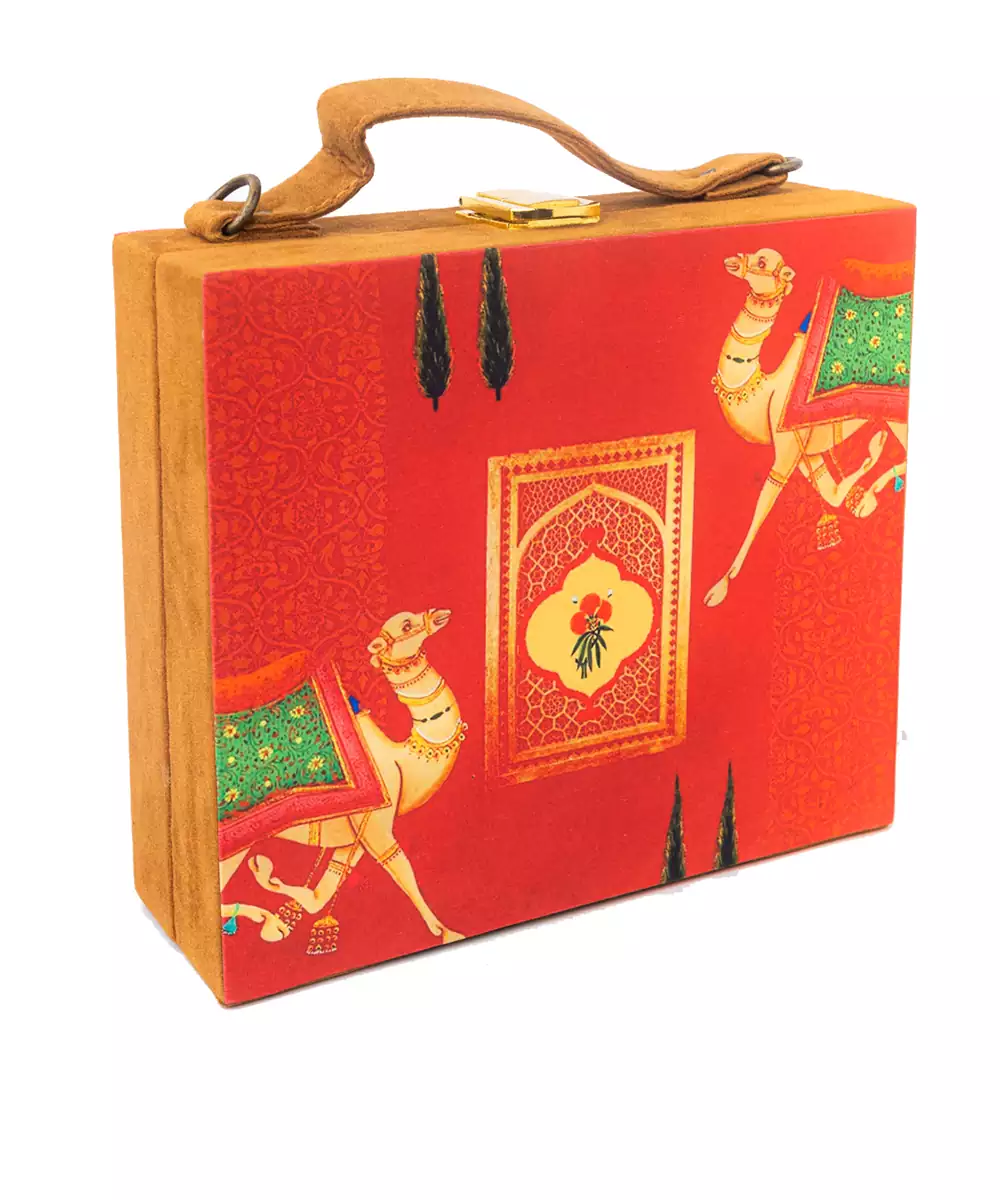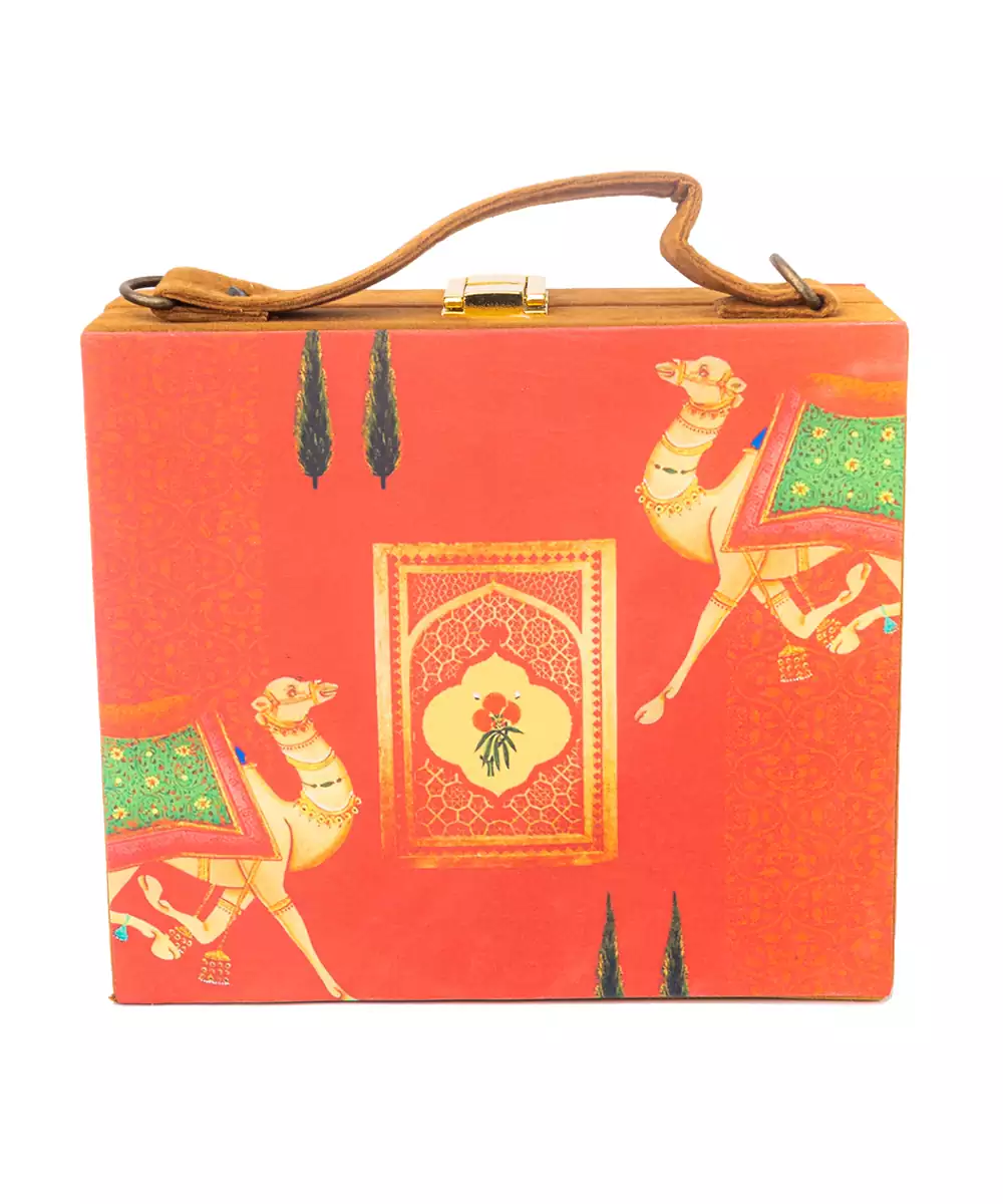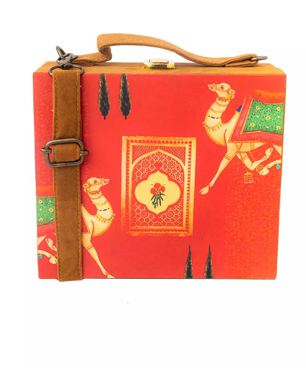 Printed In Lively Red And Yellow Tones With Quirky Camel Motifs. Structured Box Silhouette Lends Shape And Standout Charm. One Main Compartment Secured With A Click Closure For Safety. Shoulder Strap Allows Hands Free Comfort And Styling Ease. A Fun, Festive Accessory Ideal For Travel Edits Or Ethnic Events.