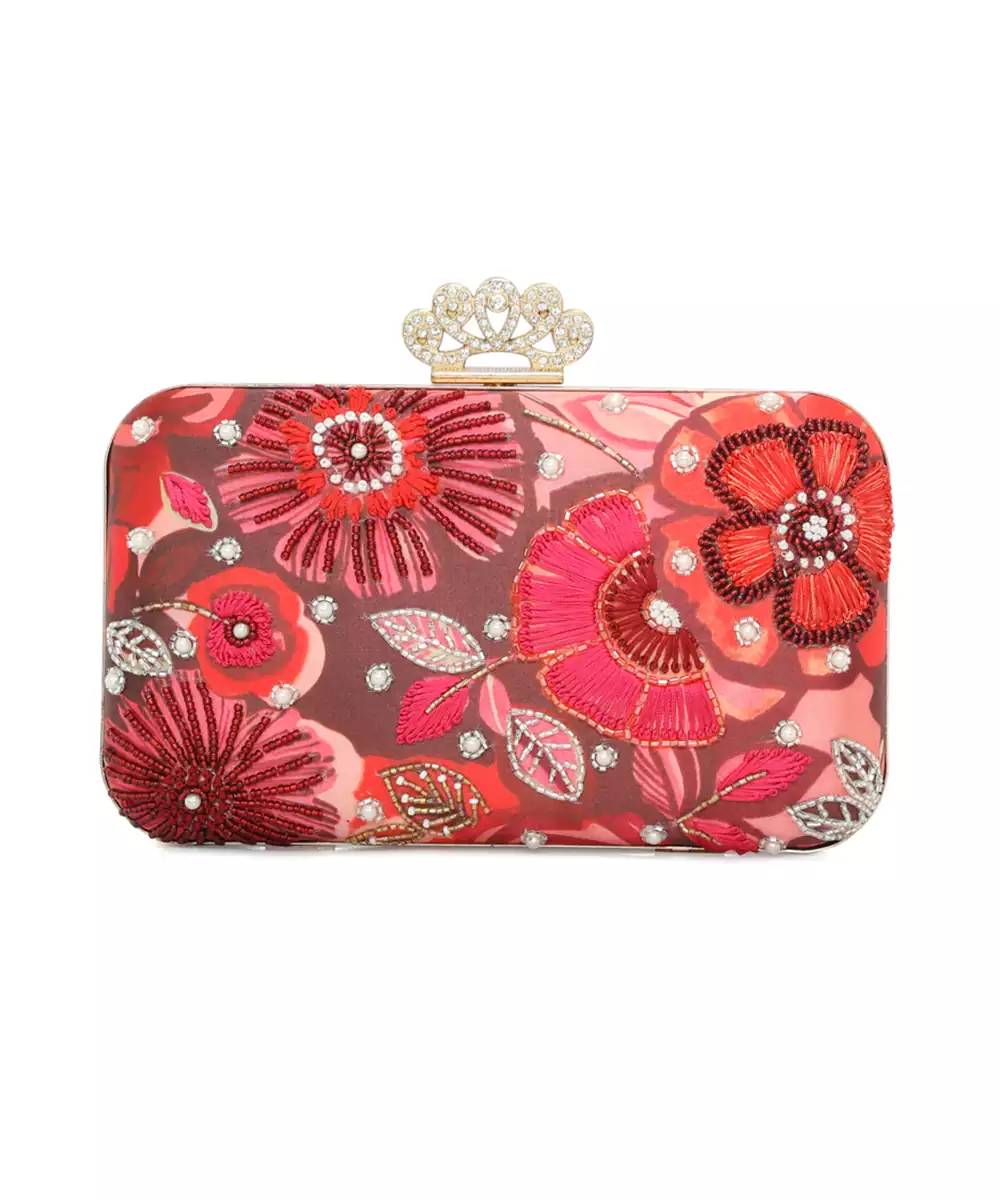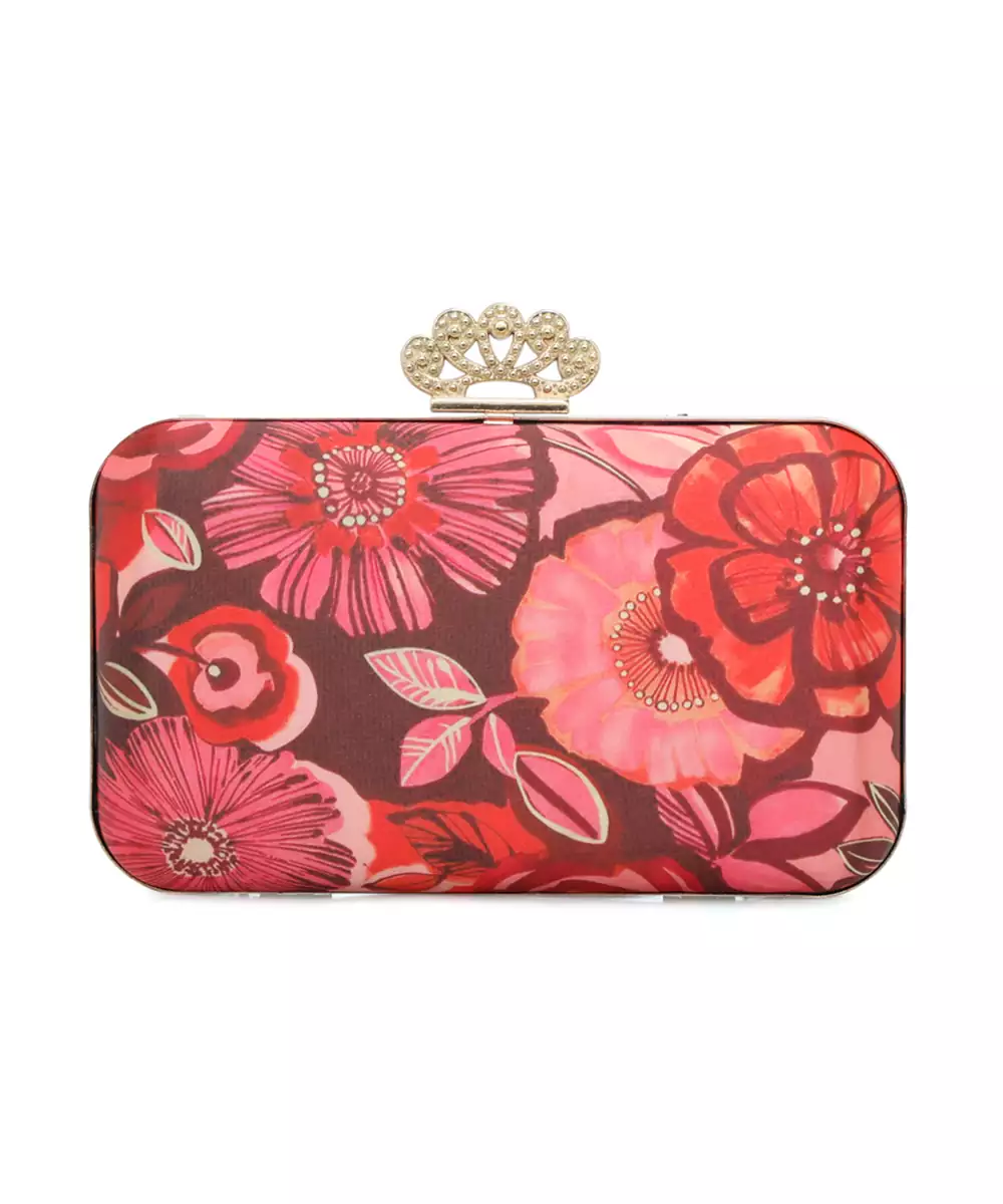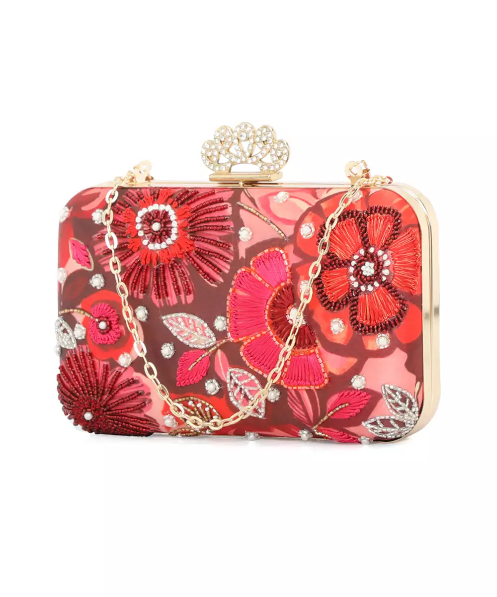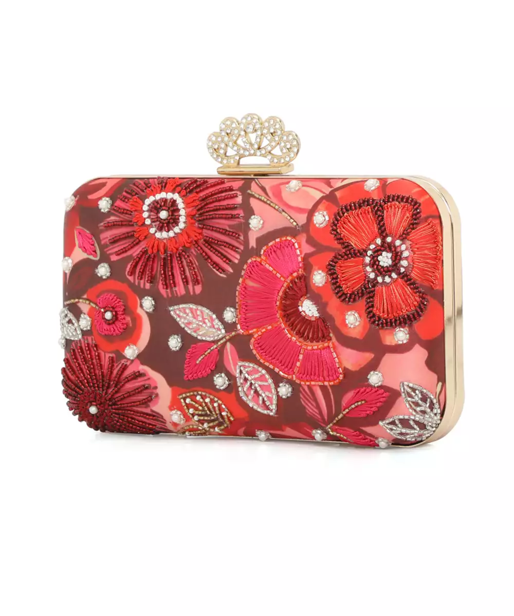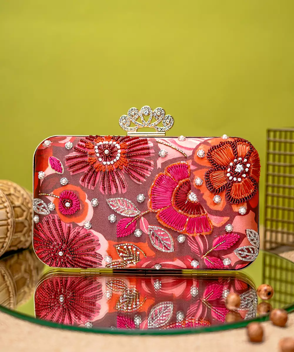 Red Toned Box Clutch With Floral Print And Artisanal Beaded Embroidery. Detachable Shoulder Strap Offers Styling Versatility. Twist Lock Closure Keeps Essentials Tucked In Securely. Bold And Elegant—Perfect For Evening Functions And Festive Gatherings. Style Note: Style With Embroidered Lehengas Or Solid Ethnic Wear For High Impact Glamour.