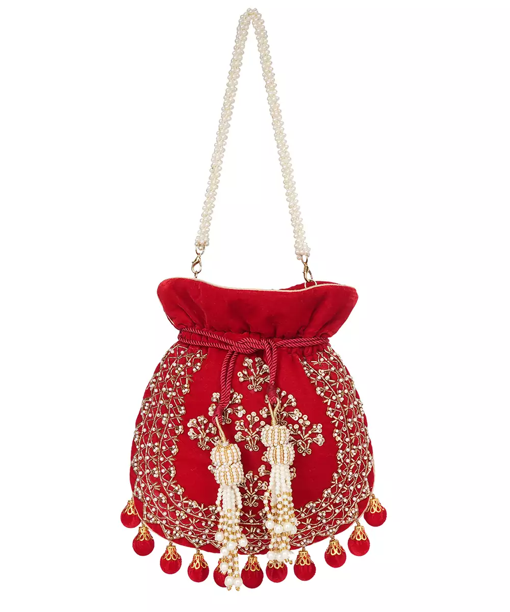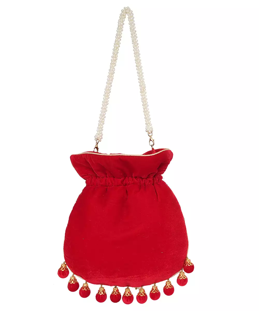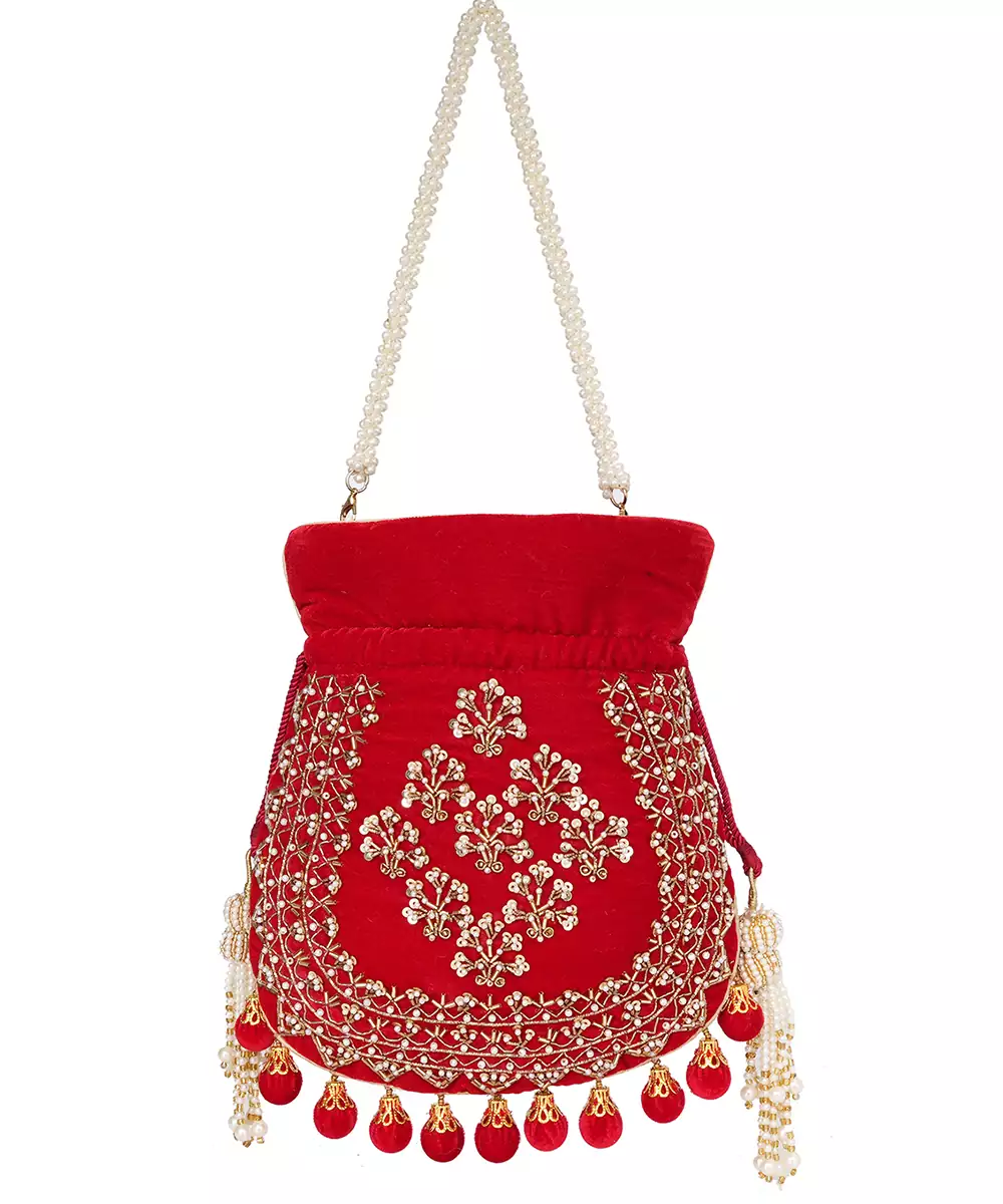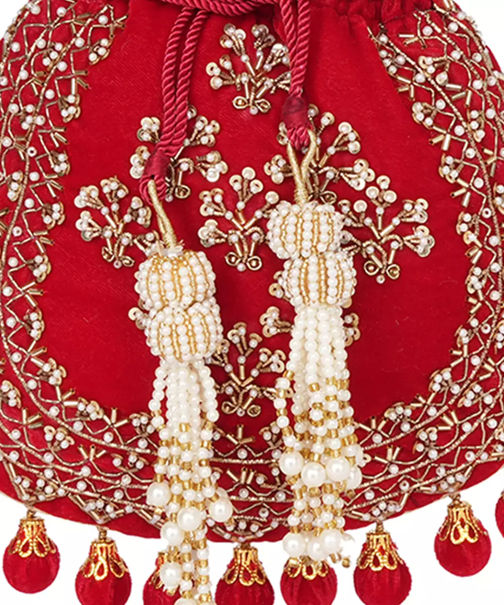 Vibrant Red Potli Clutch Detailed With Rich Gold Embellishments For A Statement Making Festive Touch. Comes With One Spacious Compartment And Traditional Drawstring Closure. Wrist Loop Adds Poise And Convenience For Seamless Styling. Perfect For Karwa Chauth, Weddings, Or Gift Boxes For Bridal Edits. Style Note: Team It With Gold Zari Work Outfits Or Earthy Tones To Amplify The Clutch’s...