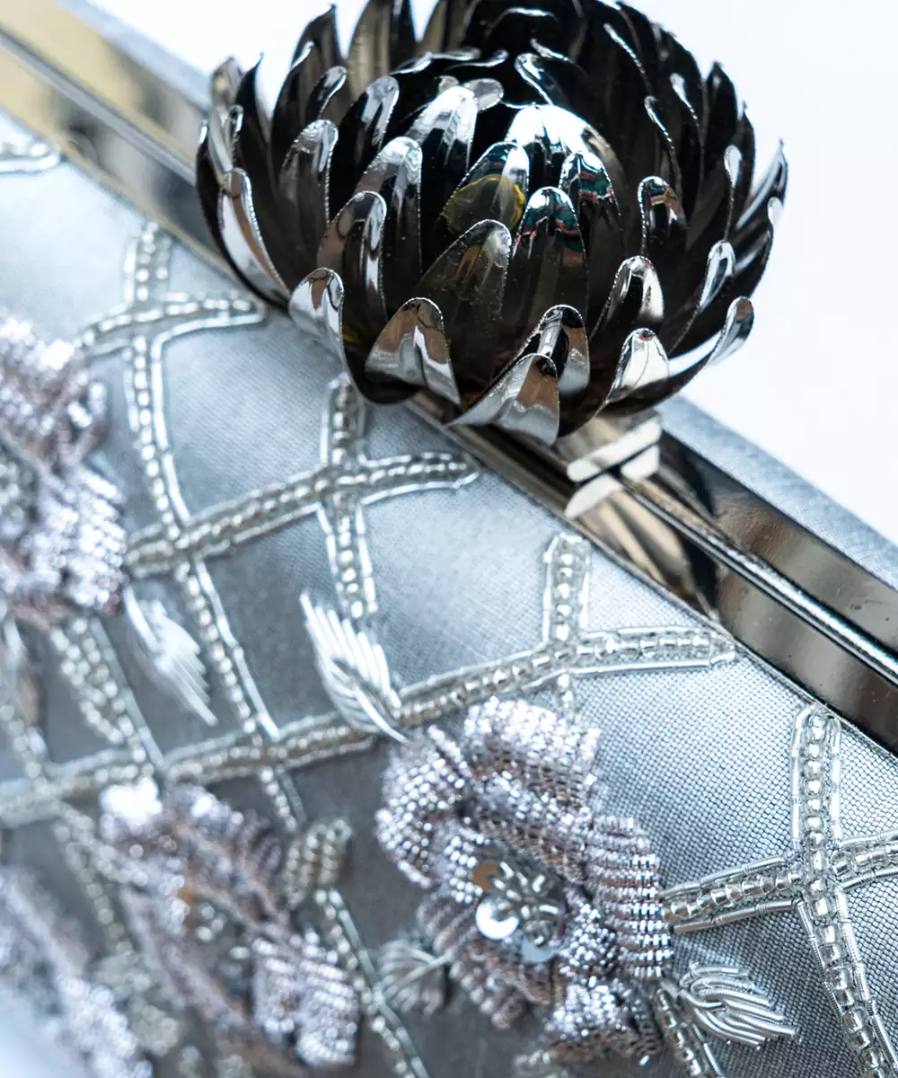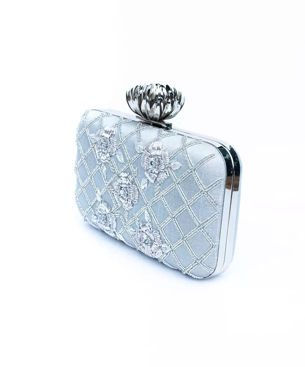 Features Intricate Hand Embroidery In Shimmering Silver Tones For A Graceful, Sophisticated Look. Crafted In An Elegant Silhouette Ideal For Both Traditional And Contemporary Styling. Includes One Main Compartment Secured With A Twist Closure For Safe And Stylish Access. Designed Exclusively For Women Seeking Artisanal Charm And Festive Finesse. A Refined Pick For Weddings, Cocktail Events, Or...