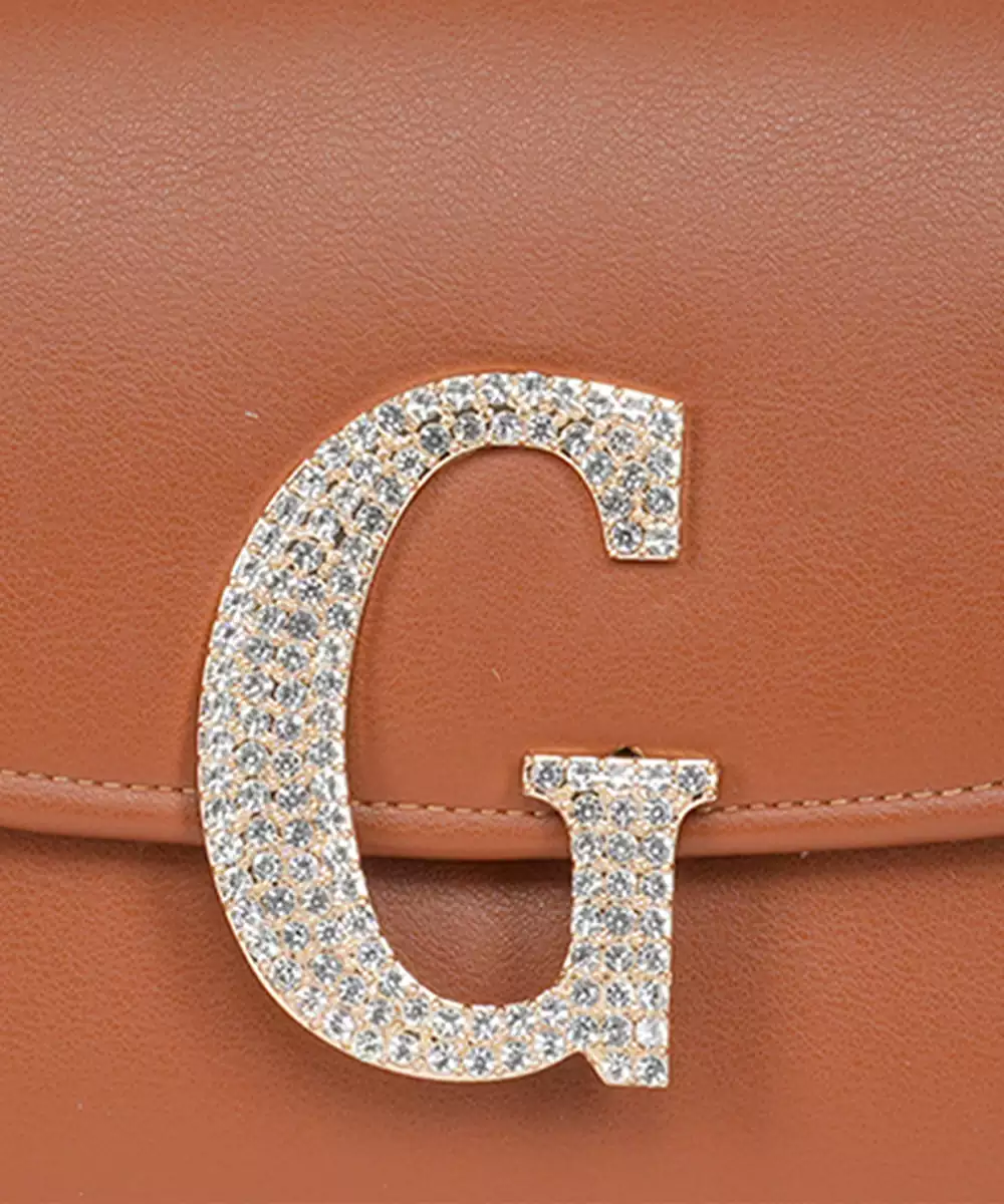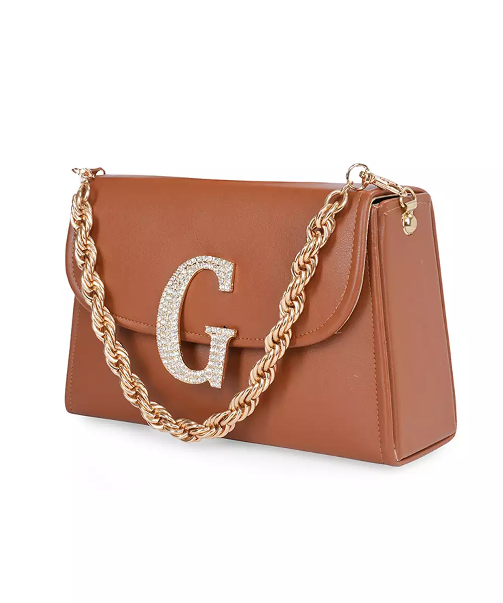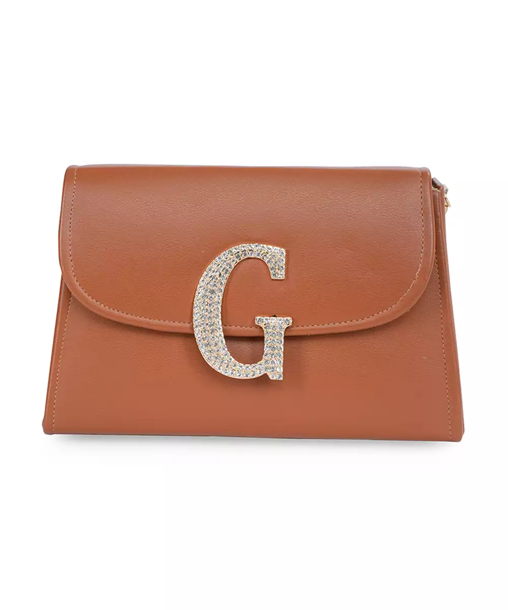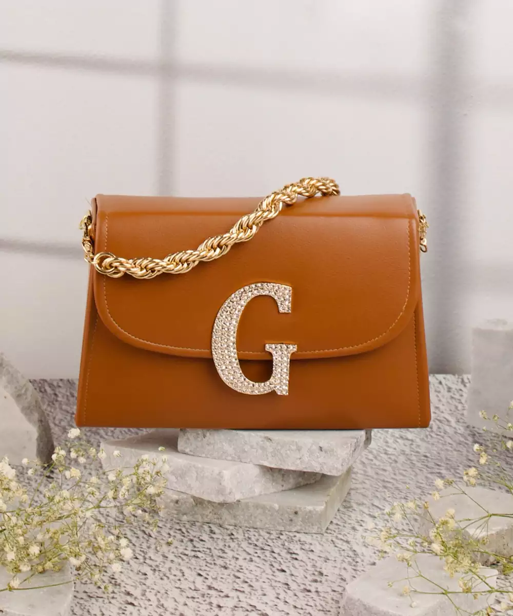 Embellished In Rich Tan And Gold Tones For A Luxe, Occasion Ready Aesthetic. Highlighted With A Bold Alphabet ‘G’ Motif On The Front For A Unique Personalized Touch. Structured Box Silhouette Features A Secure Button Closure For Convenience And Style. Comes With A Shoulder Strap For Hands Free Ease And Versatile Wear. A Refined Accessory Ideal For Festive Events, Personalized Gifting, Or...