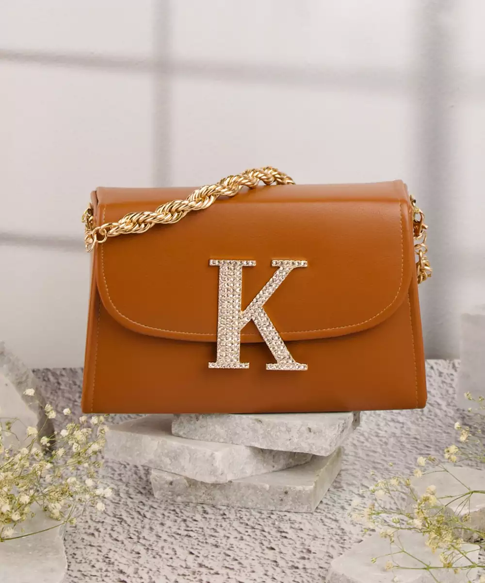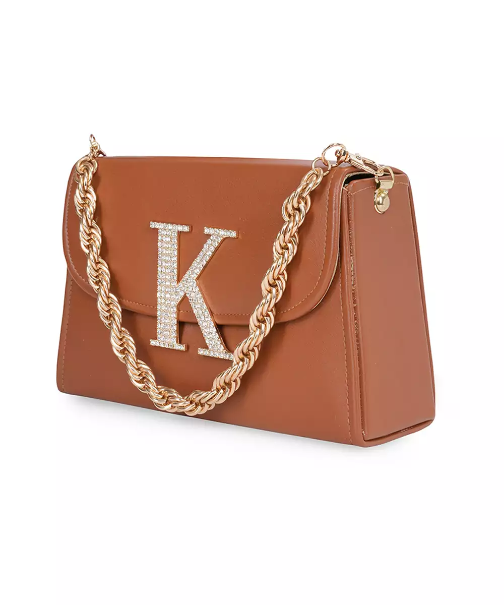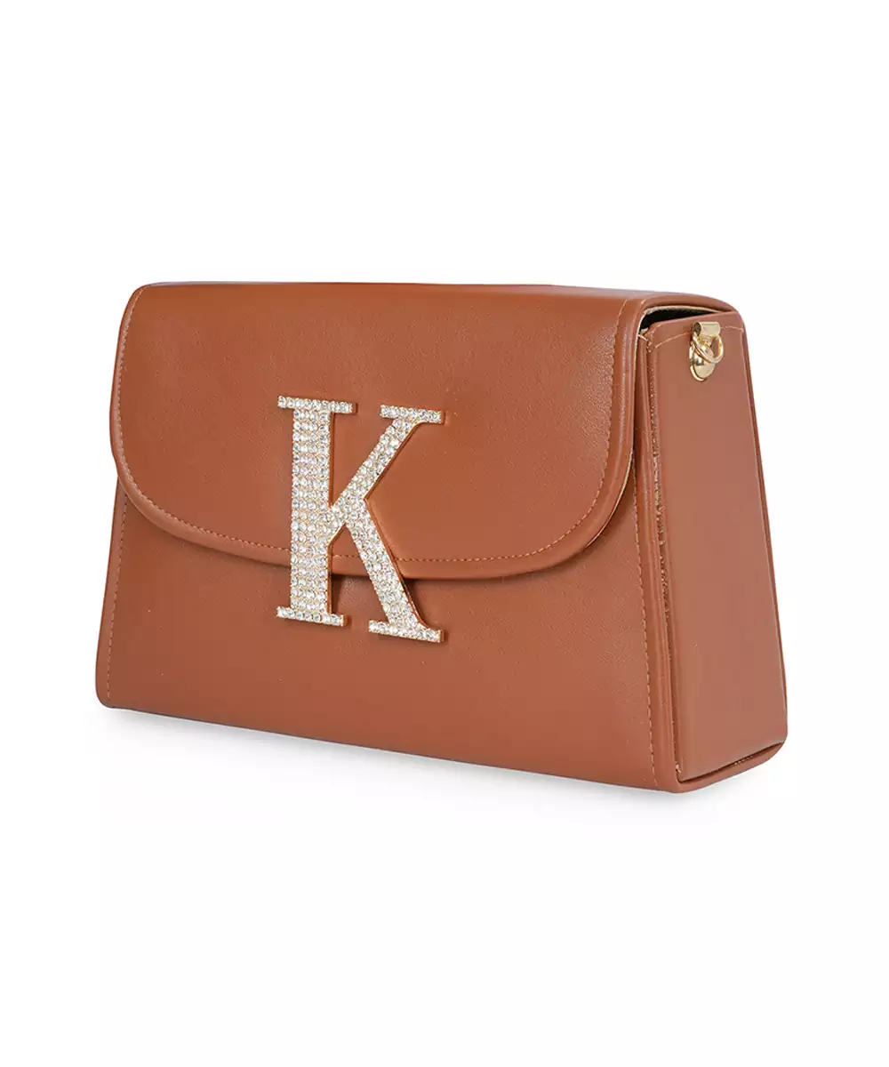 Embellished In Rich Tan And Gold Tones For A Luxe, Occasion Ready Aesthetic. Highlighted With A Bold Alphabet ‘K’ Motif On The Front For A Unique Personalized Touch. Structured Box Silhouette Features A Secure Button Closure For Convenience And Style. Comes With A Shoulder Strap For Hands Free Ease And Versatile Wear. A Refined Accessory Ideal For Festive Events, Personalized Gifting, Or...