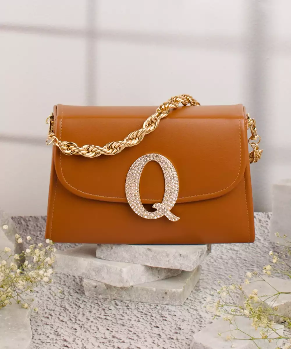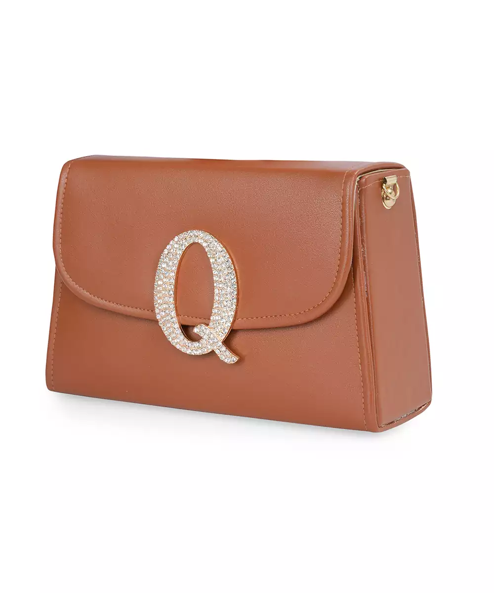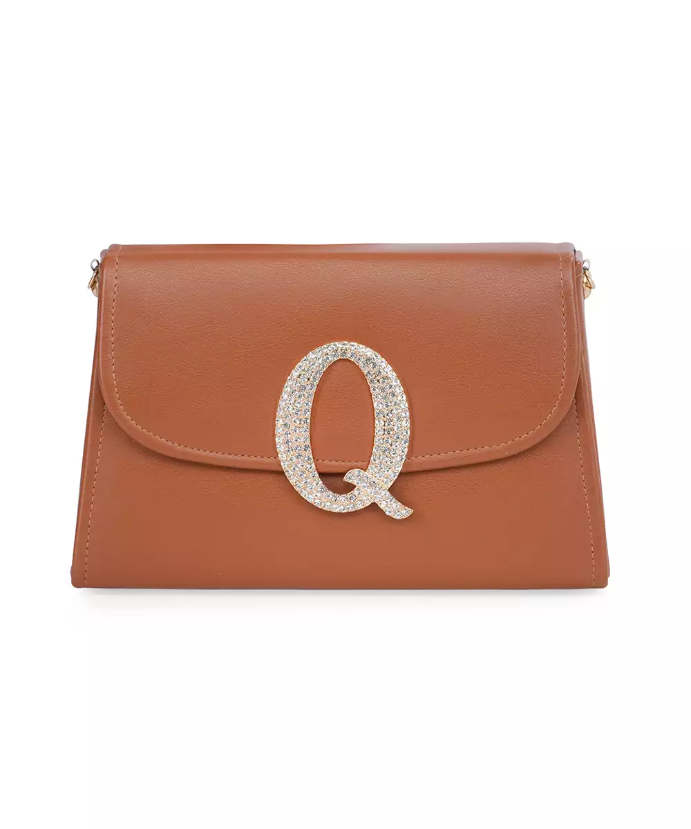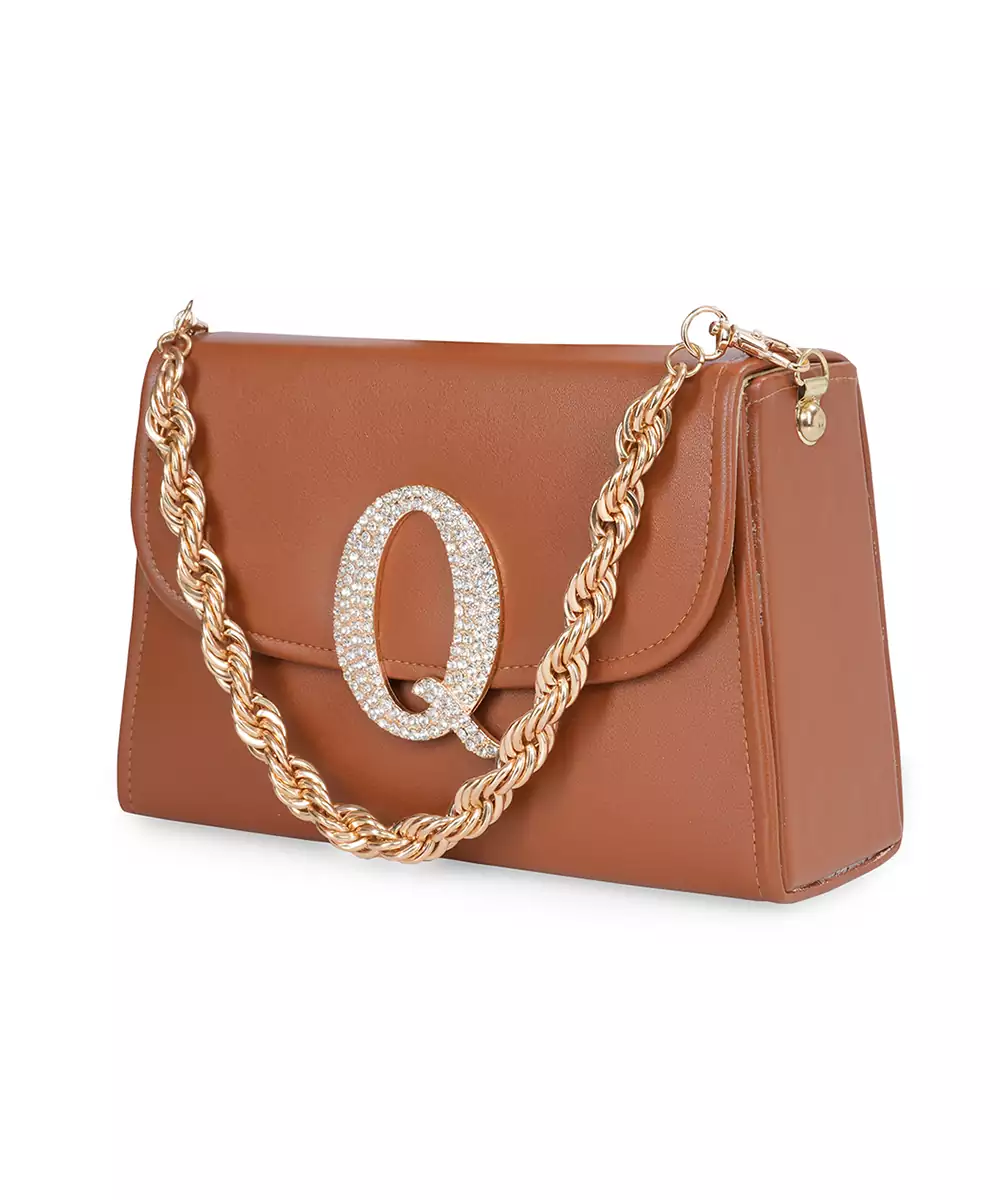 Embellished In Rich Tan And Gold Tones For A Luxe, Occasion Ready Aesthetic. Highlighted With A Bold Alphabet ‘Q’ Motif On The Front For A Unique Personalized Touch. Structured Box Silhouette Features A Secure Button Closure For Convenience And Style. Comes With A Shoulder Strap For Hands Free Ease And Versatile Wear. A Refined Accessory Ideal For Festive Events, Personalized Gifting, Or...