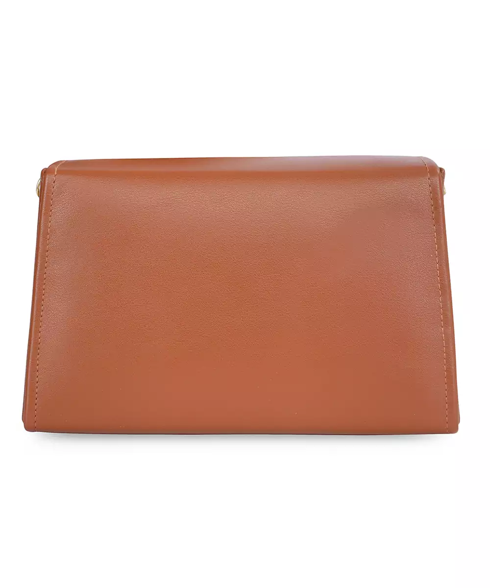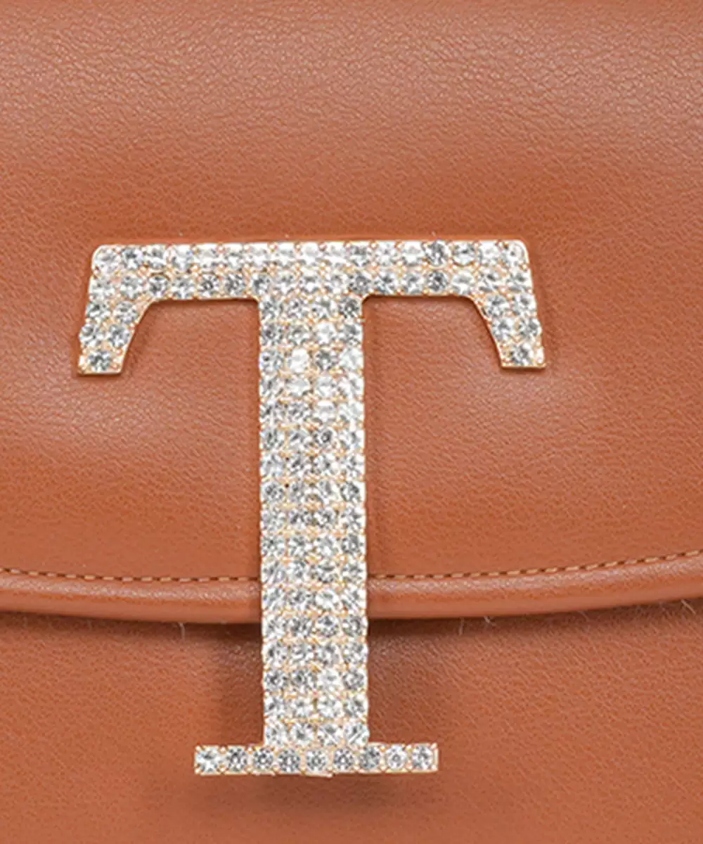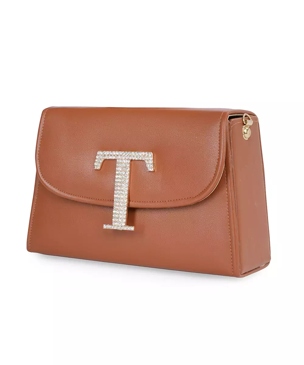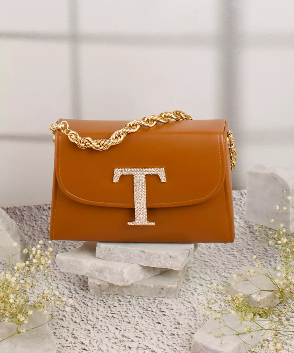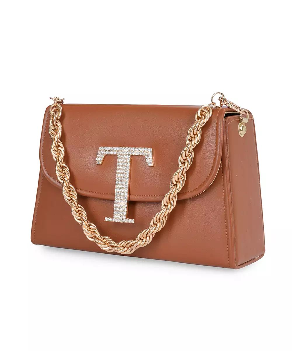 Embellished In Rich Tan And Gold Tones For A Luxe, Occasion Ready Aesthetic. Highlighted With A Bold Alphabet ‘T’ Motif On The Front For A Unique Personalized Touch. Structured Box Silhouette Features A Secure Button Closure For Convenience And Style. Comes With A Shoulder Strap For Hands Free Ease And Versatile Wear. A Refined Accessory Ideal For Festive Events, Personalized Gifting, Or...