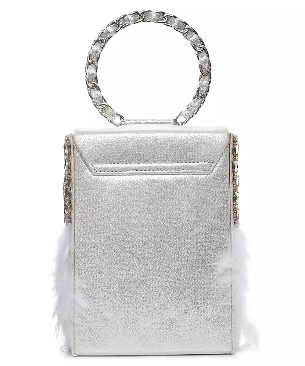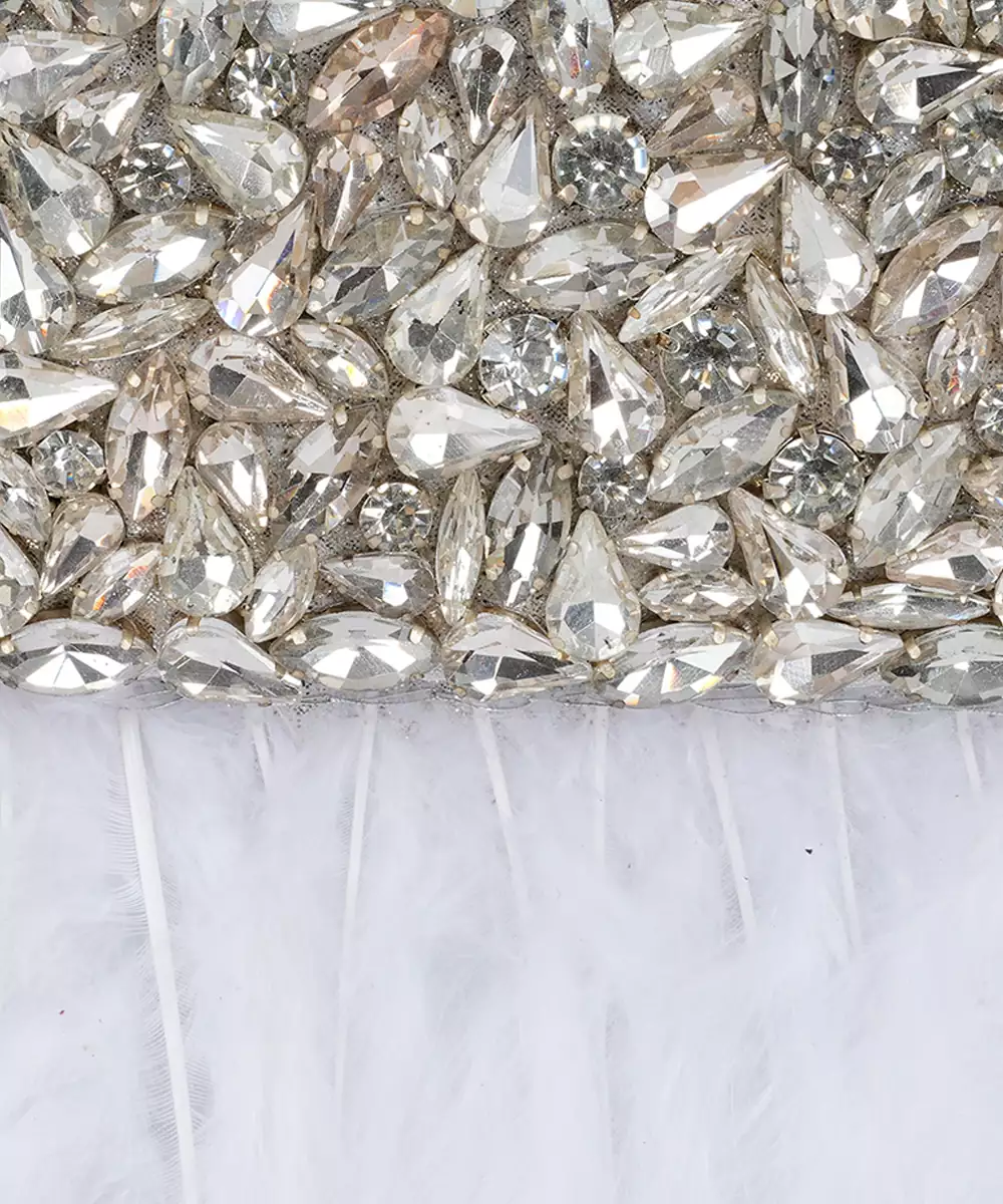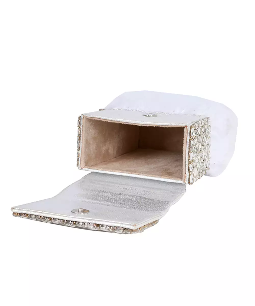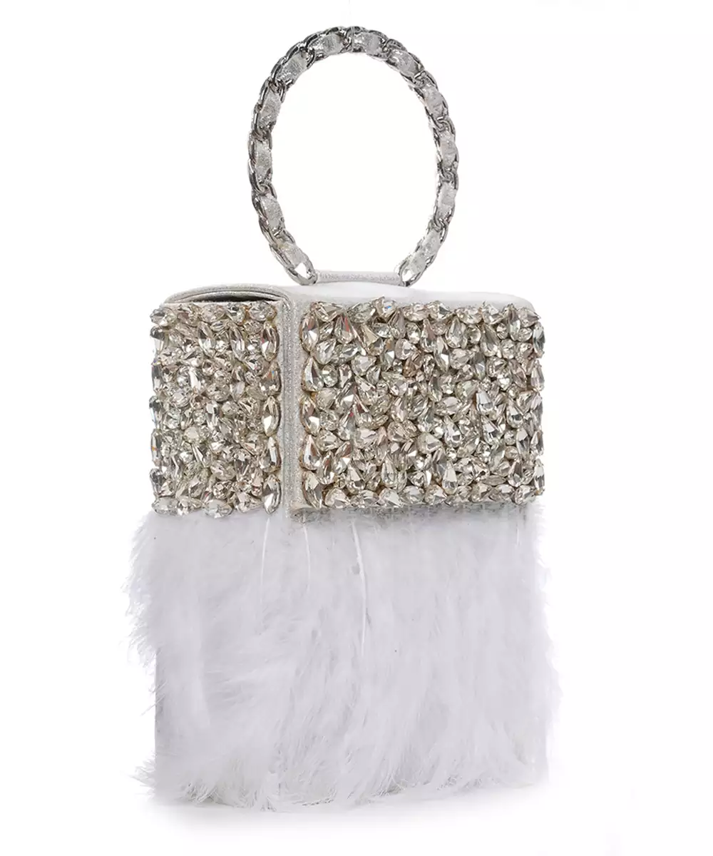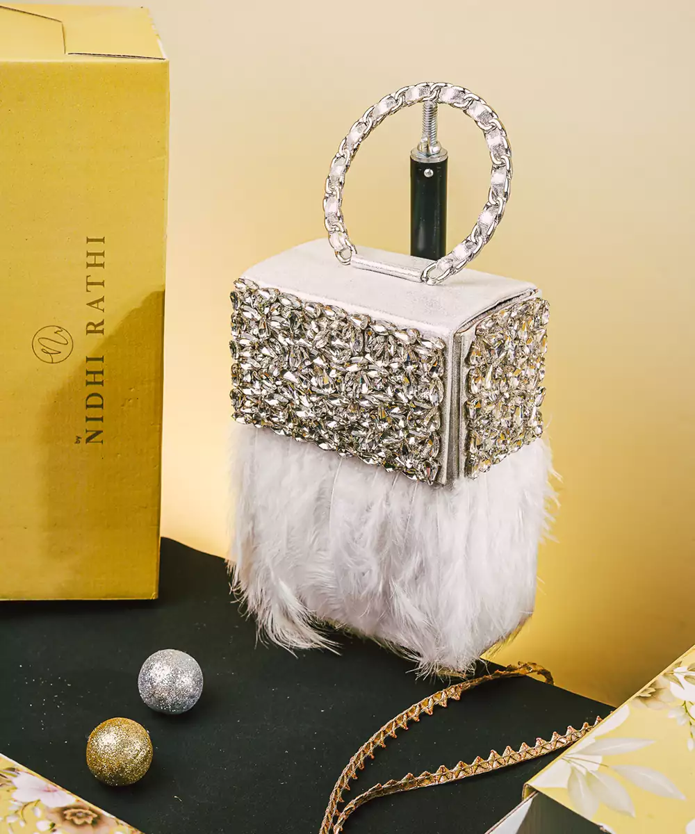 Box Clutch In Crisp White, Detailed With Soft Feathers And Shimmering Diamond Embellishments. Features A Sleek Round Wrist Loop For Graceful Handling. Click Lock Closure Keeps Essentials Secure In The Spacious Compartment. Ethereal And Luxurious—Ideal For Bridal Affairs, Evening Galas, Or Festive Elegance. Style Note: Style With Pearl Studded Ensembles Or Pastel Lehengas To Let The Clutch’s...