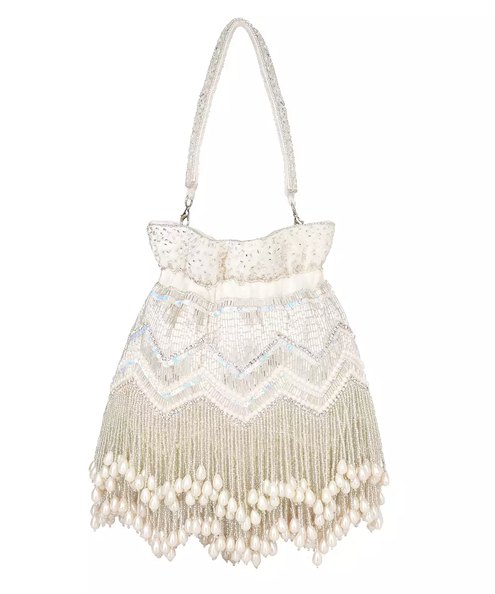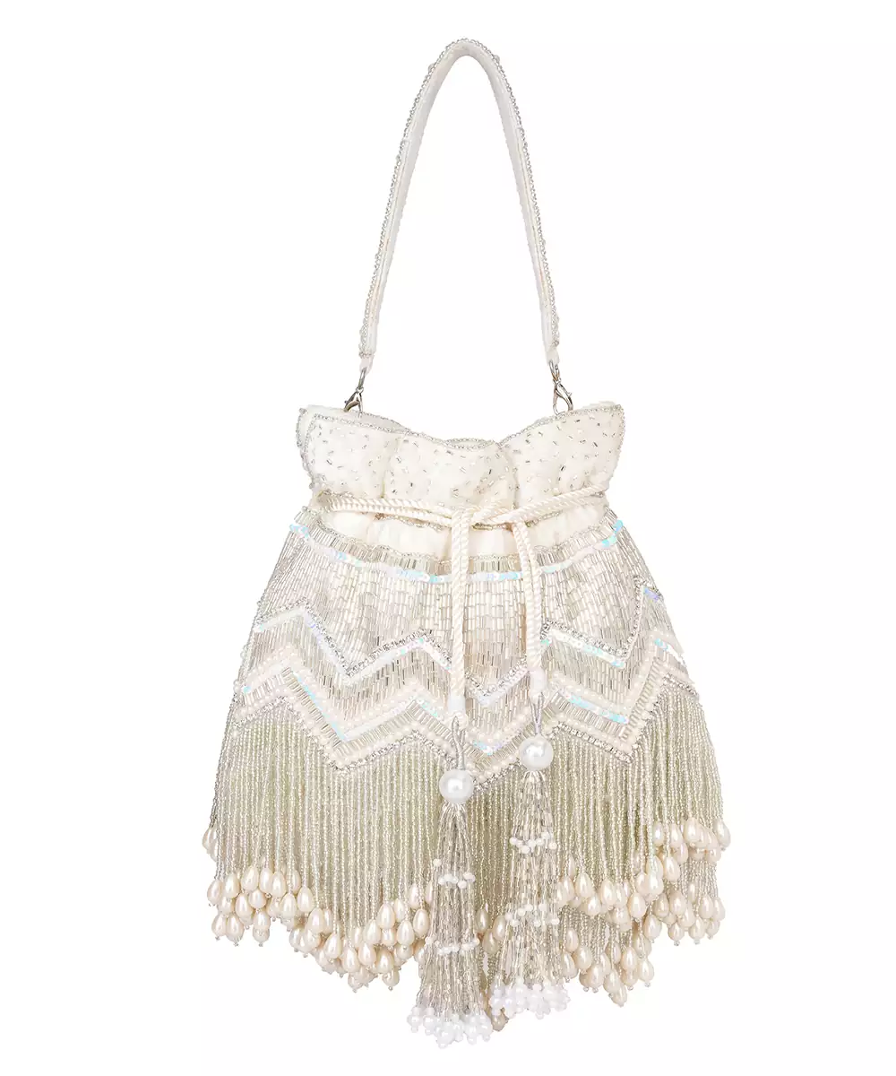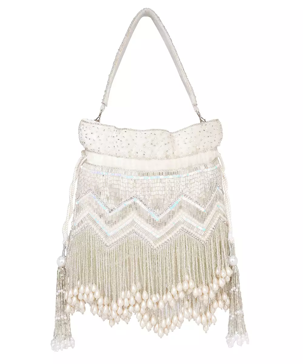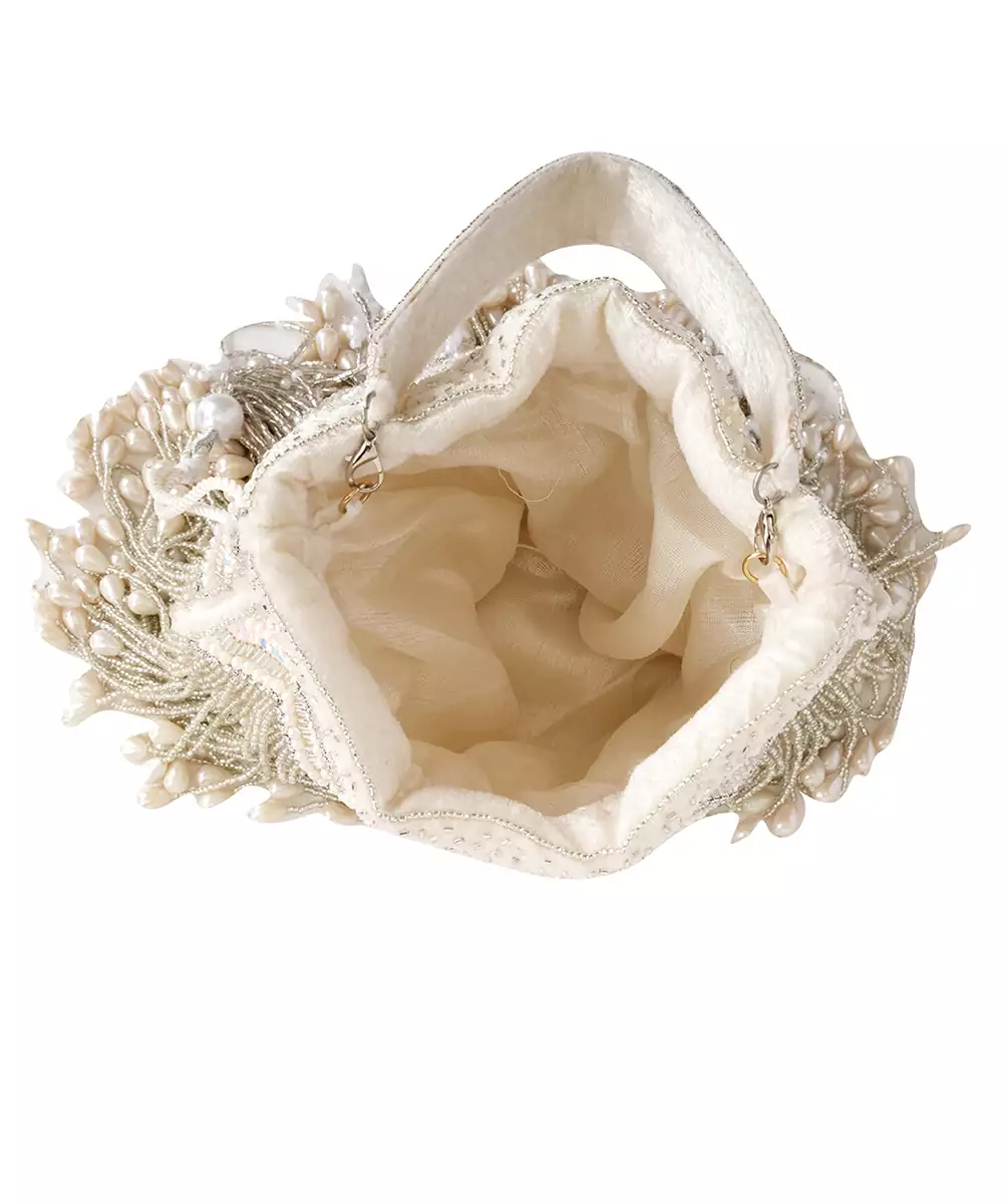 Elegant White Potli Clutch Adorned With Shimmering Silver Toned Embellishments For A Modern Regal Vibe. Secured With Traditional Drawstring Closure And One Spacious Compartment For Essentials. Wrist Loop Ensures Graceful, Hands Free Styling During Festive Outings. Ideal For Weddings, Pujas, Or Bridesmaid Gifting. Style Note: Pair With Icy Pastel Lehengas Or Silver Accented Sarees To Create A...