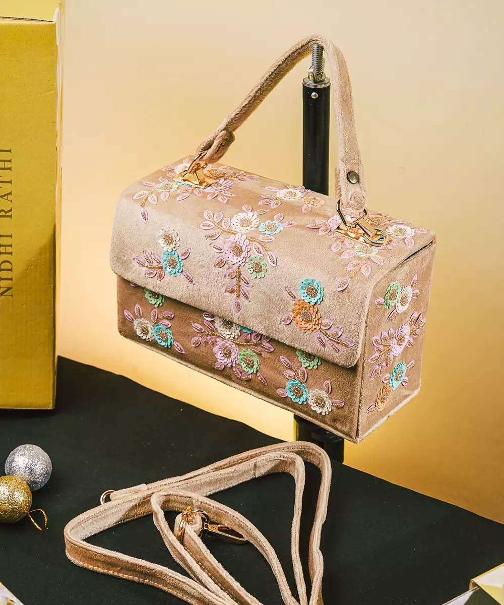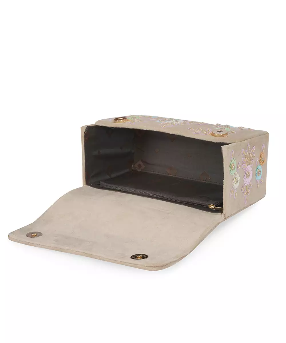 Foldover Clutch In Cream Base With Intricate Multicolored Embroidery For Festive Flair. Comes With A Detachable Shoulder Strap For Versatile, Hands Free Styling. Button Closure Secures Essentials Inside The Roomy Main Compartment. Light Yet Statement Making—Perfect For Weddings, Mehendi Events, Or Festive Brunches. Style Note: Pair With Multihued Lehengas Or Pastel Sarees To Accentuate The...
